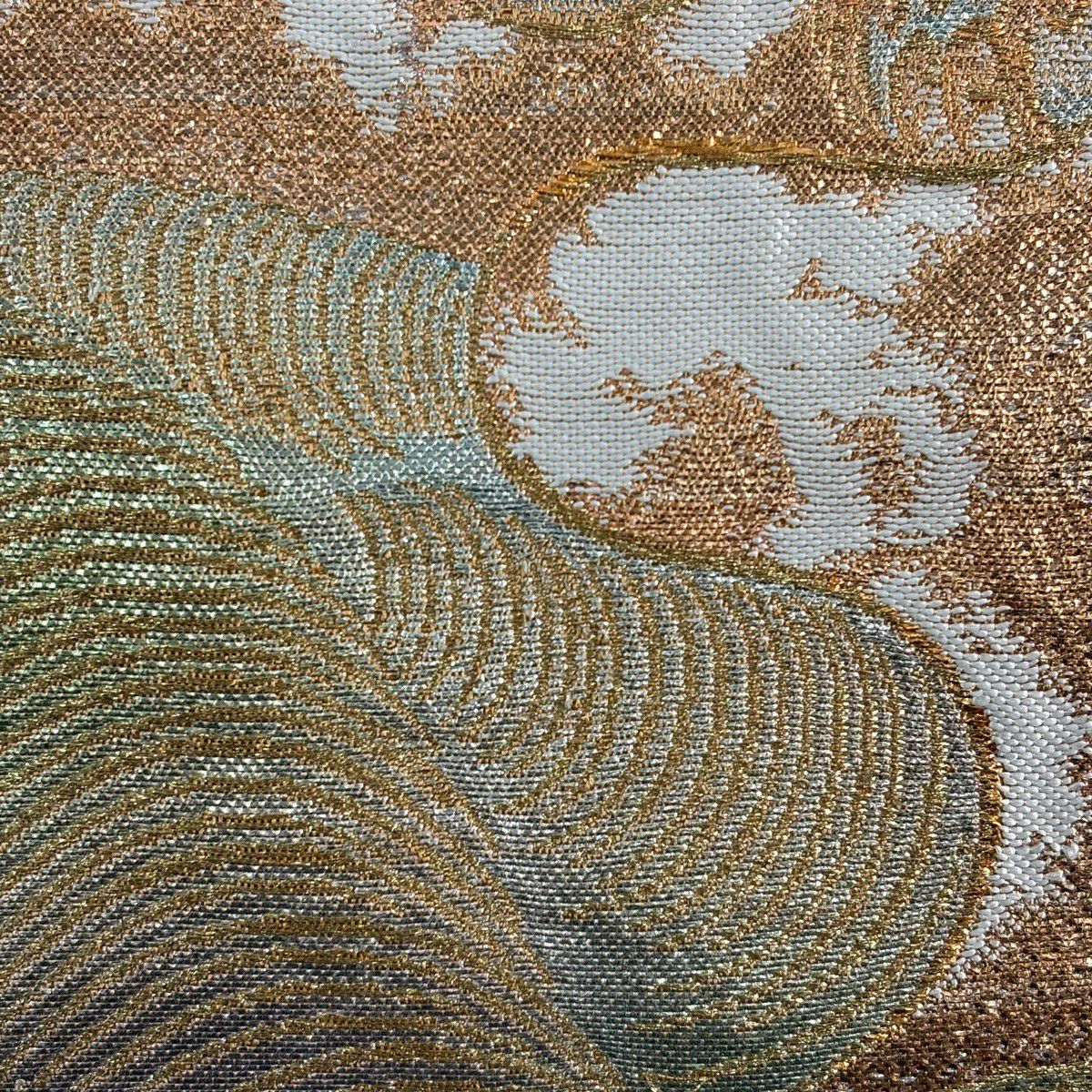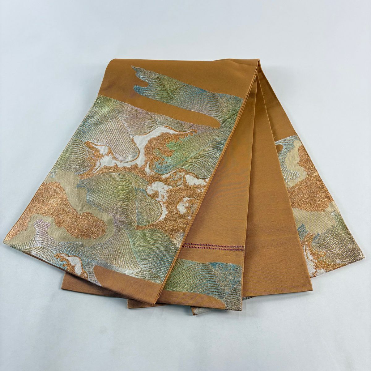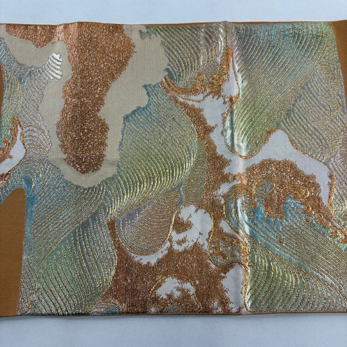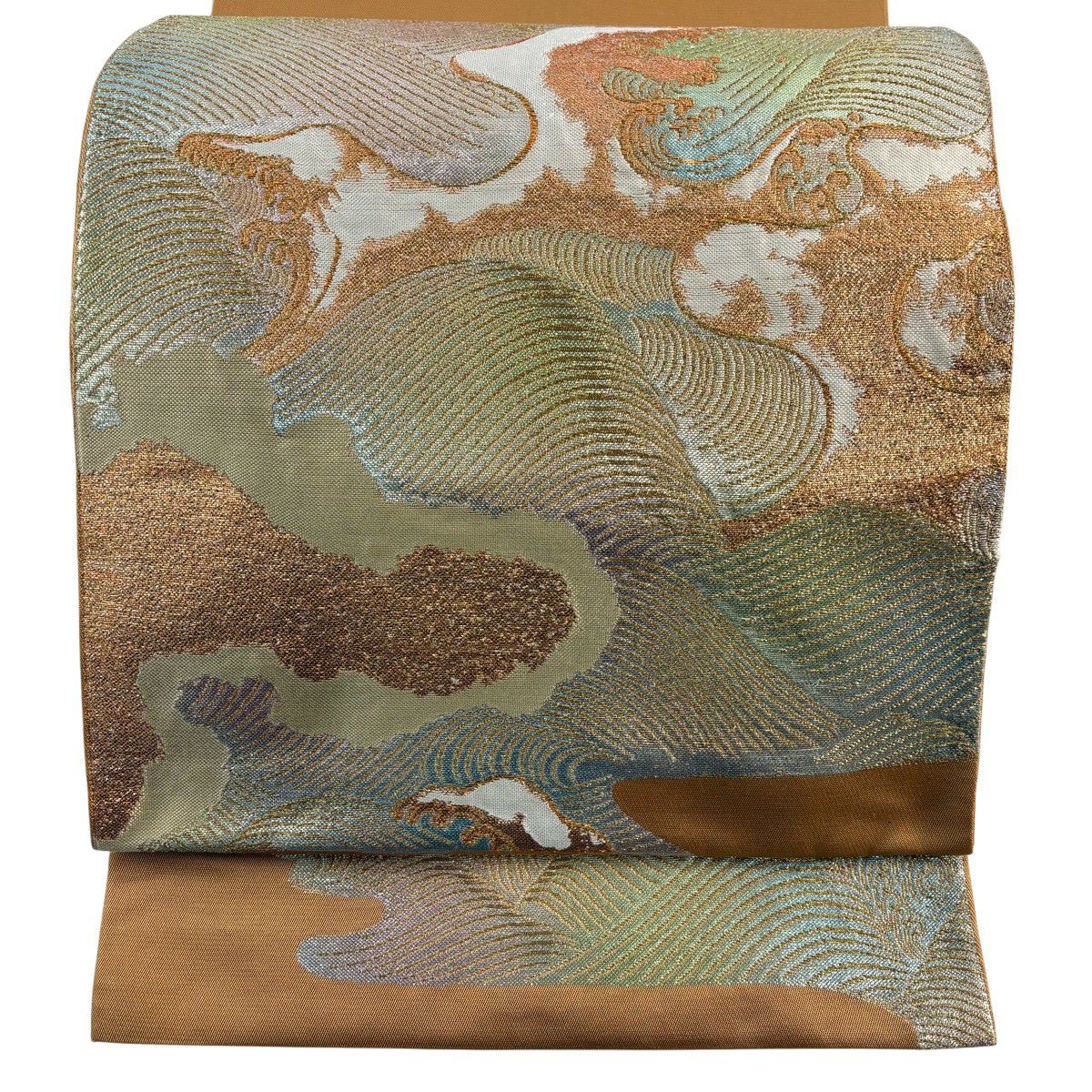 袋帯 逸品 龍村美術織物 落款あり 彩流波濤文 霞 金糸 箔 薄茶色 お太鼓柄 正絹