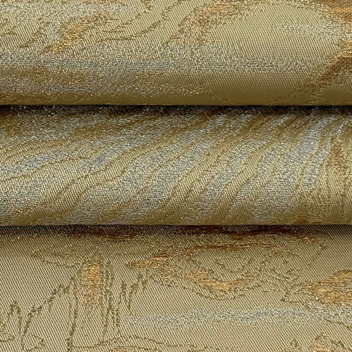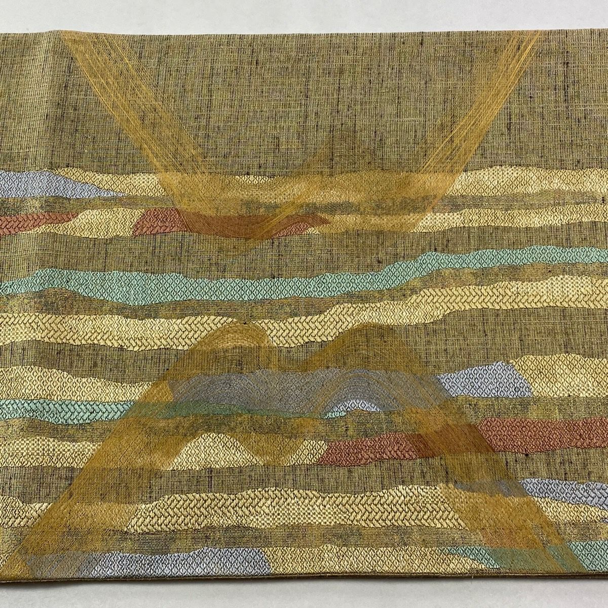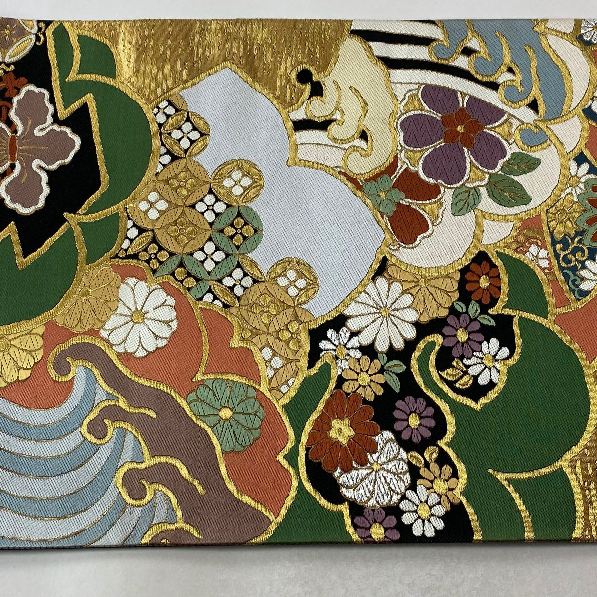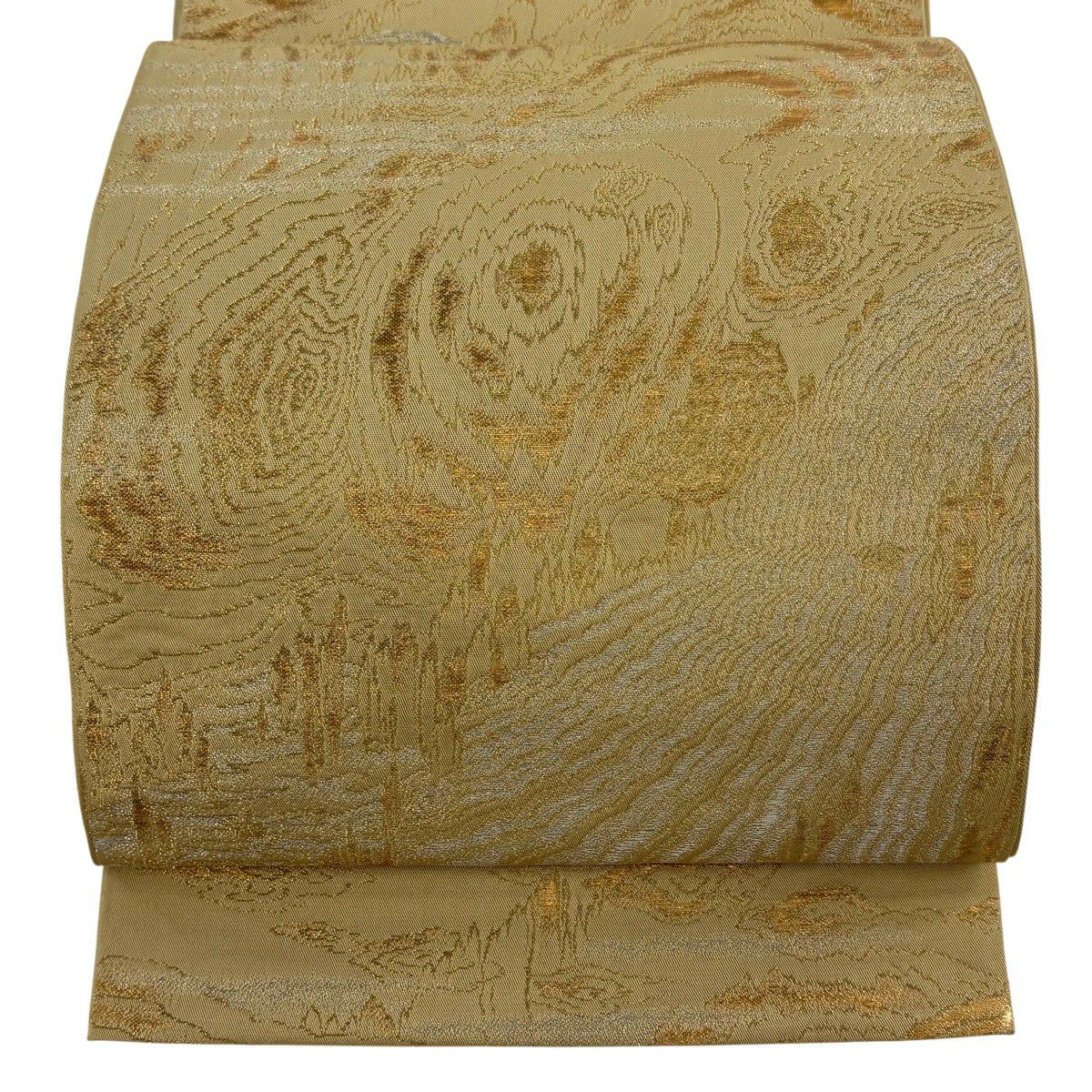 袋帯 逸品 龍村美術織物 落款あり 彩流波濤文 霞 金糸 箔 薄茶色 お太鼓柄 正絹