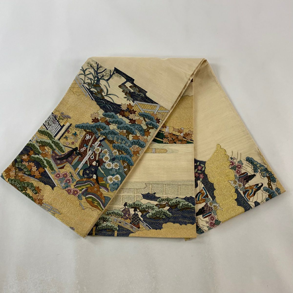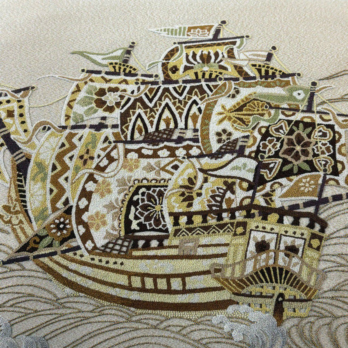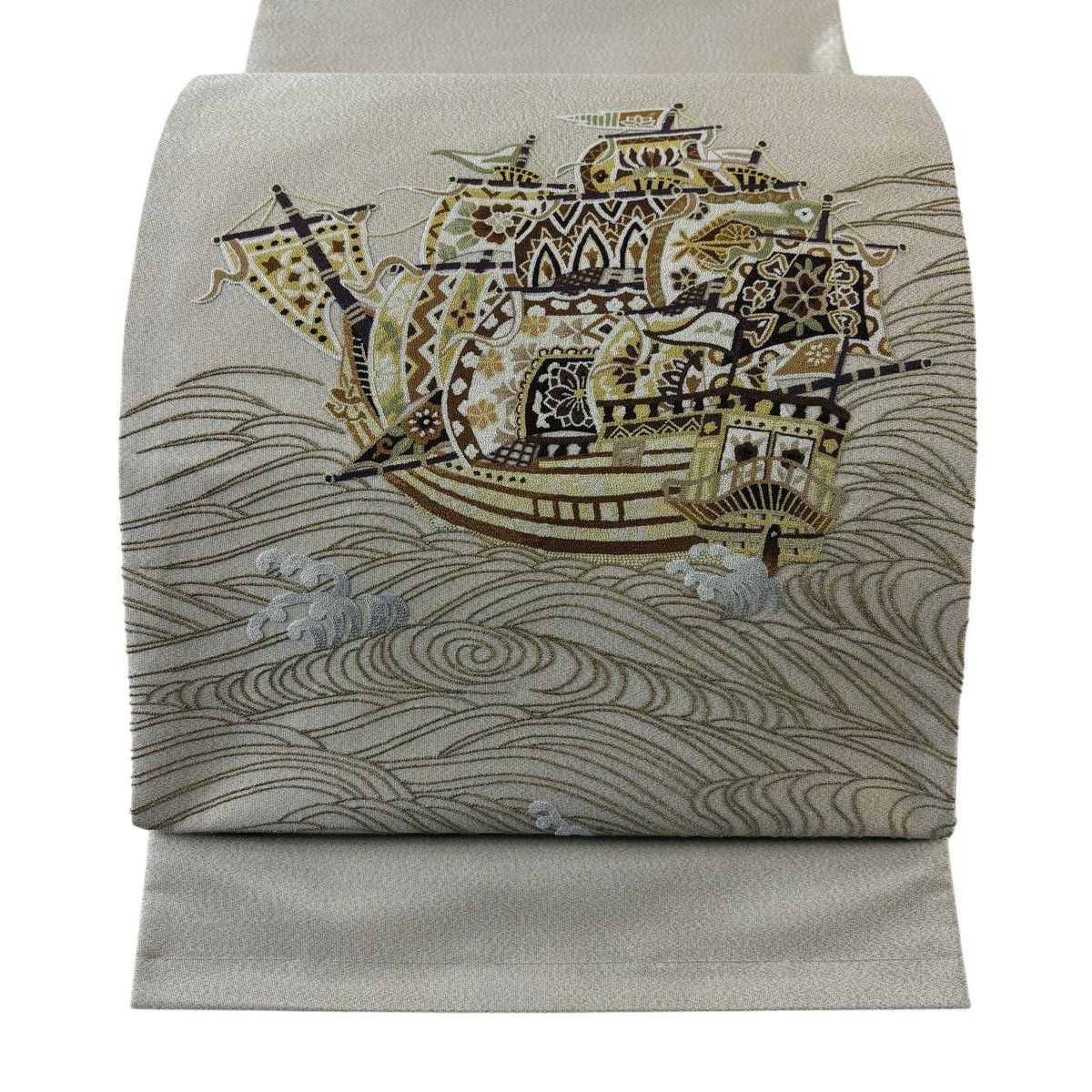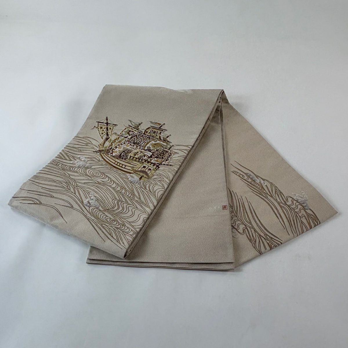 袋帯 逸品 蒋雪英 落款あり 帆船 波 相良刺繍 金糸 ベージュ お太鼓柄 正絹
