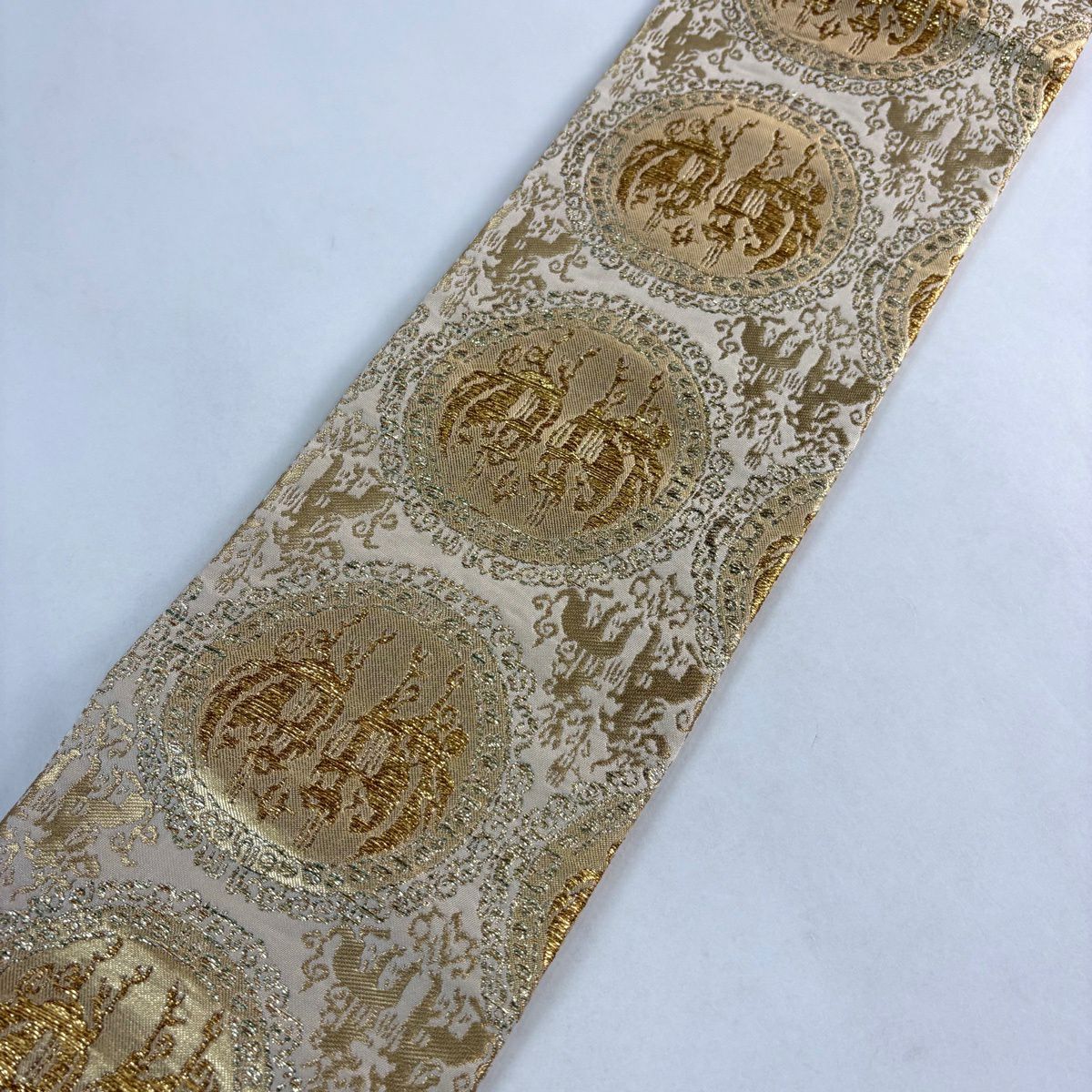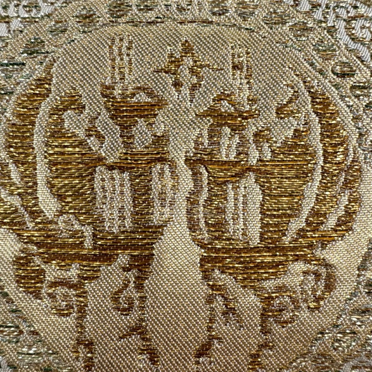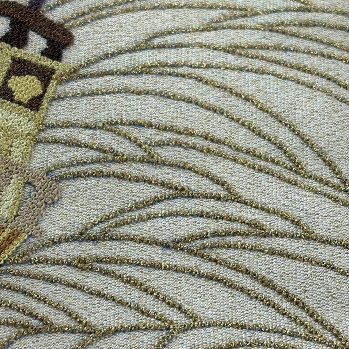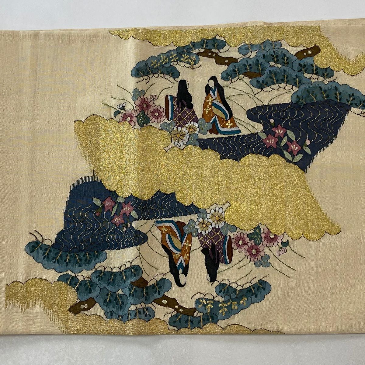 袋帯 逸品 蒋雪英 落款あり 帆船 波 相良刺繍 金糸 ベージュ お太鼓柄 正絹