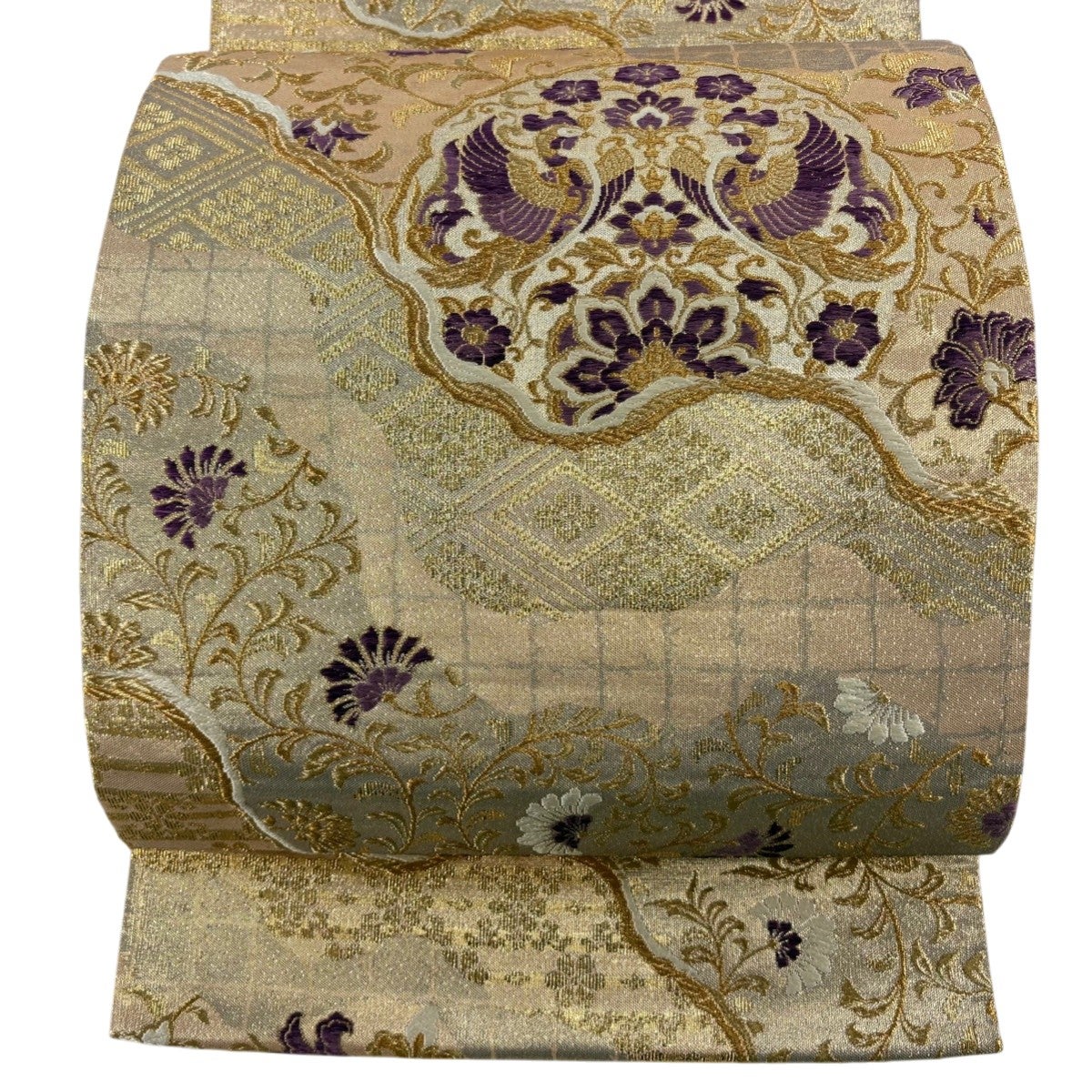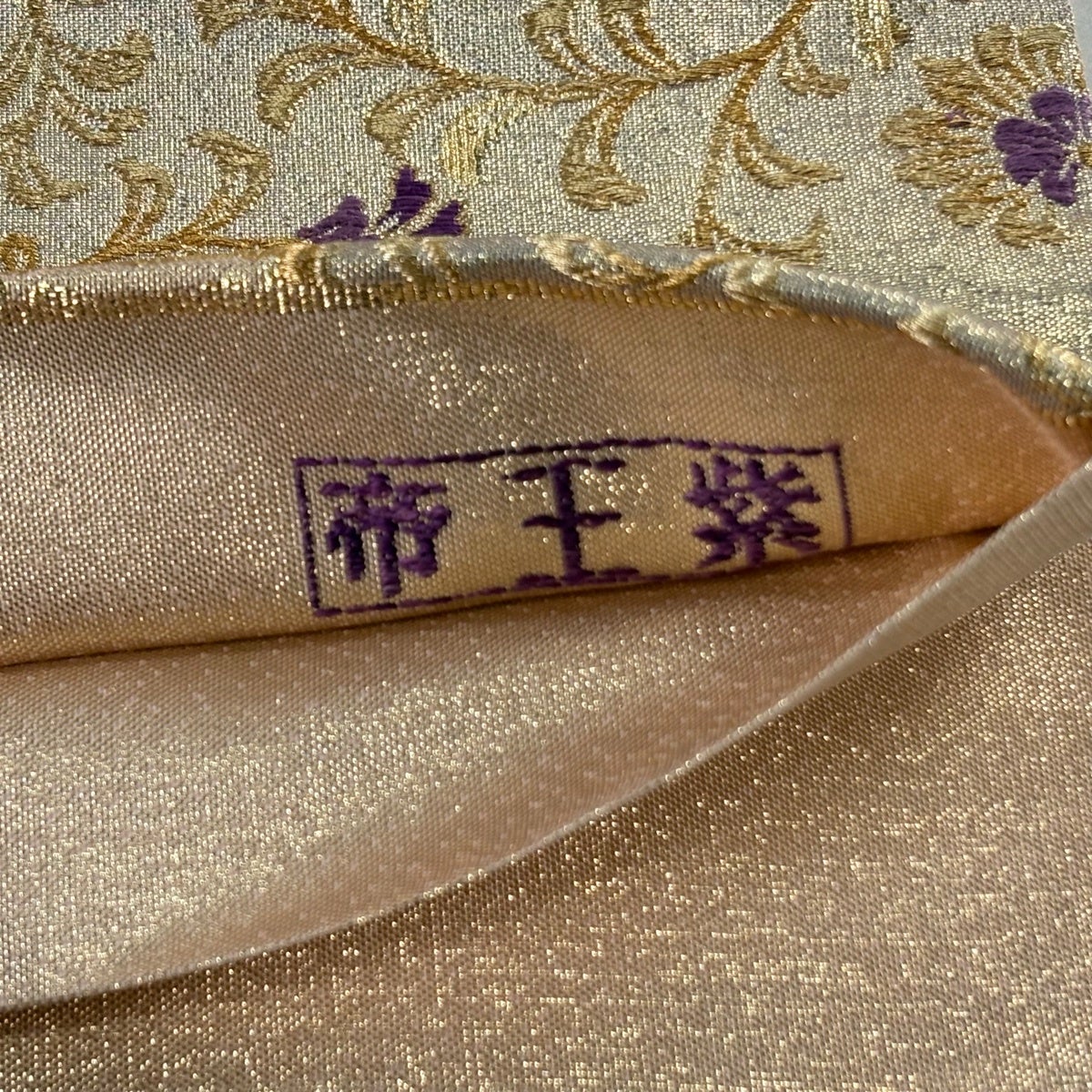 【美品】 袋帯 逸品 古代帝王紫 草花 有職文様 唐織 金糸 灰色 お太鼓柄 正絹