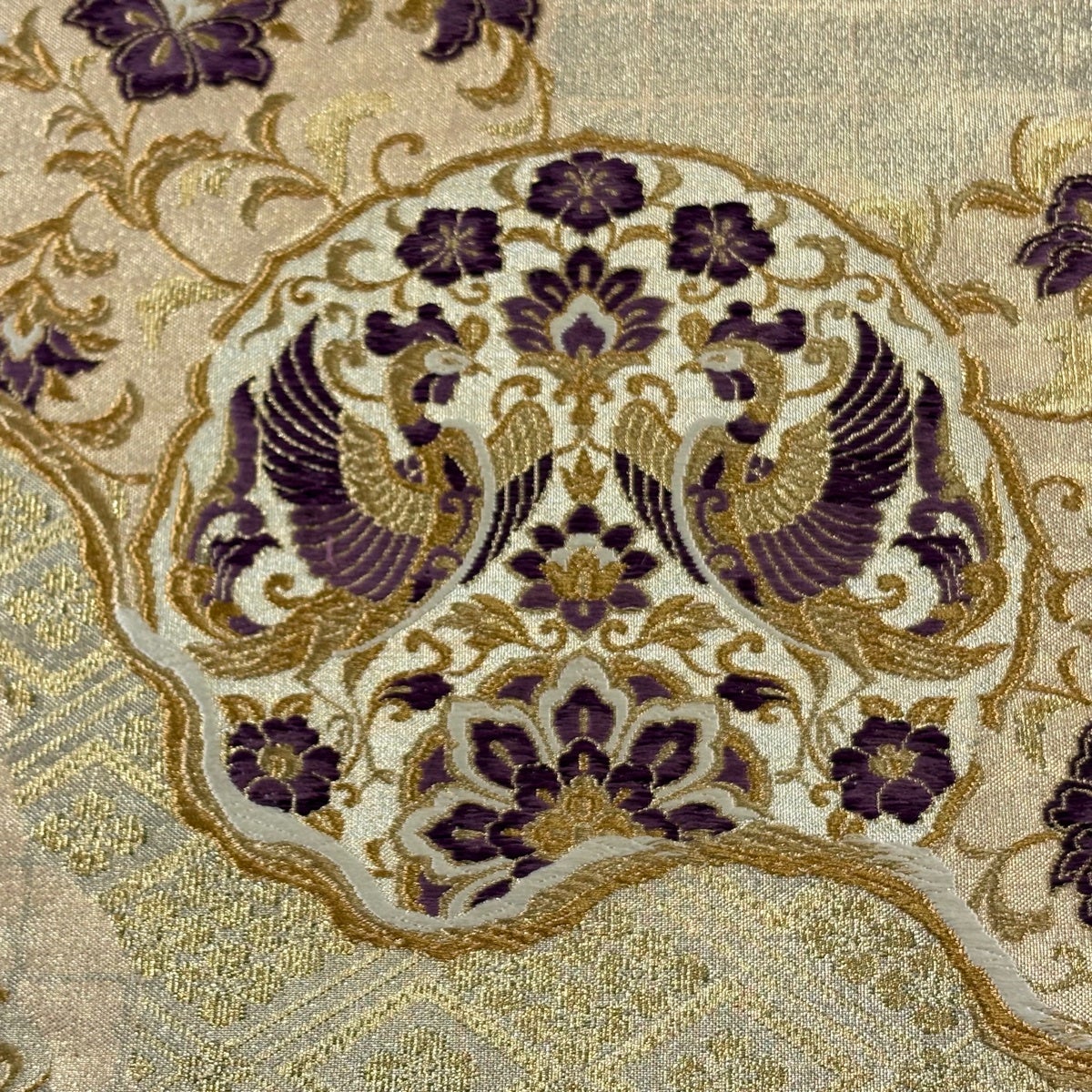 袋帯 逸品 じゅらく 落款あり 帝王紫 鳳凰 花唐草 唐織 金糸 金色 お太鼓柄 正絹