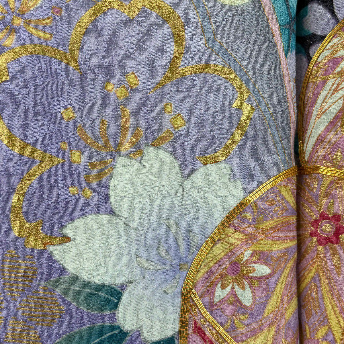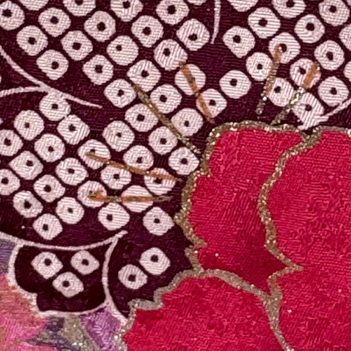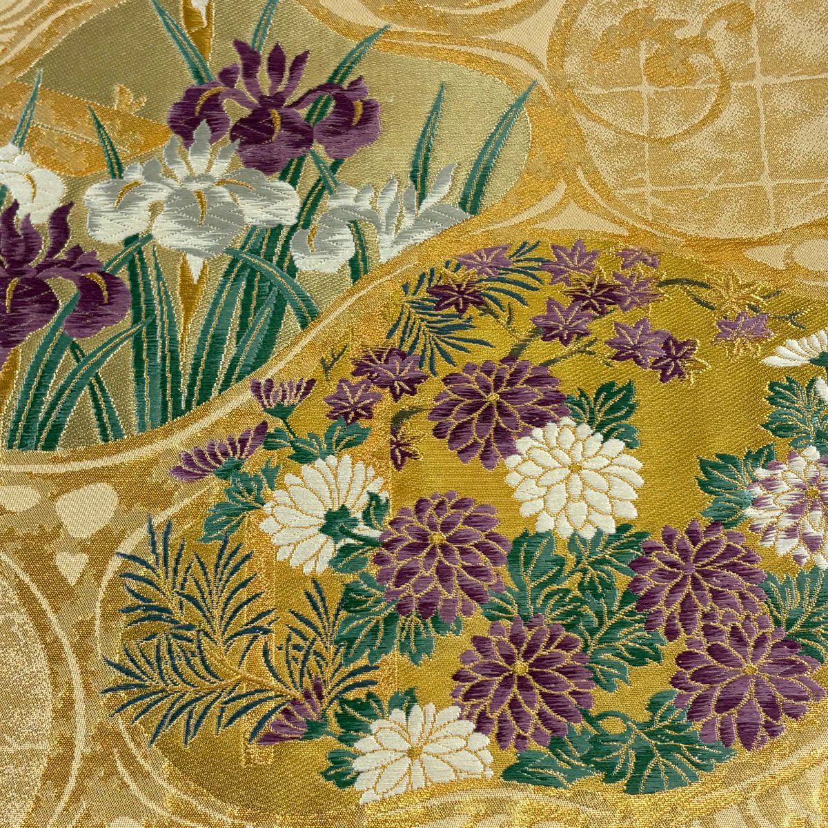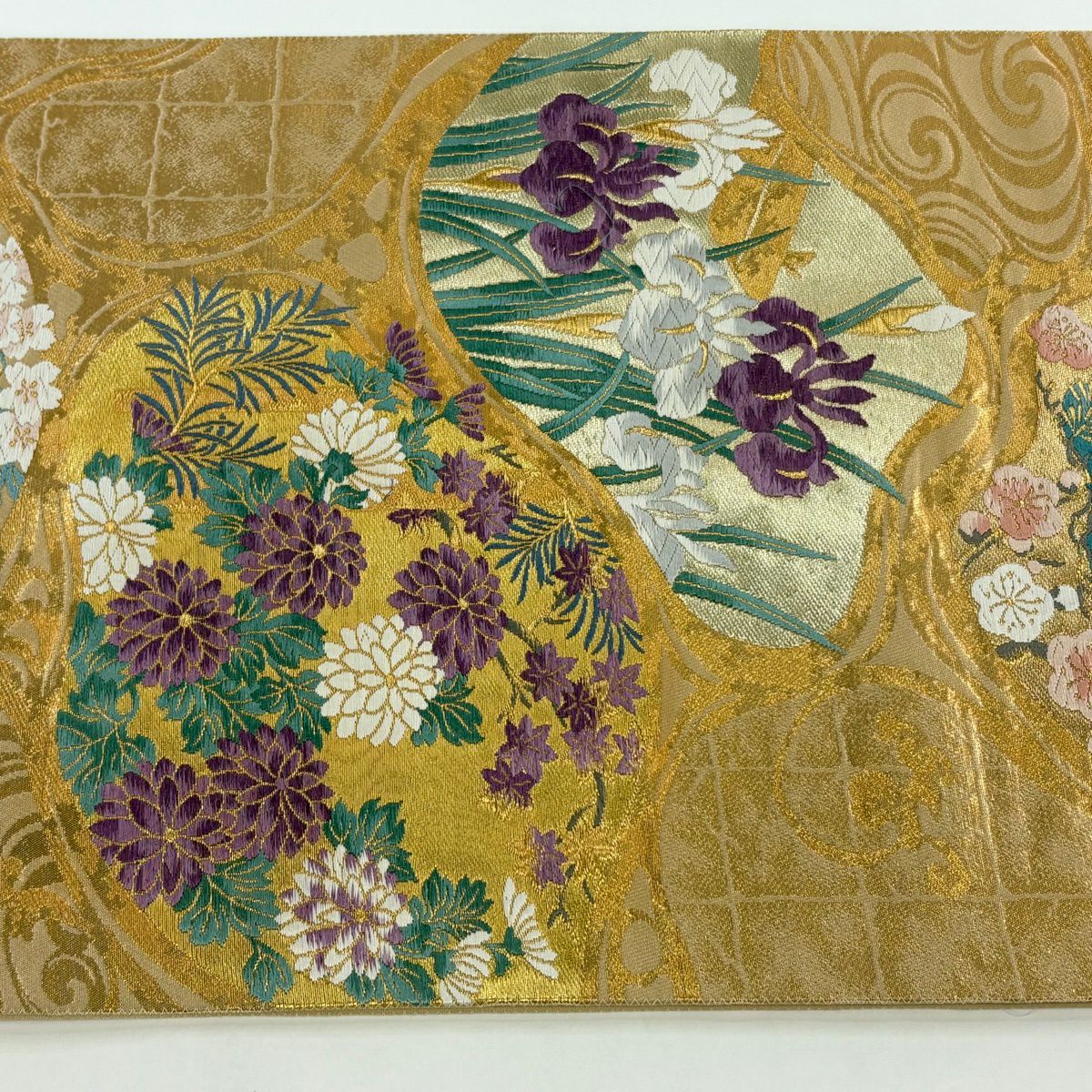 【美品】 袋帯 逸品 じゅらく 落款あり 帝王紫 菊 松梅 金糸 箔 金色 六通 正絹
