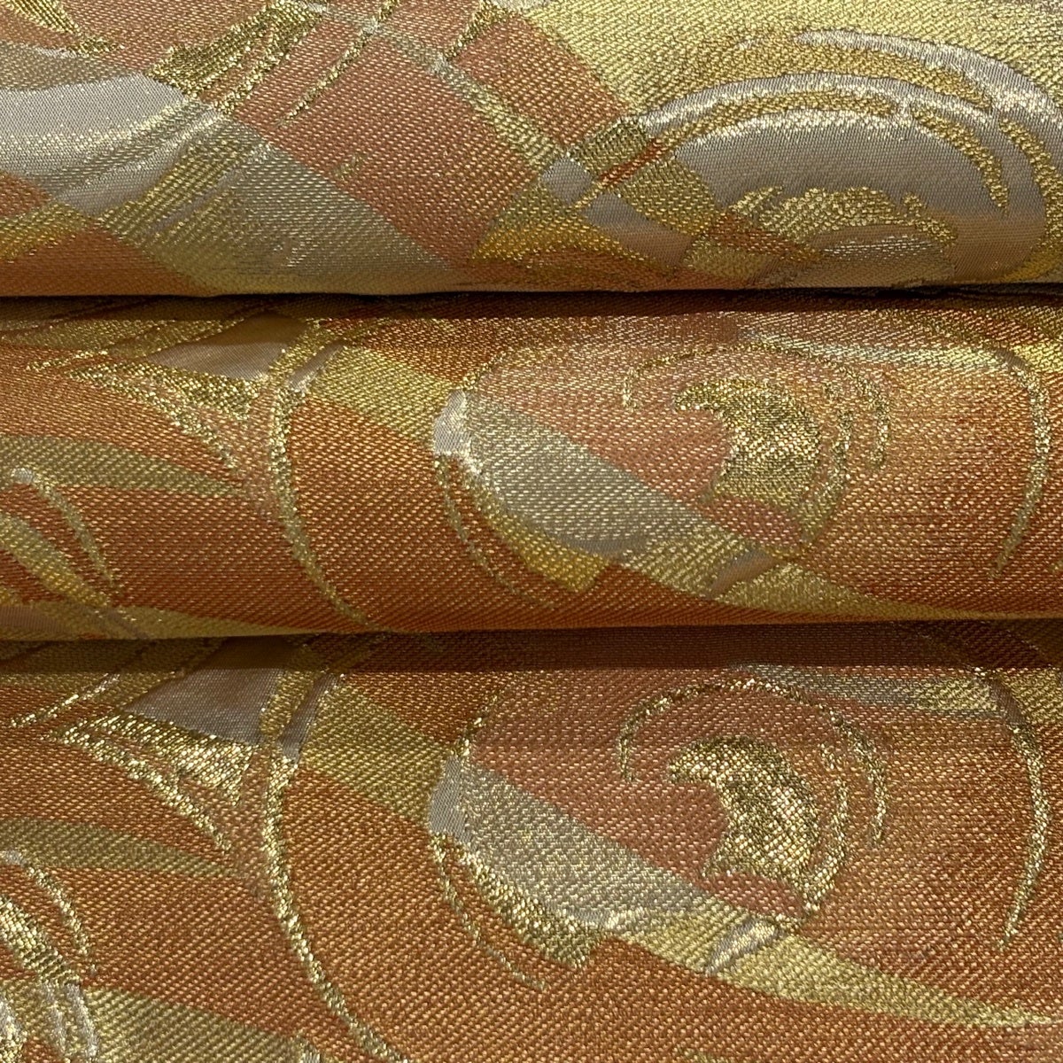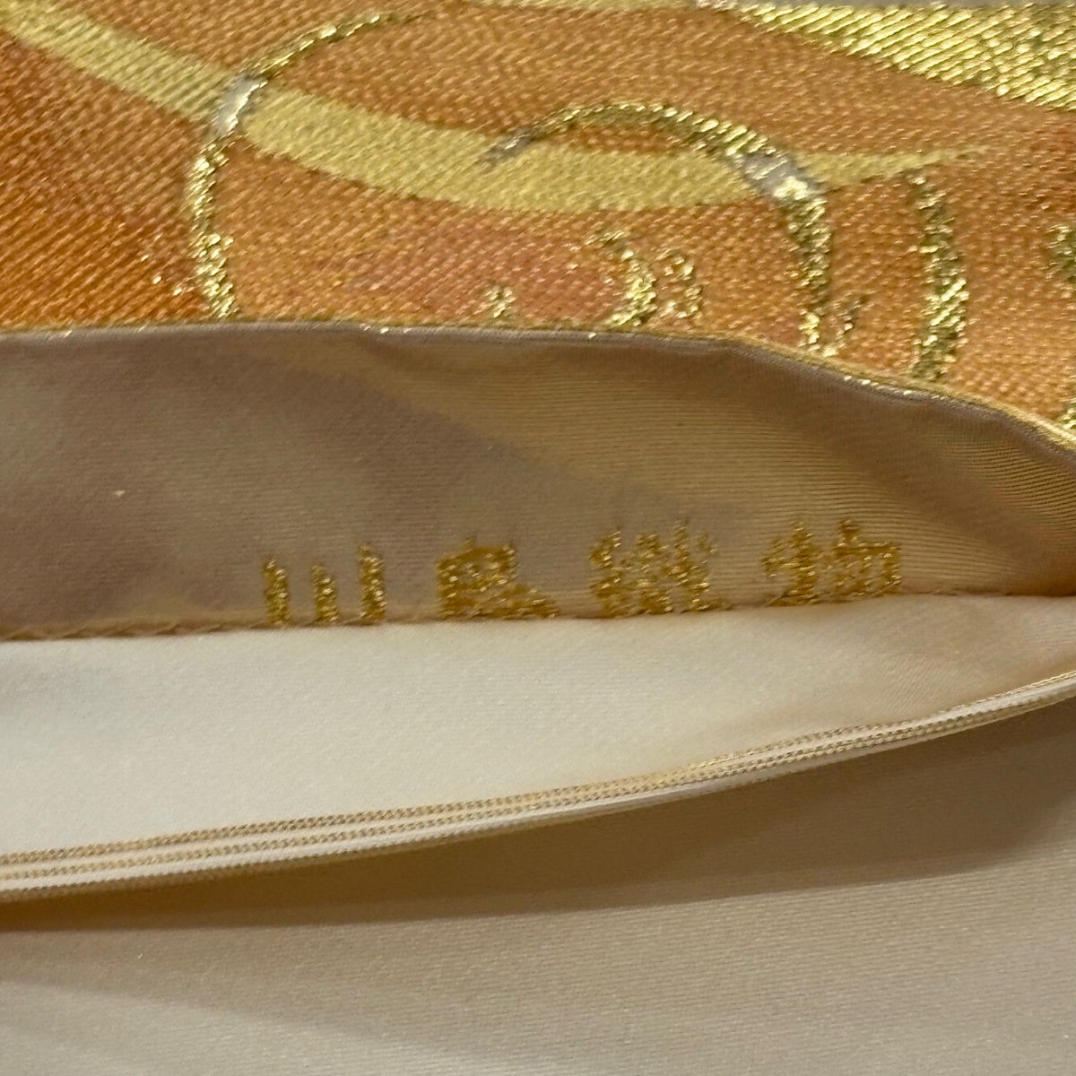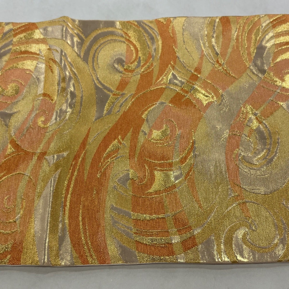 袋帯 逸品 河合美術織物 落款あり 花丸文 籠目 唐織 箔 オレンジ 六通 正絹