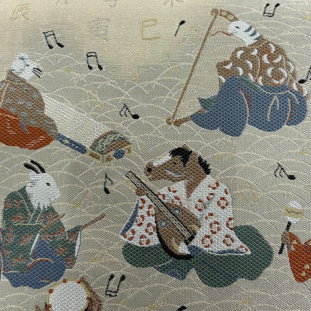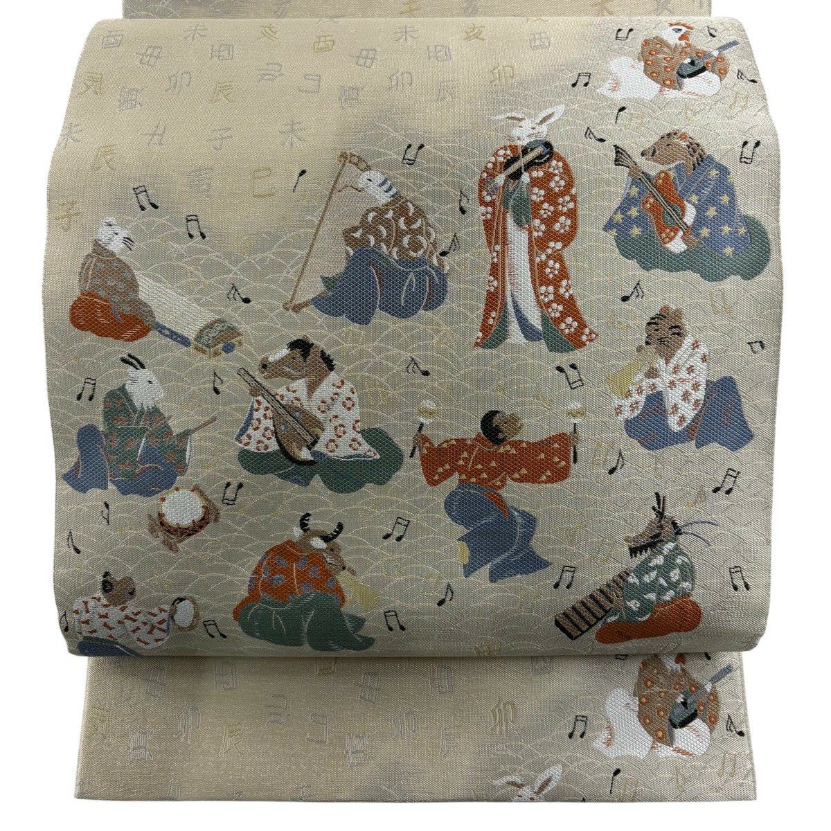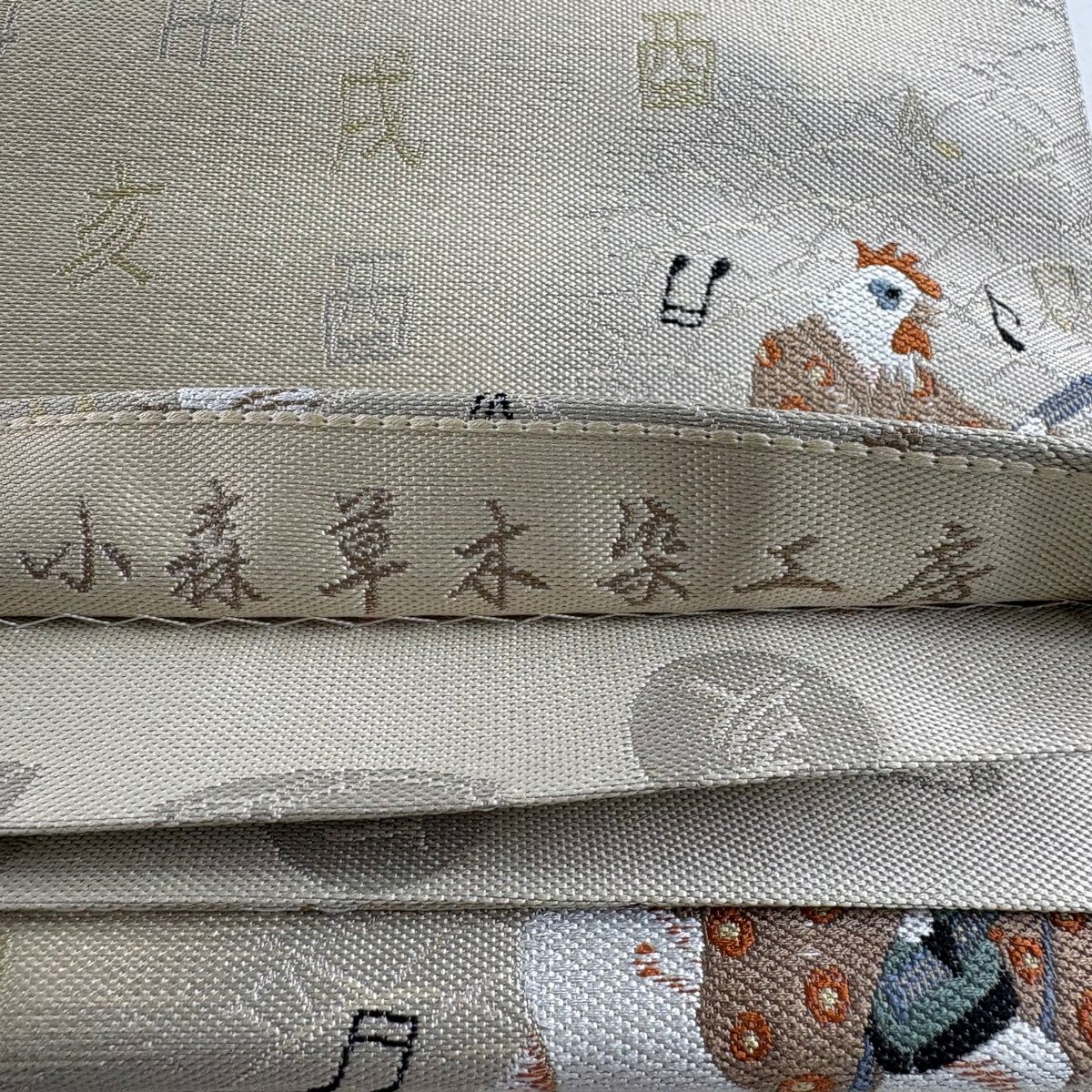 【美品】 袋帯 逸品 落款あり 小森草木染工房 十二支舞楽文 刺繍 灰緑 全通 正絹