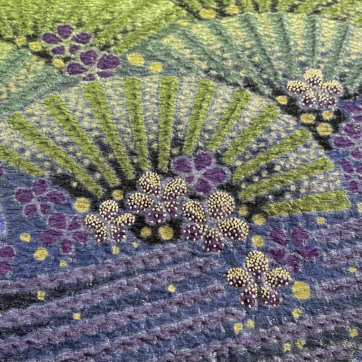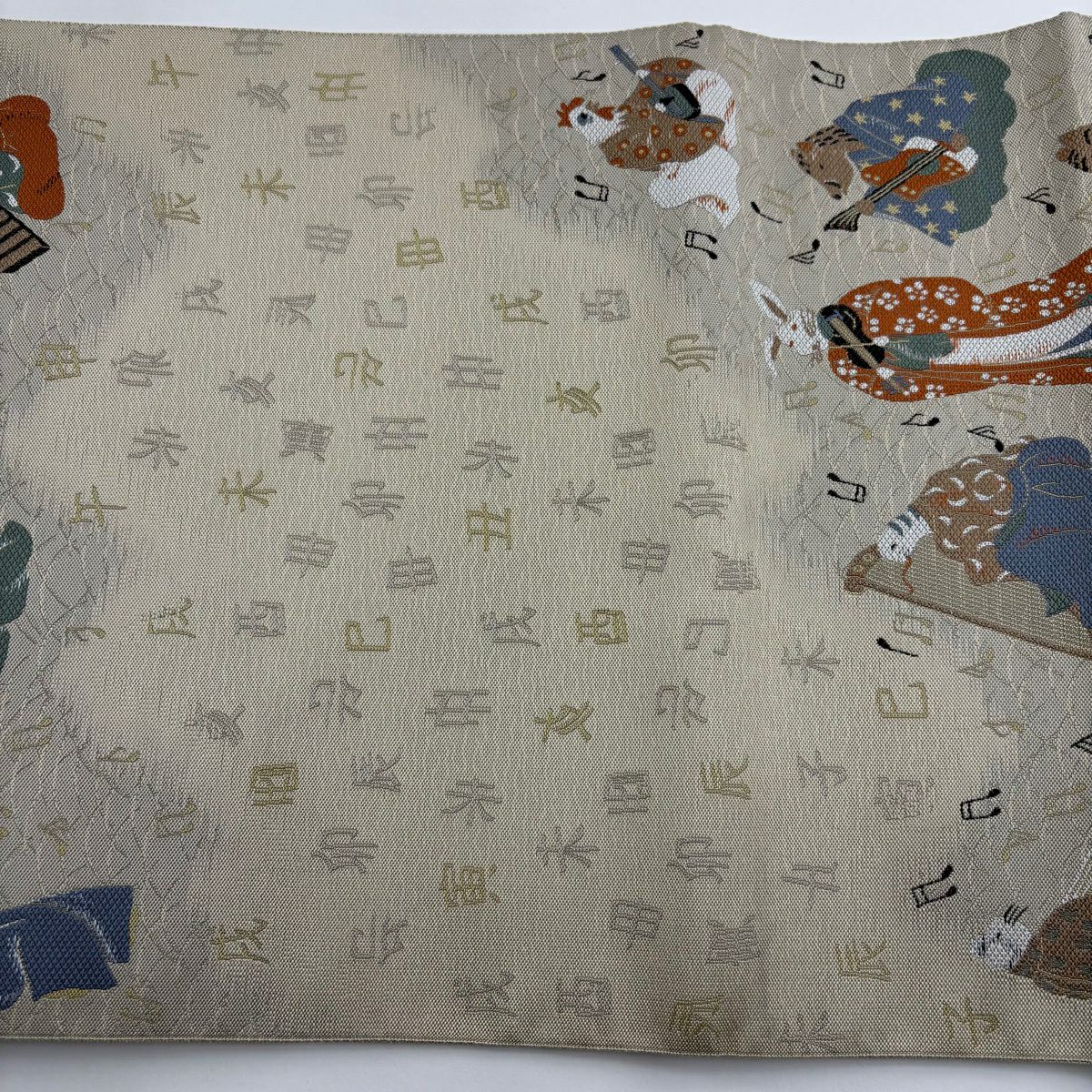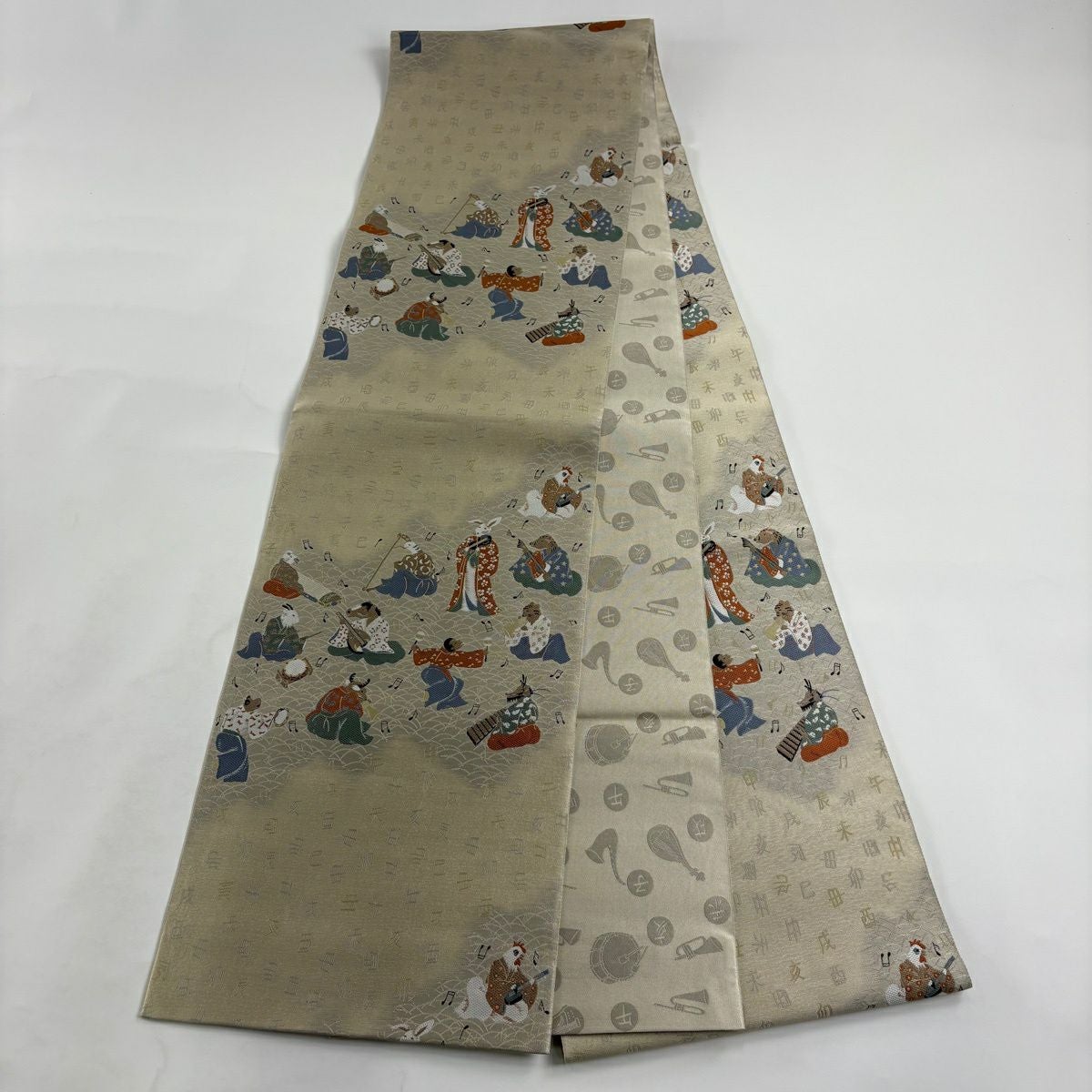 【美品】 袋帯 逸品 落款あり 小森草木染工房 十二支舞楽文 刺繍 灰緑 全通 正絹
