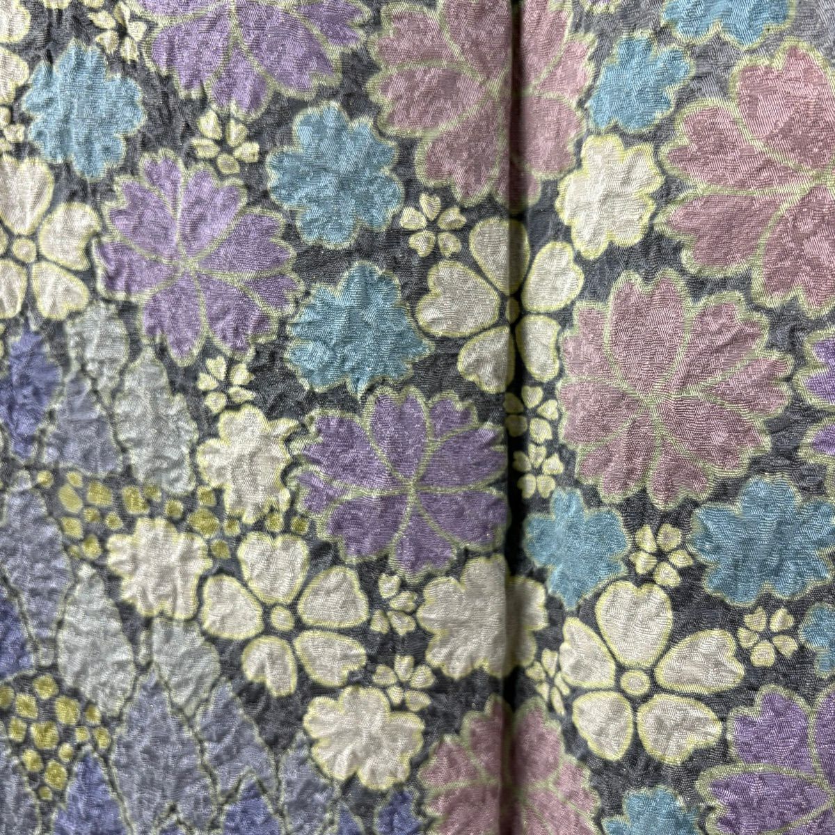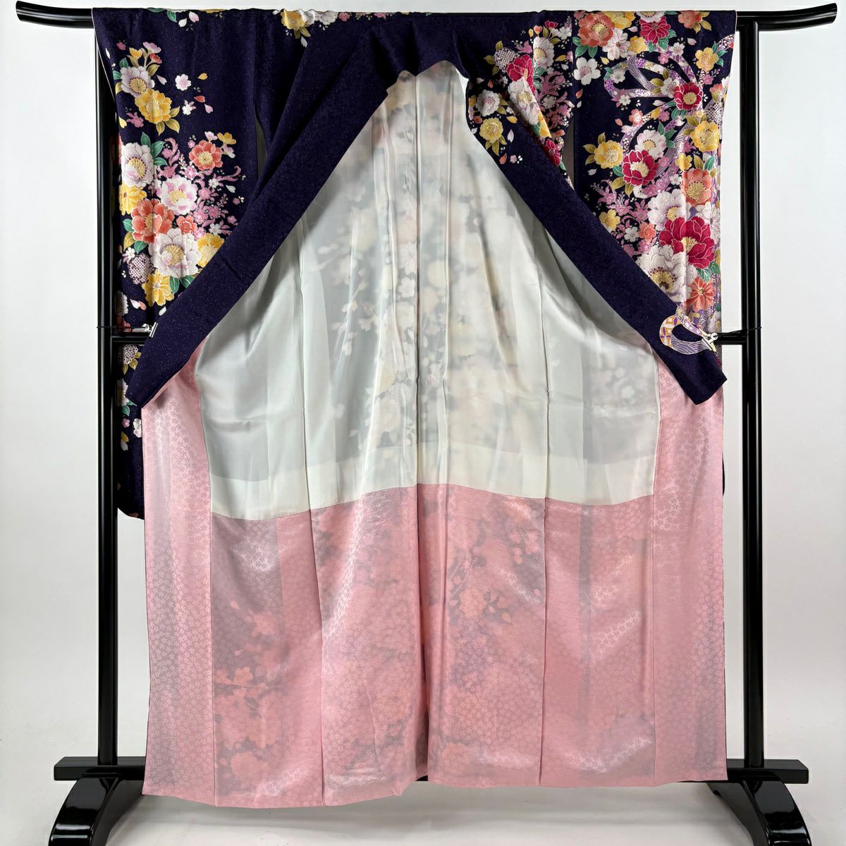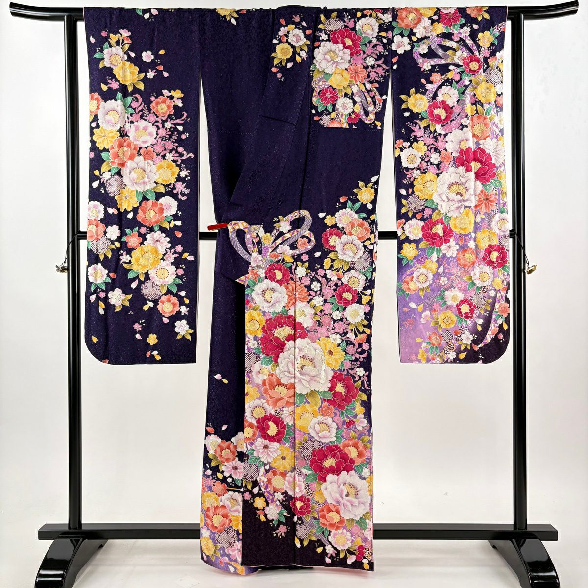 振袖 身丈163cm 裄丈65.5cm M 袷 牡丹 桜 銀通し 箔 濃紫 正絹 逸品