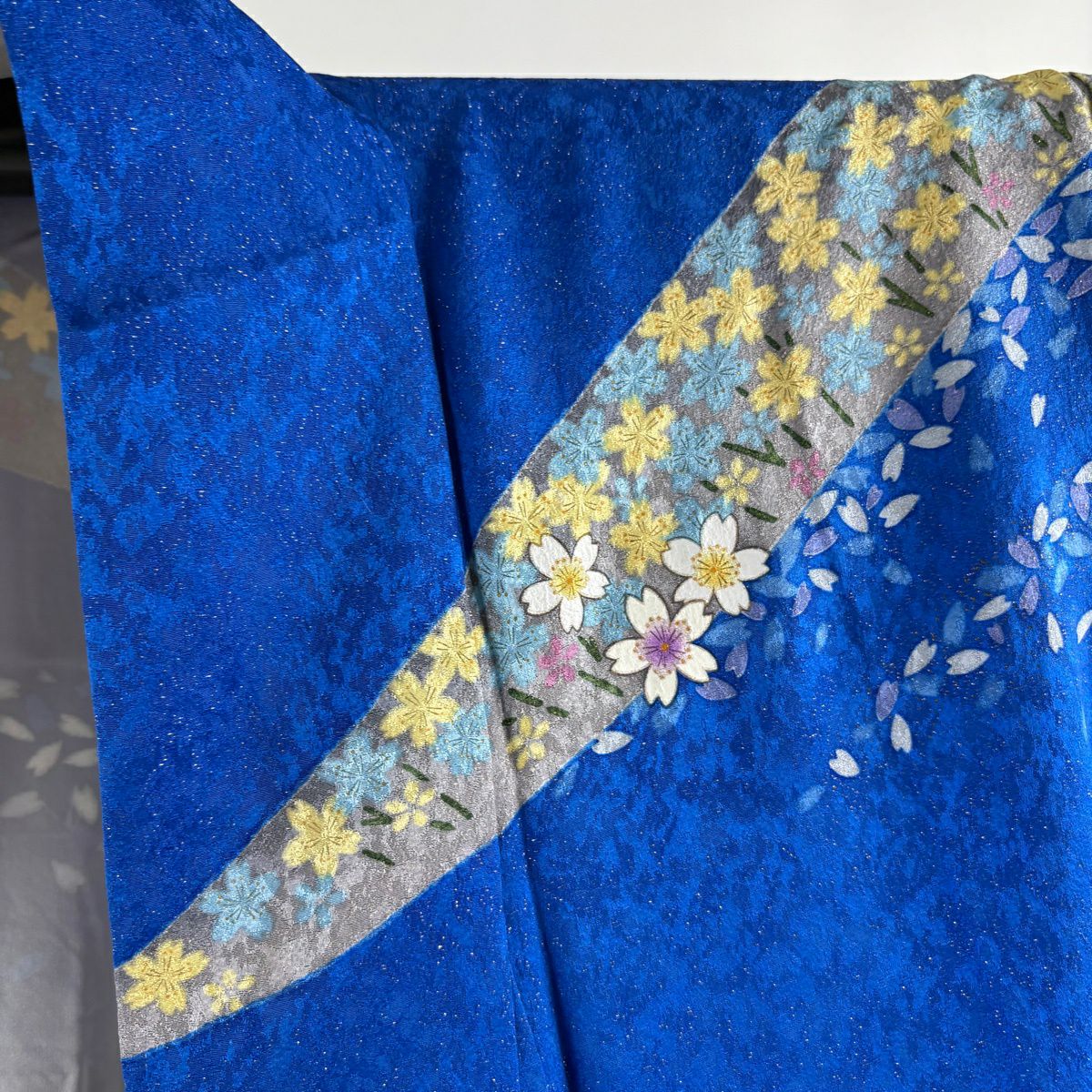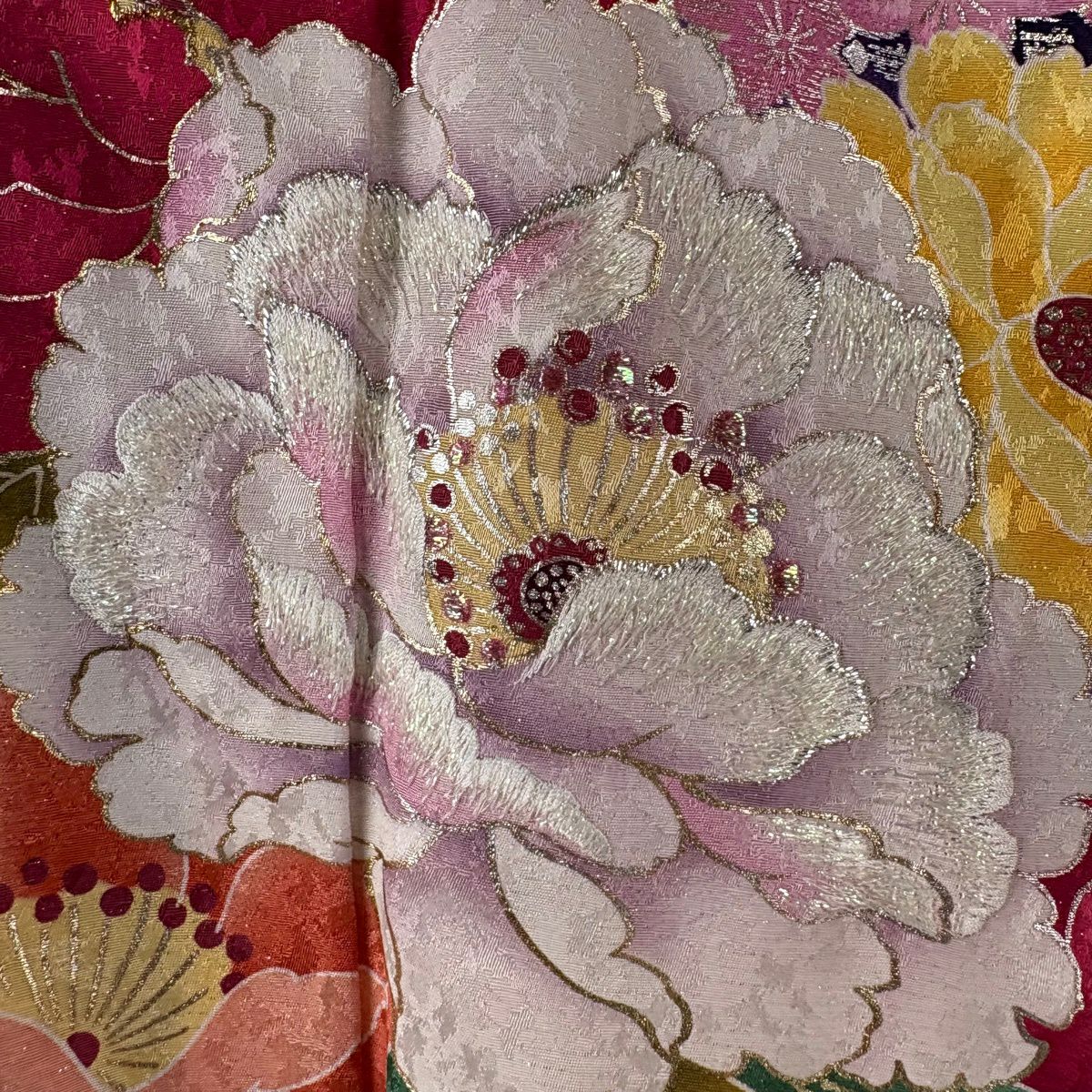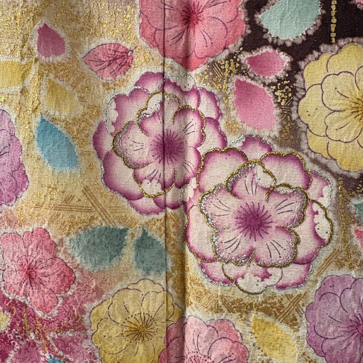 振袖 身丈163cm 裄丈65.5cm M 袷 牡丹 桜 銀通し 箔 濃紫 正絹 逸品