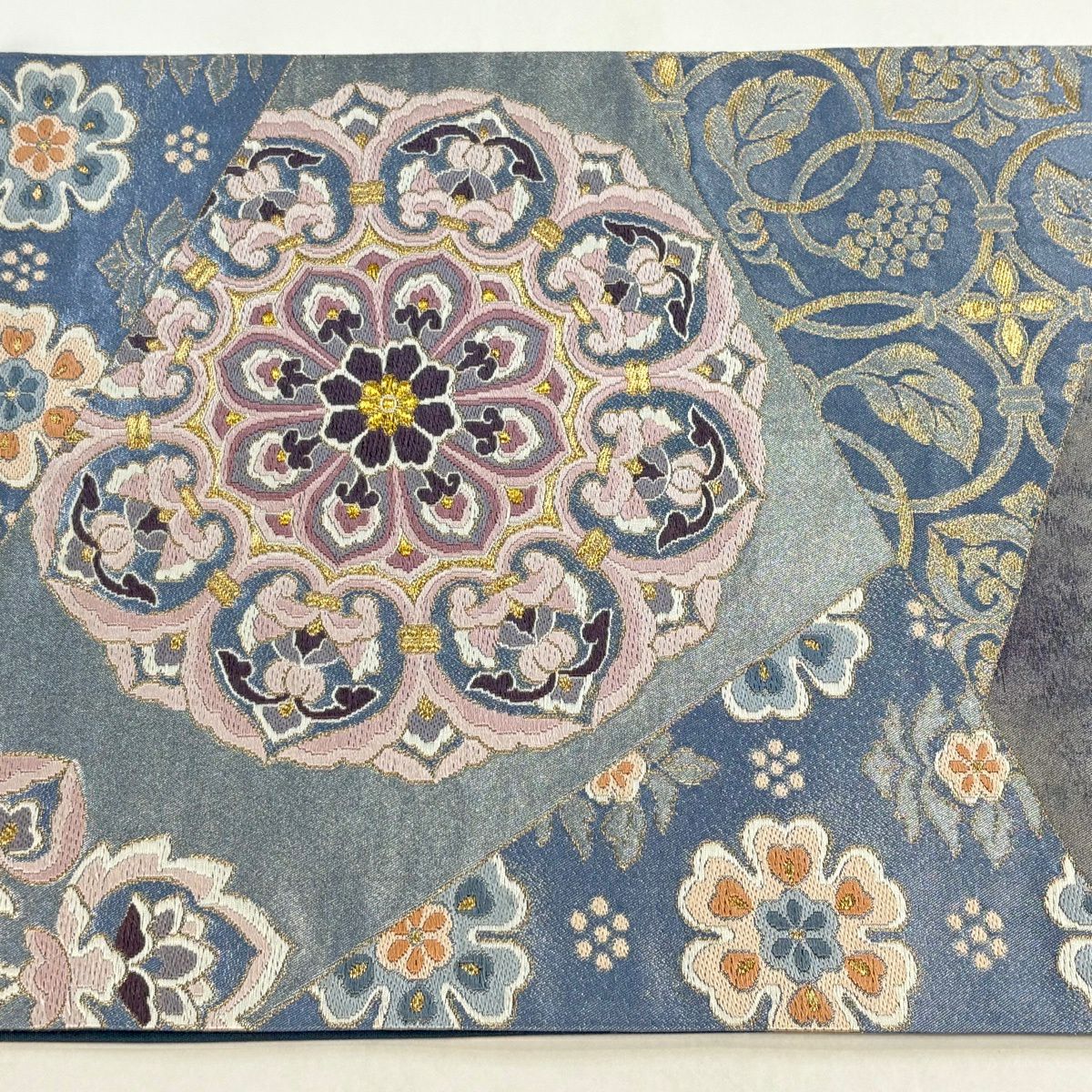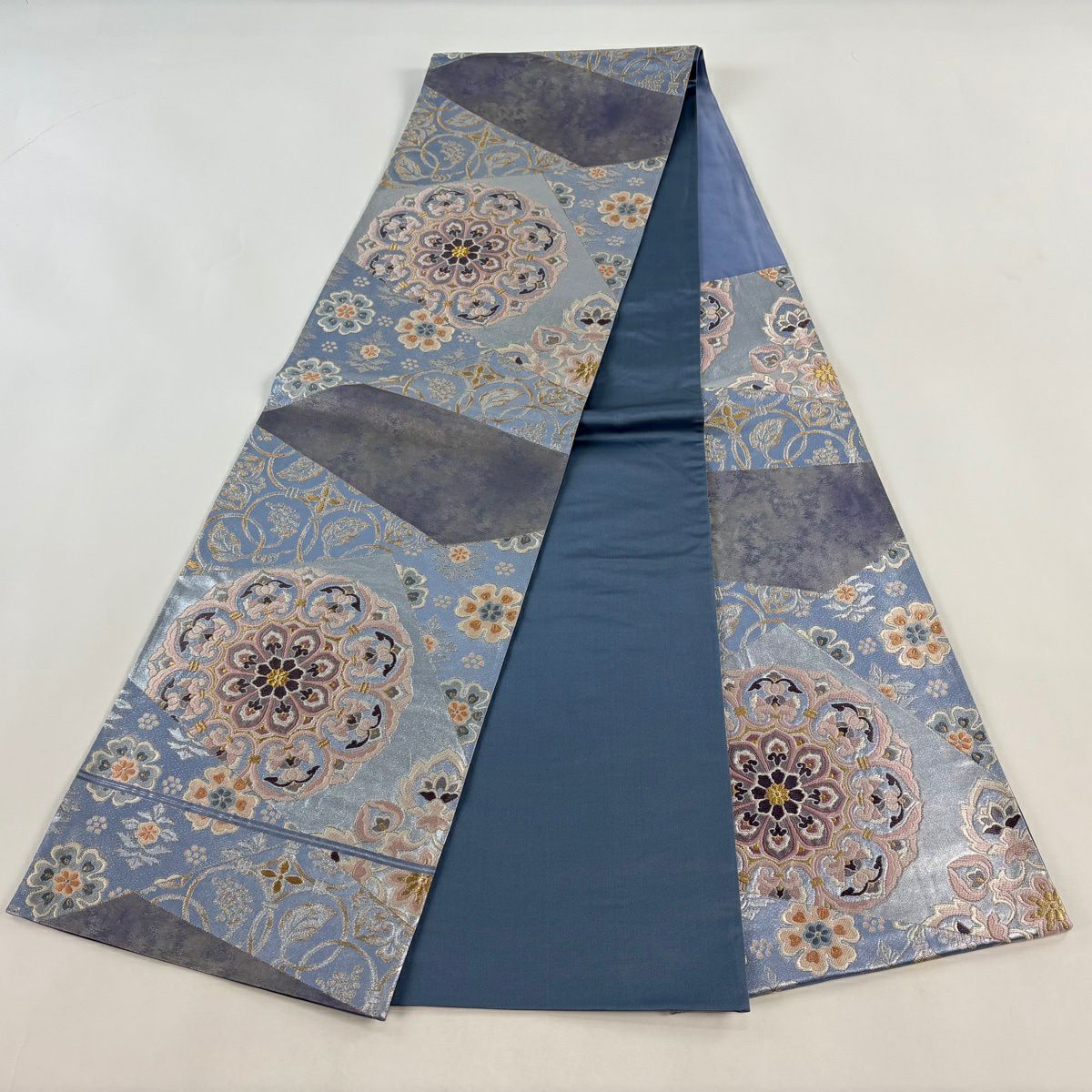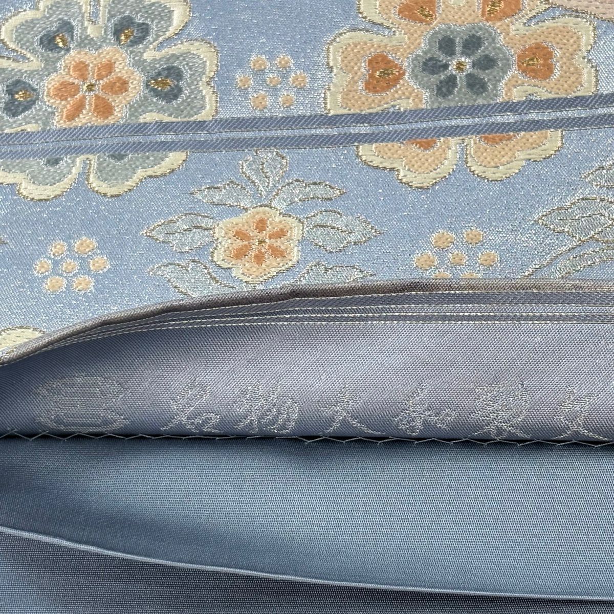 【美品】 袋帯 逸品 河村織物 落款あり 名物大和裂文 金糸 箔 青灰色 六通 正絹