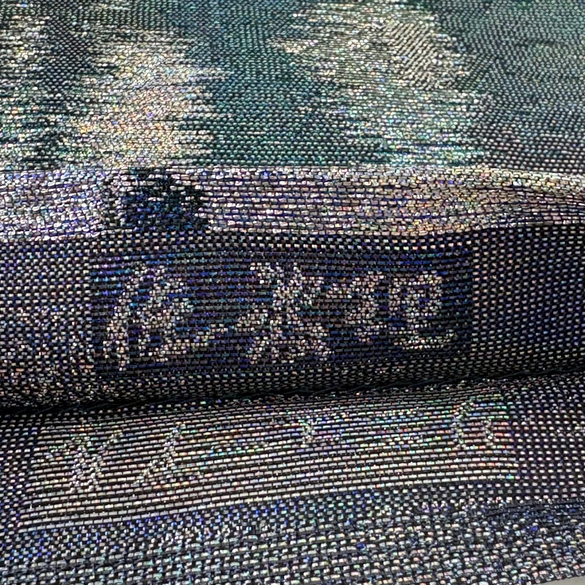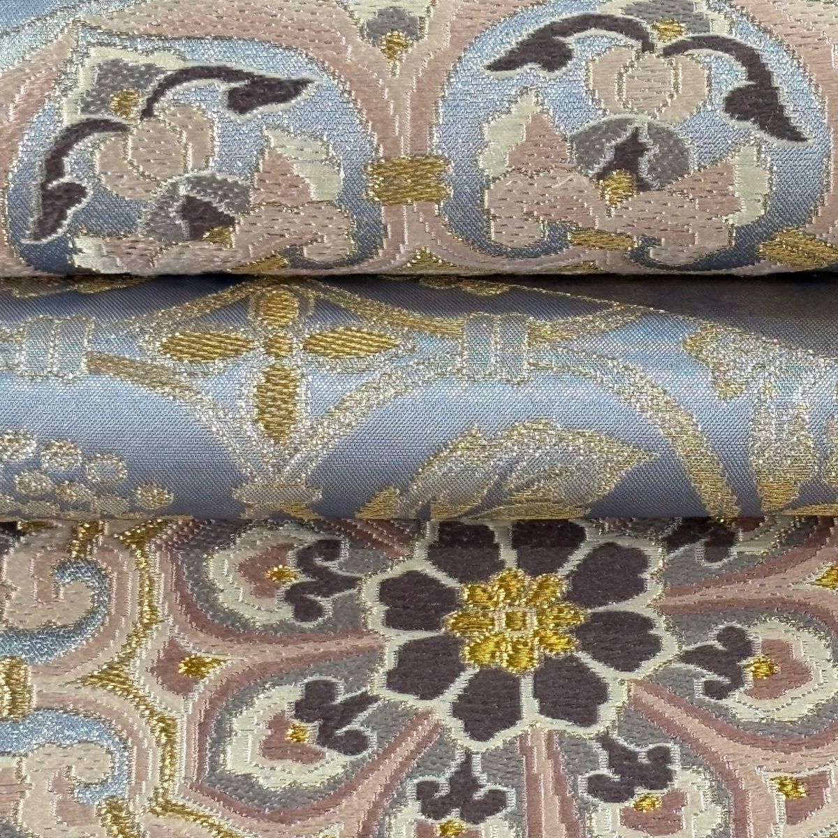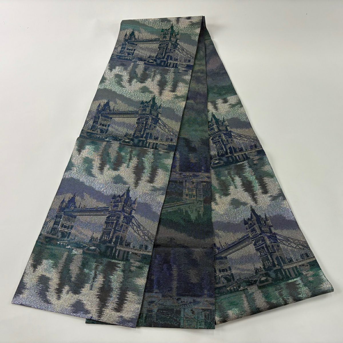 【美品】 袋帯 逸品 河村織物 落款あり 名物大和裂文 金糸 箔 青灰色 六通 正絹