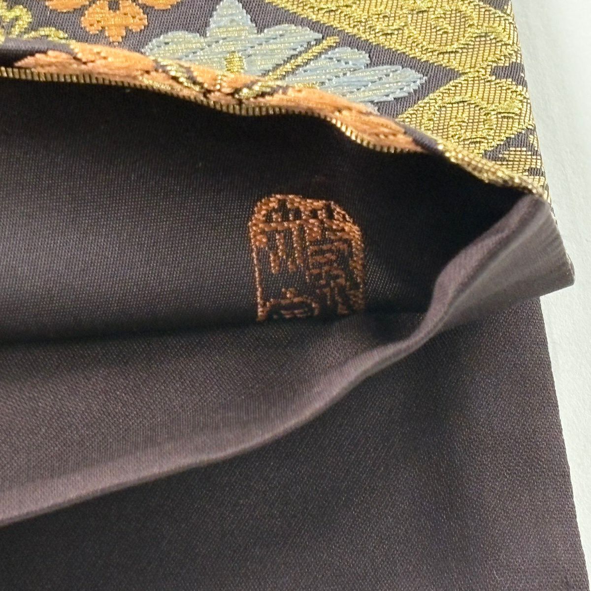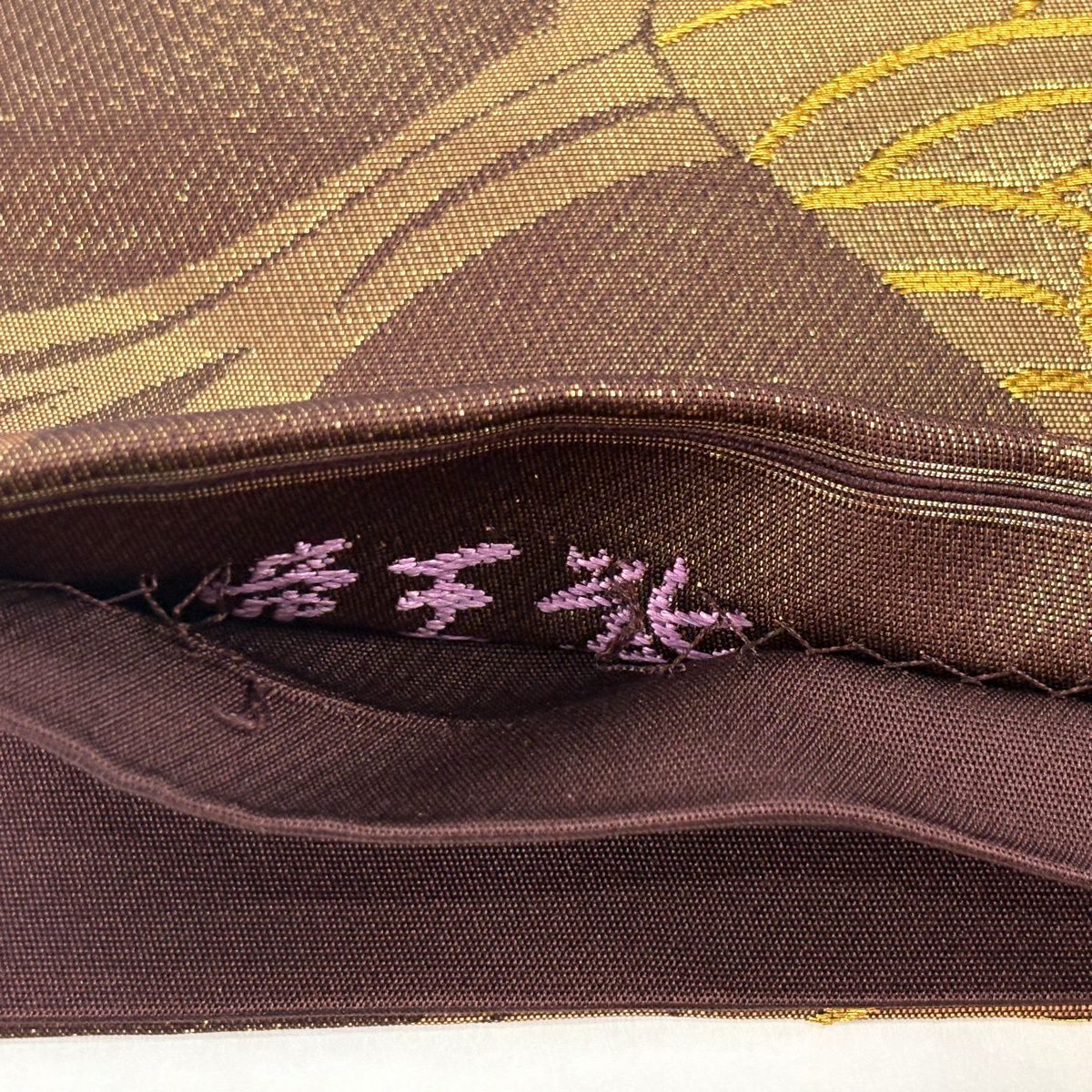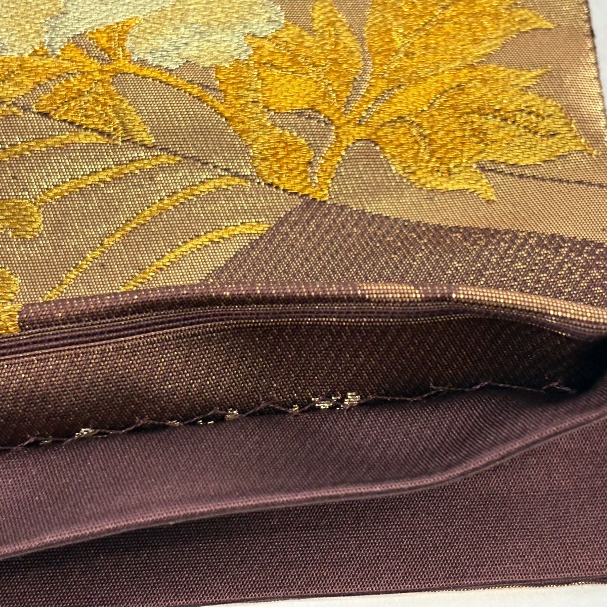 【美品】 袋帯 逸品 帝王紫 落款あり 色紙 松梅 金銀糸 箔 茶色 お太鼓柄 正絹
