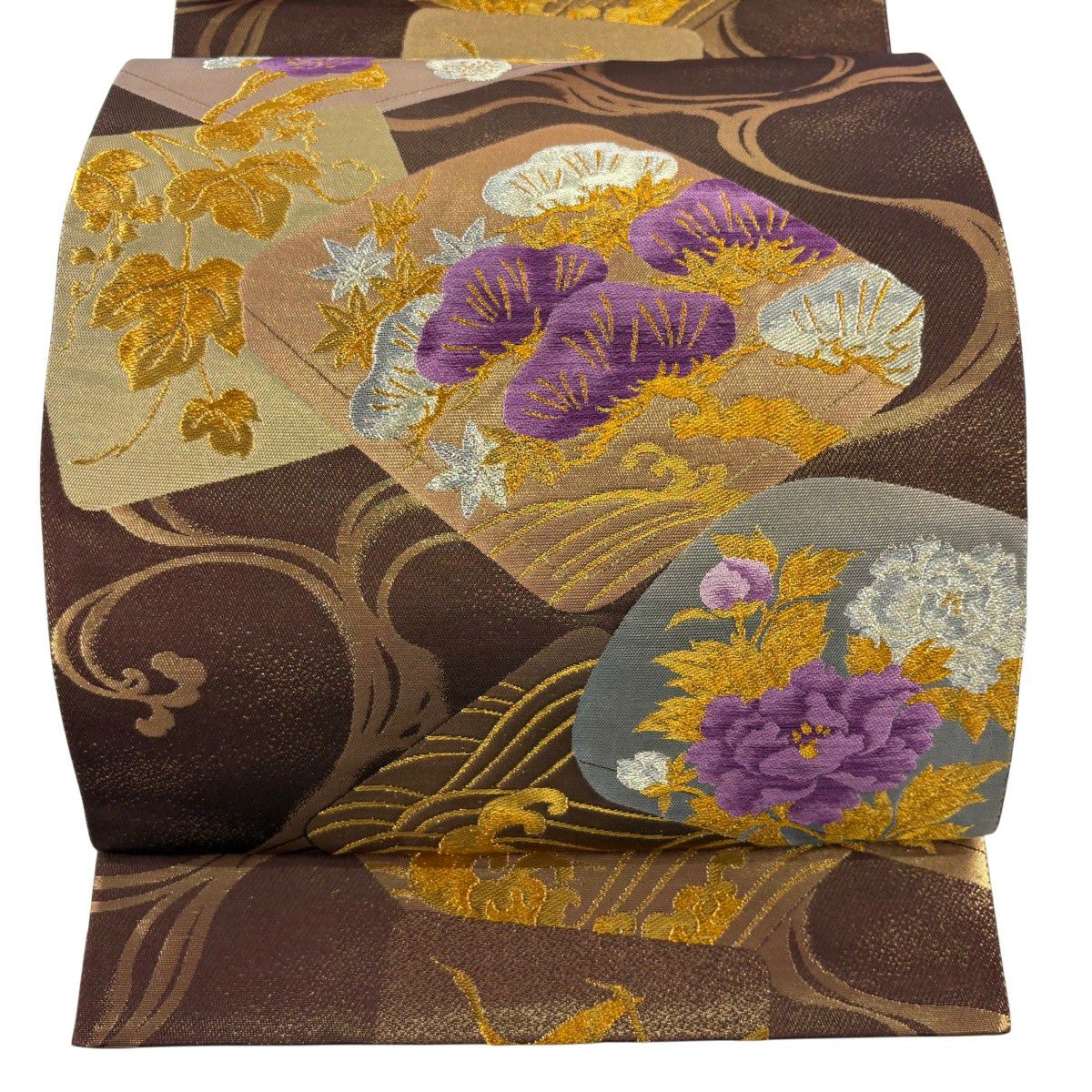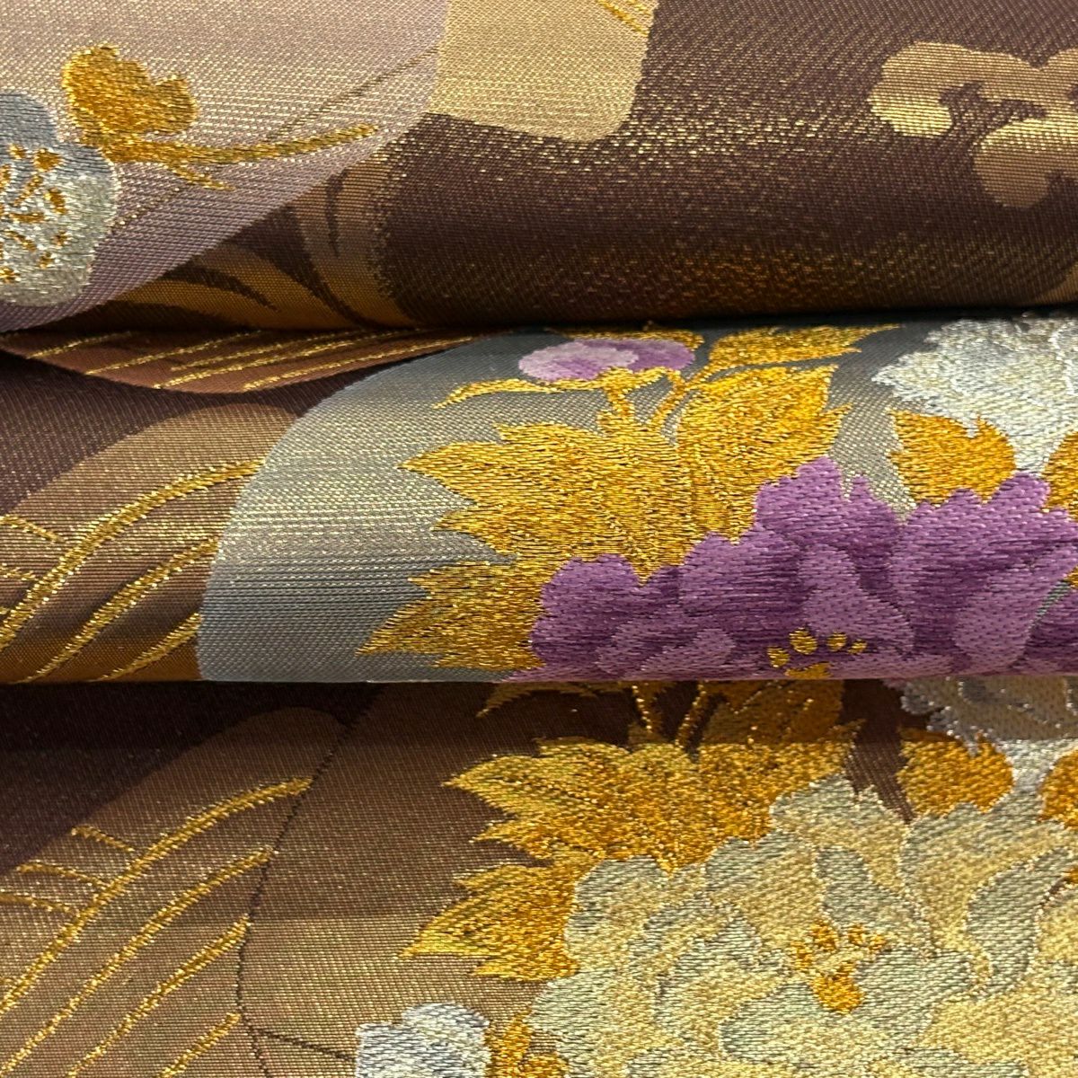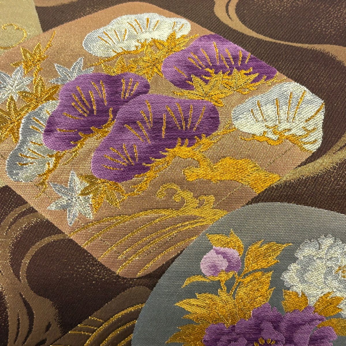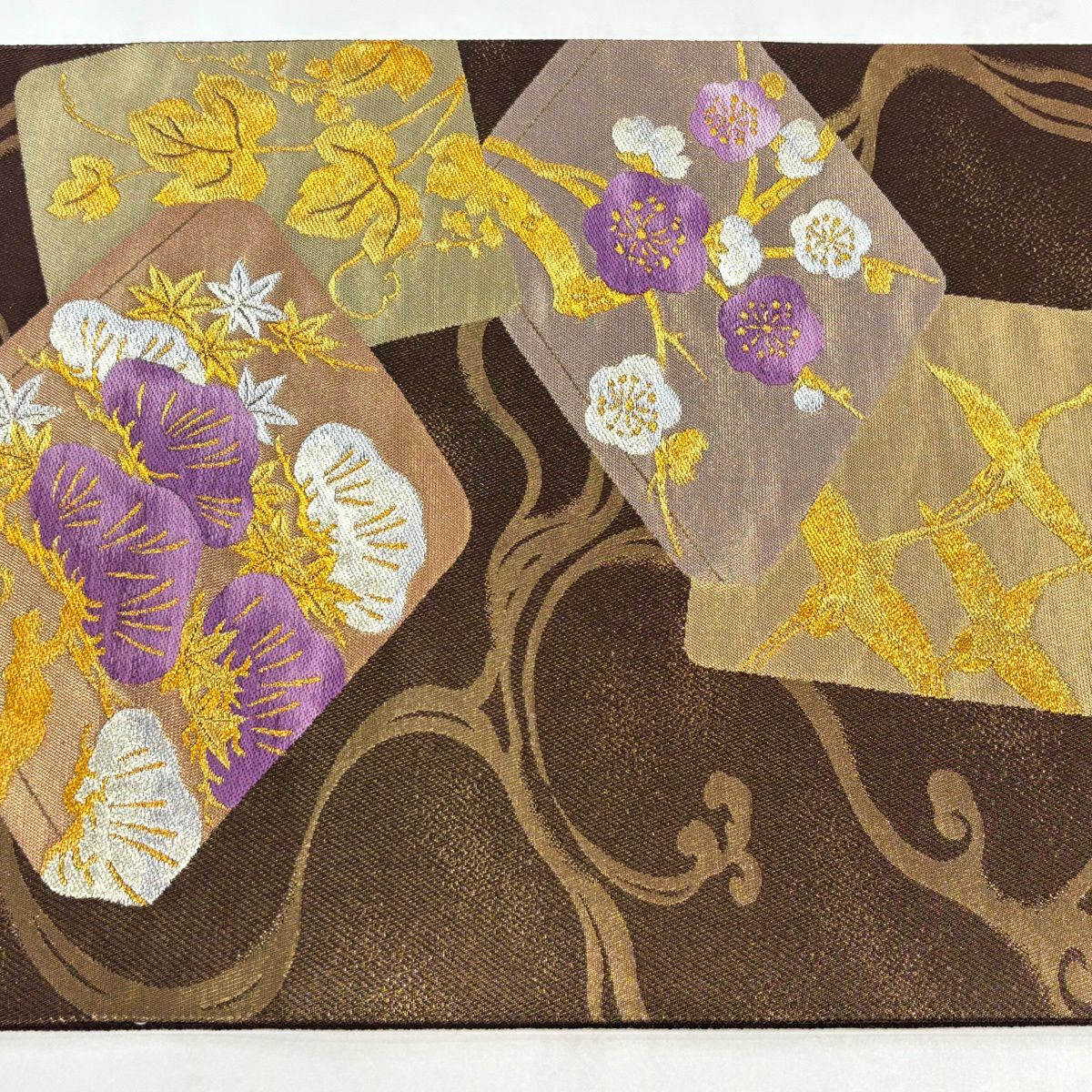 【美品】 袋帯 逸品 帝王紫 落款あり 色紙 松梅 金銀糸 箔 茶色 お太鼓柄 正絹