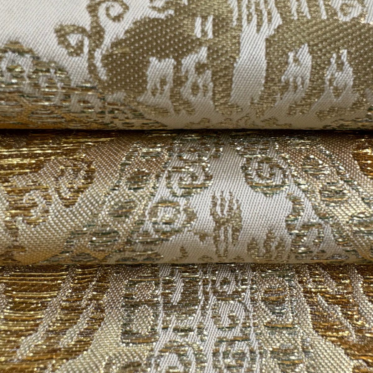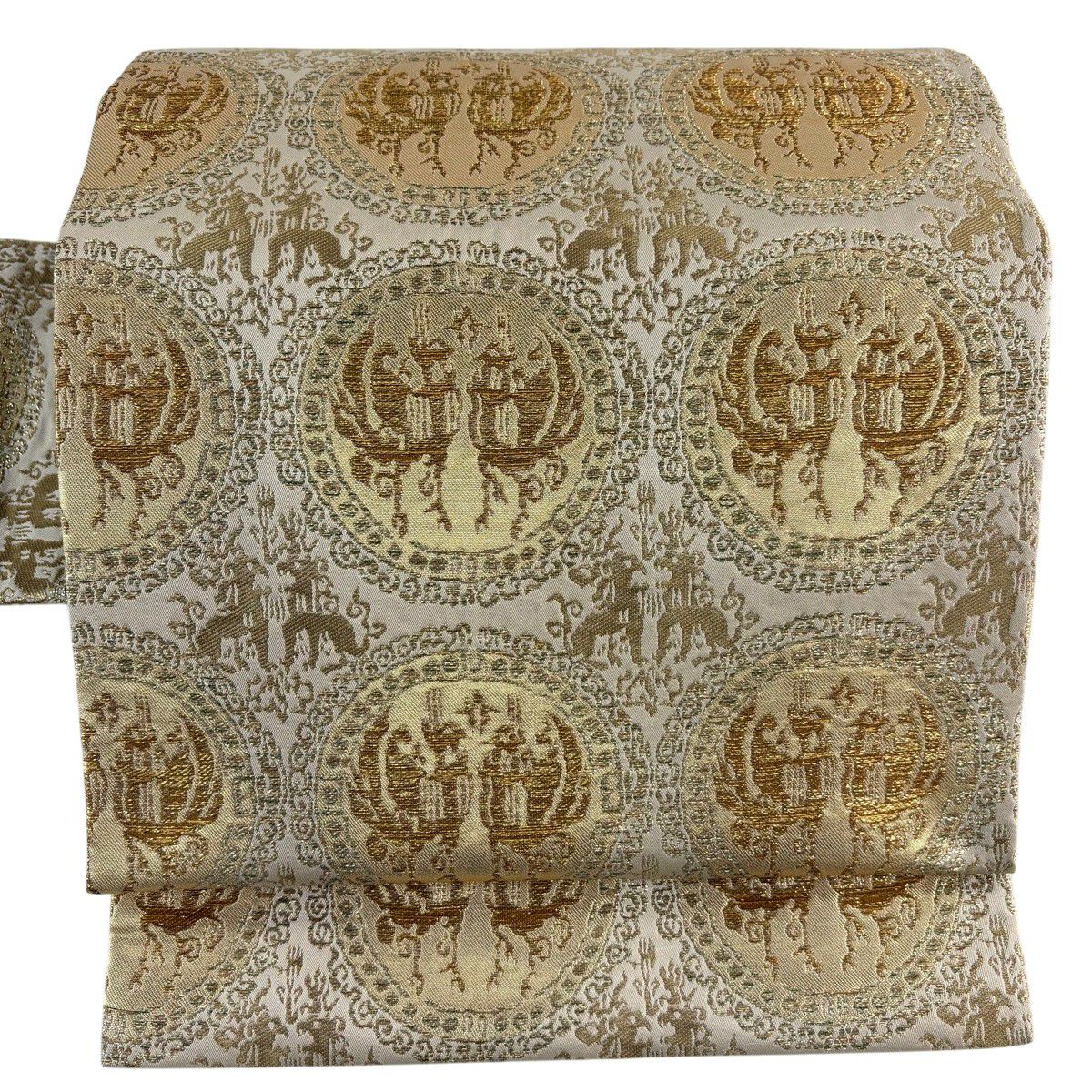 【美品】 名古屋帯 逸品 川島織物 落款あり 向かい鳳凰 向かい獅子 金糸 箔 薄黄 正絹