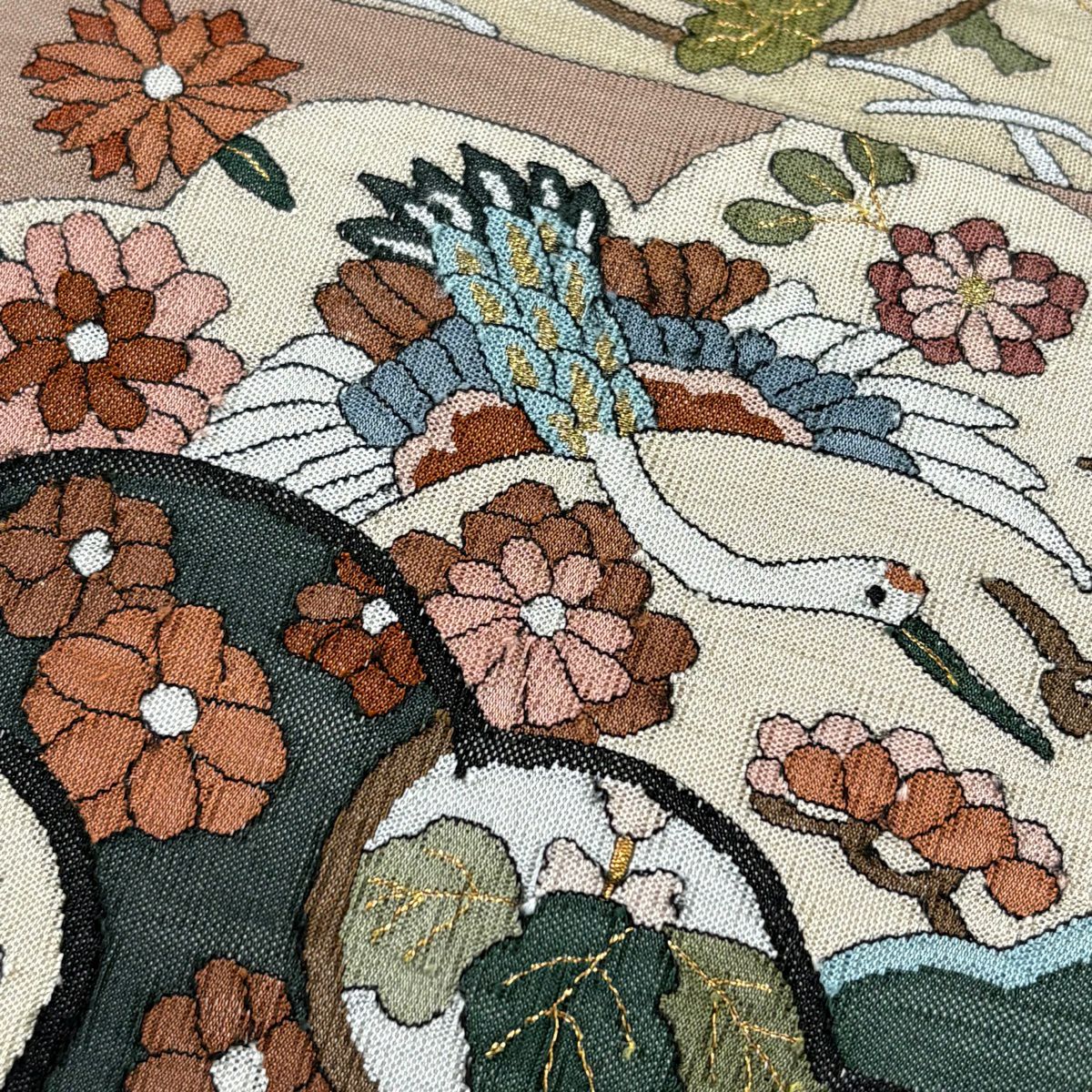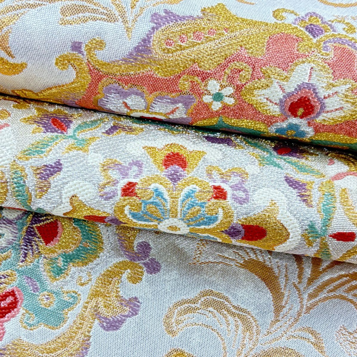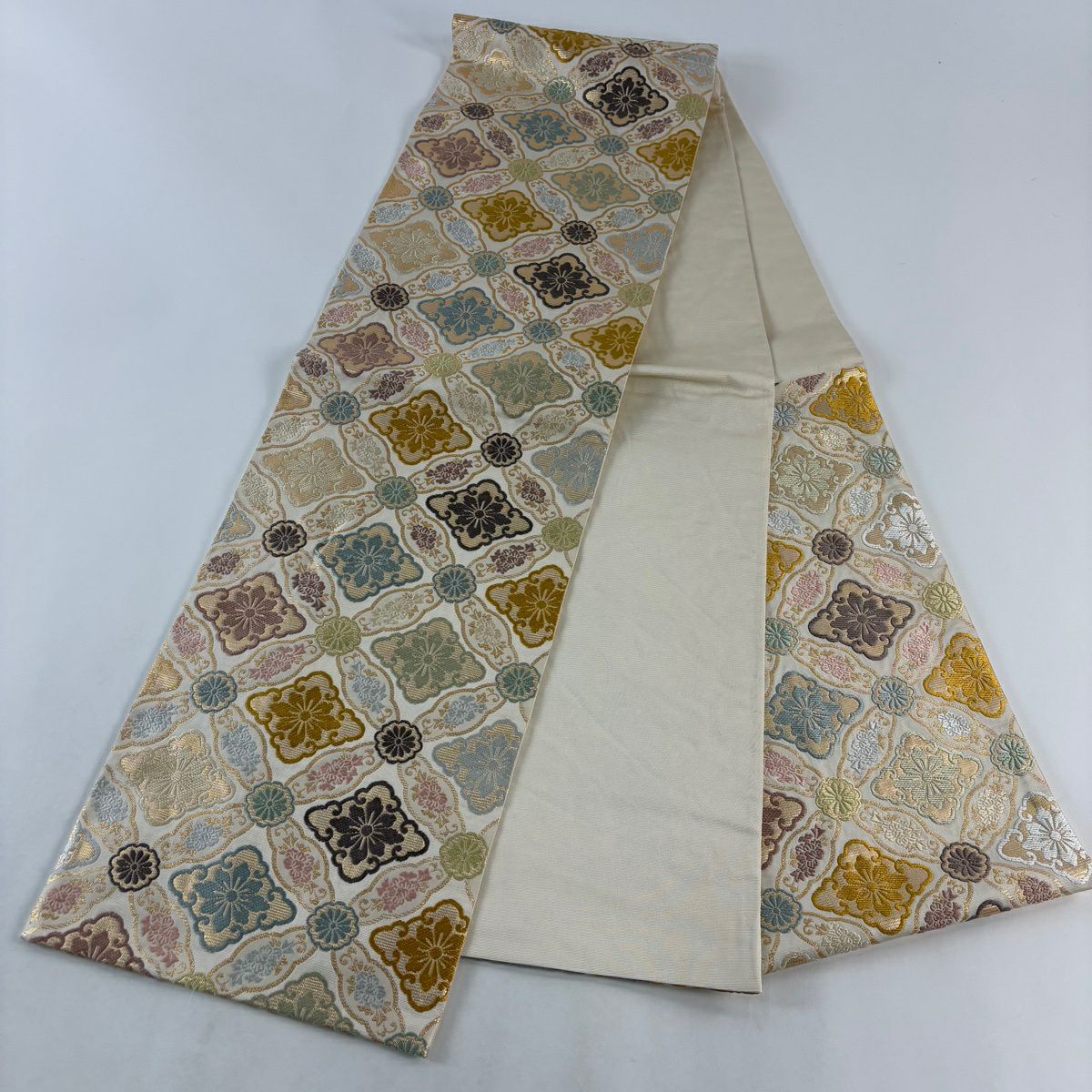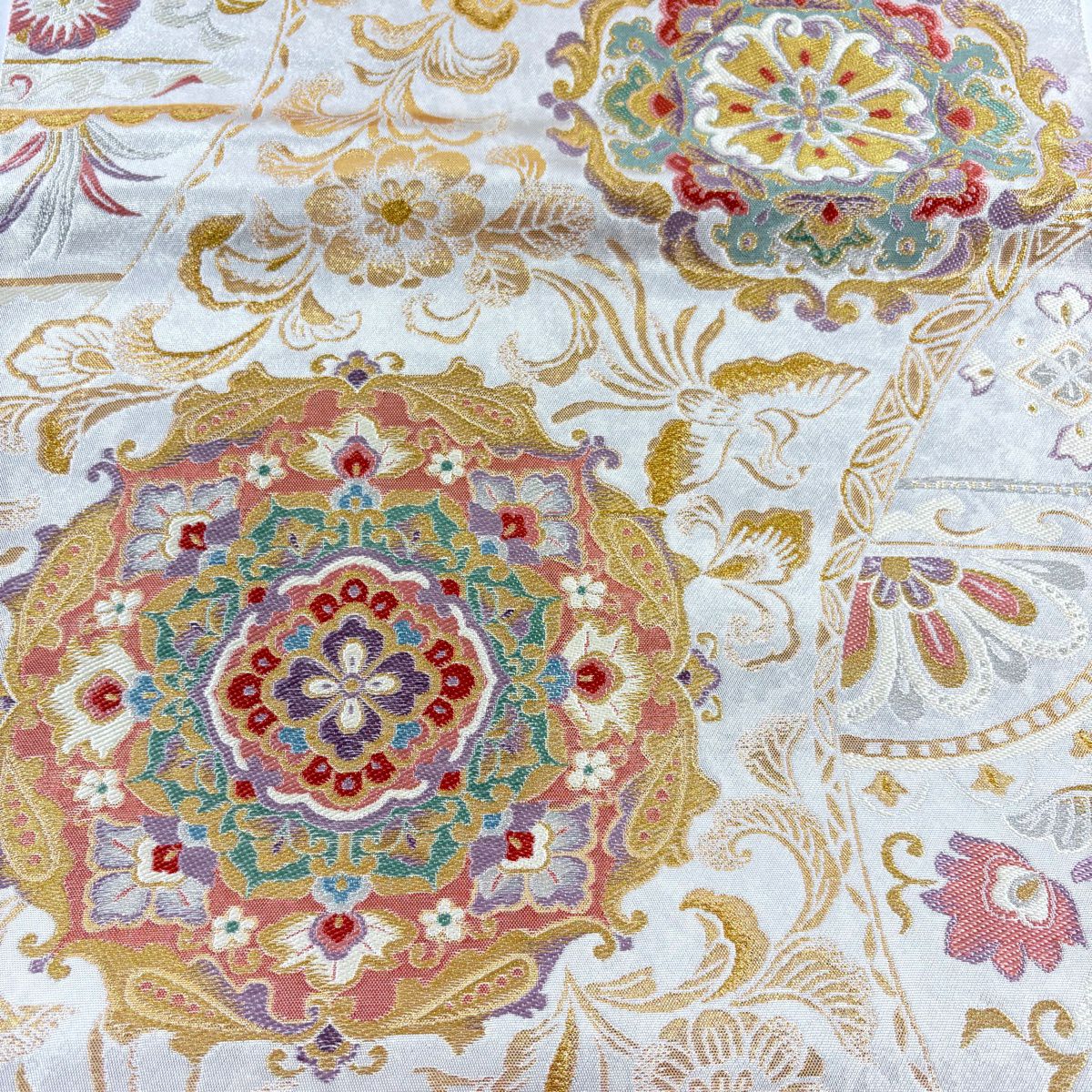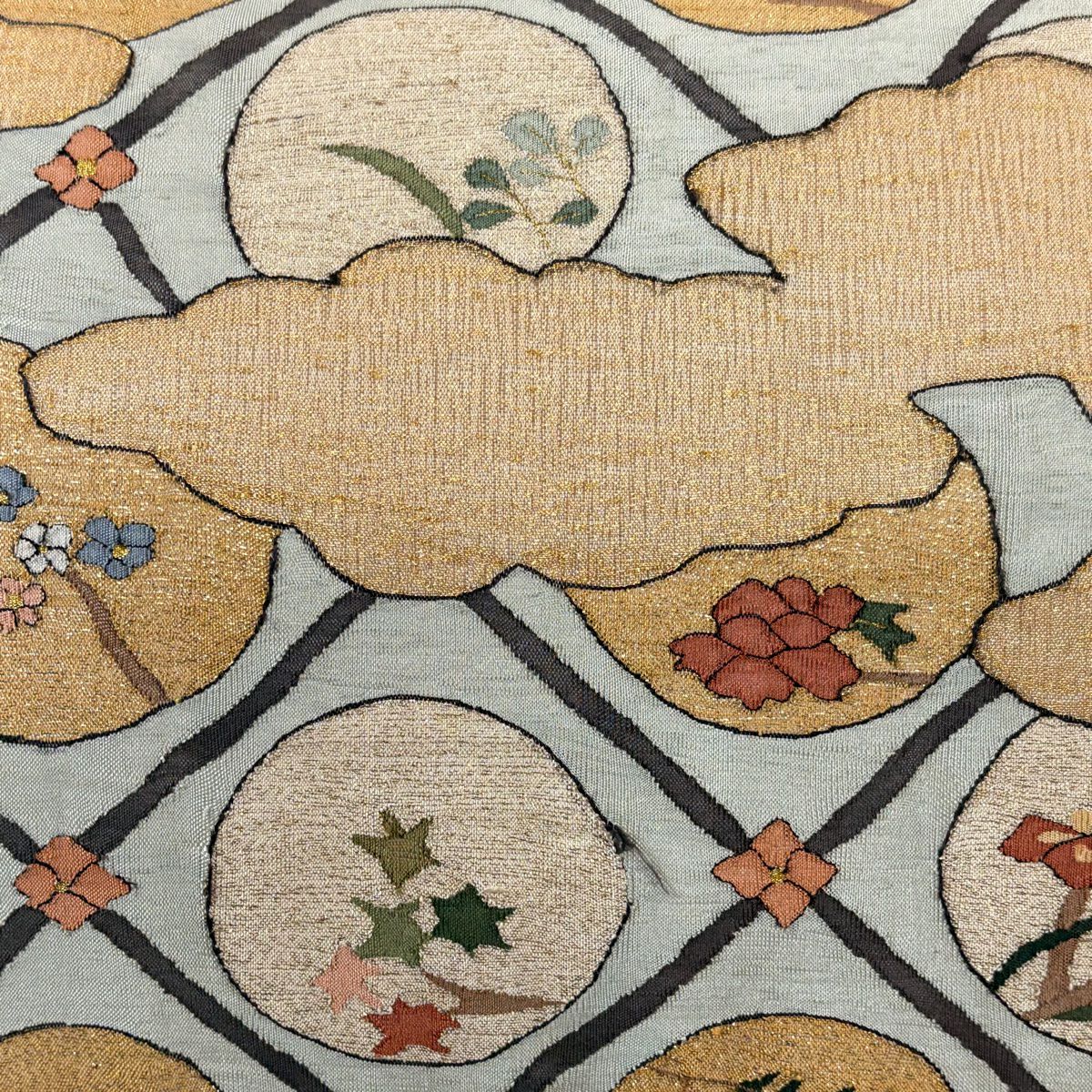 袋帯 逸品 草花 七宝 金糸 クリーム 六通 正絹