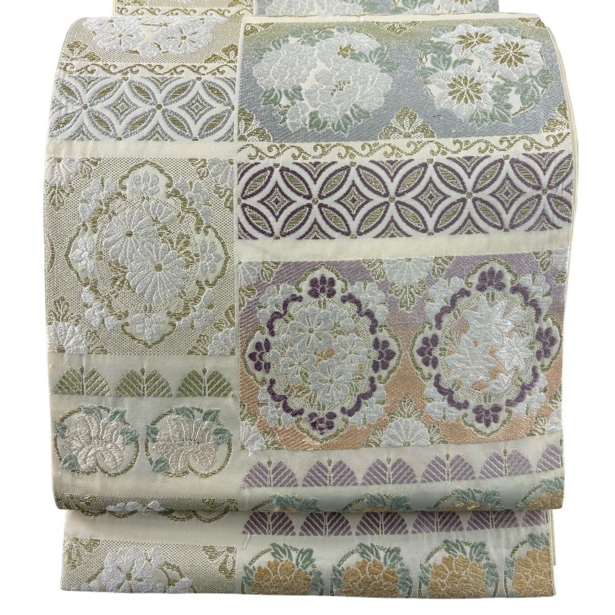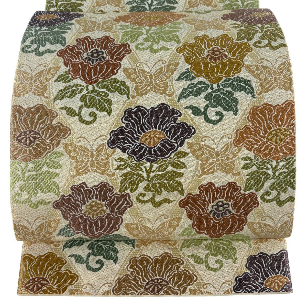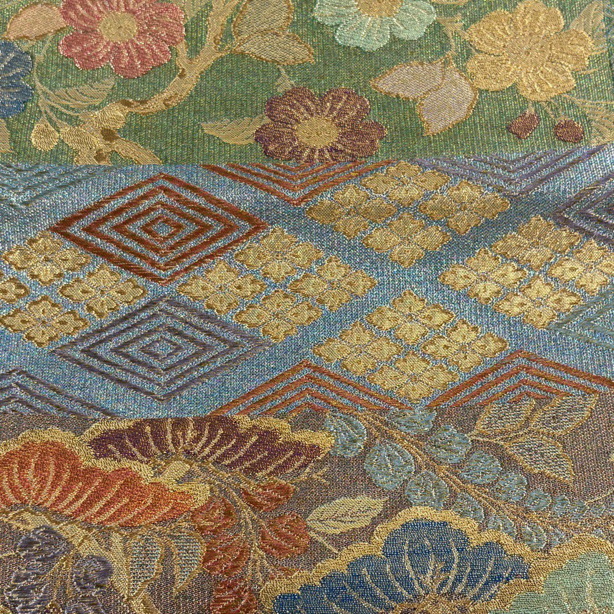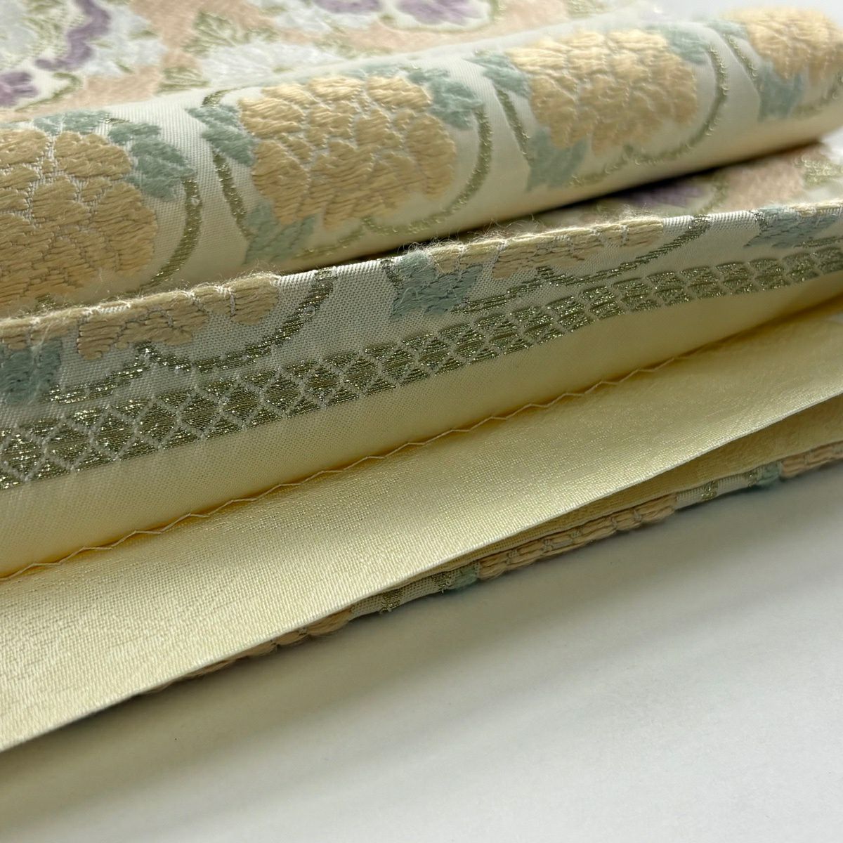 袋帯 逸品 草花 七宝 金糸 クリーム 六通 正絹