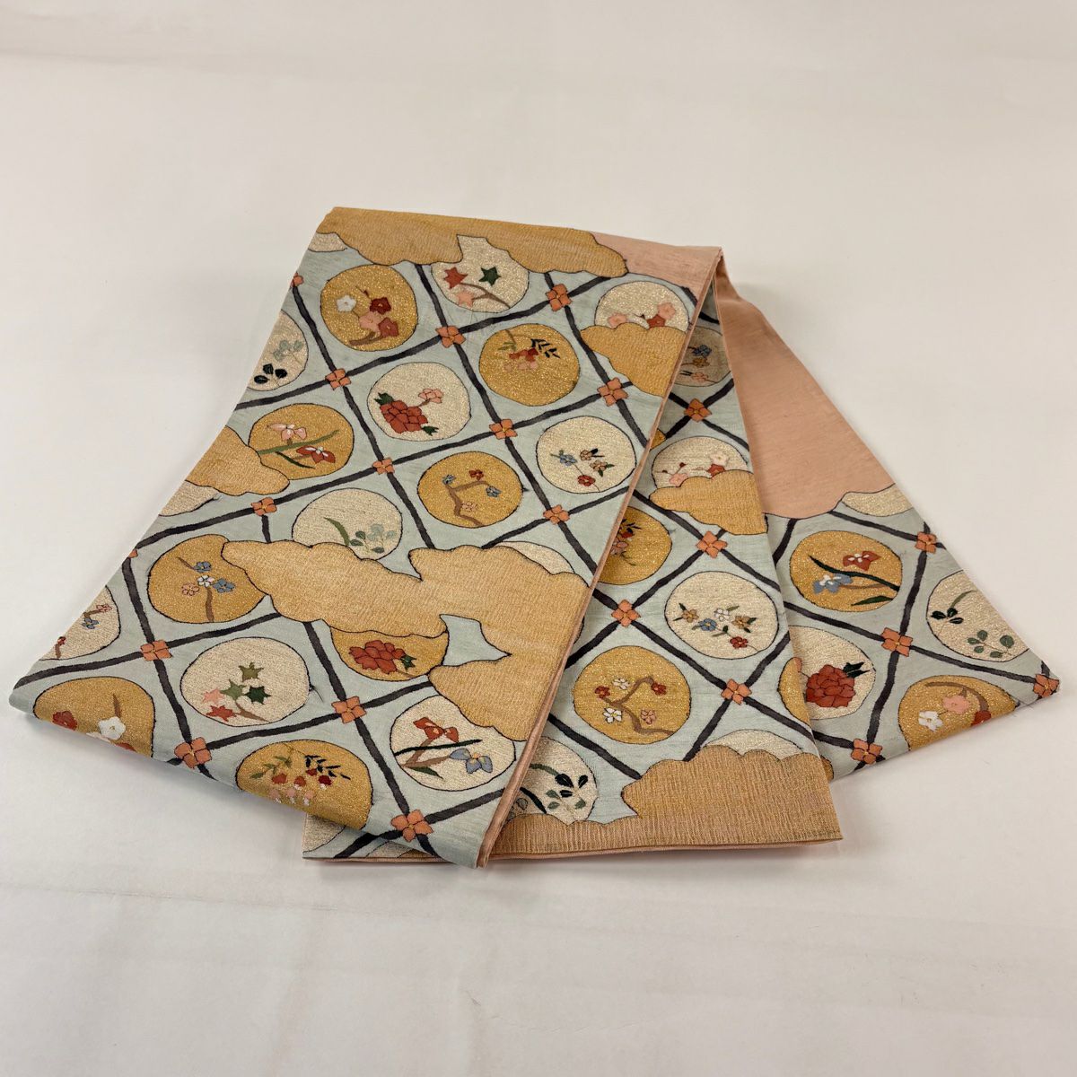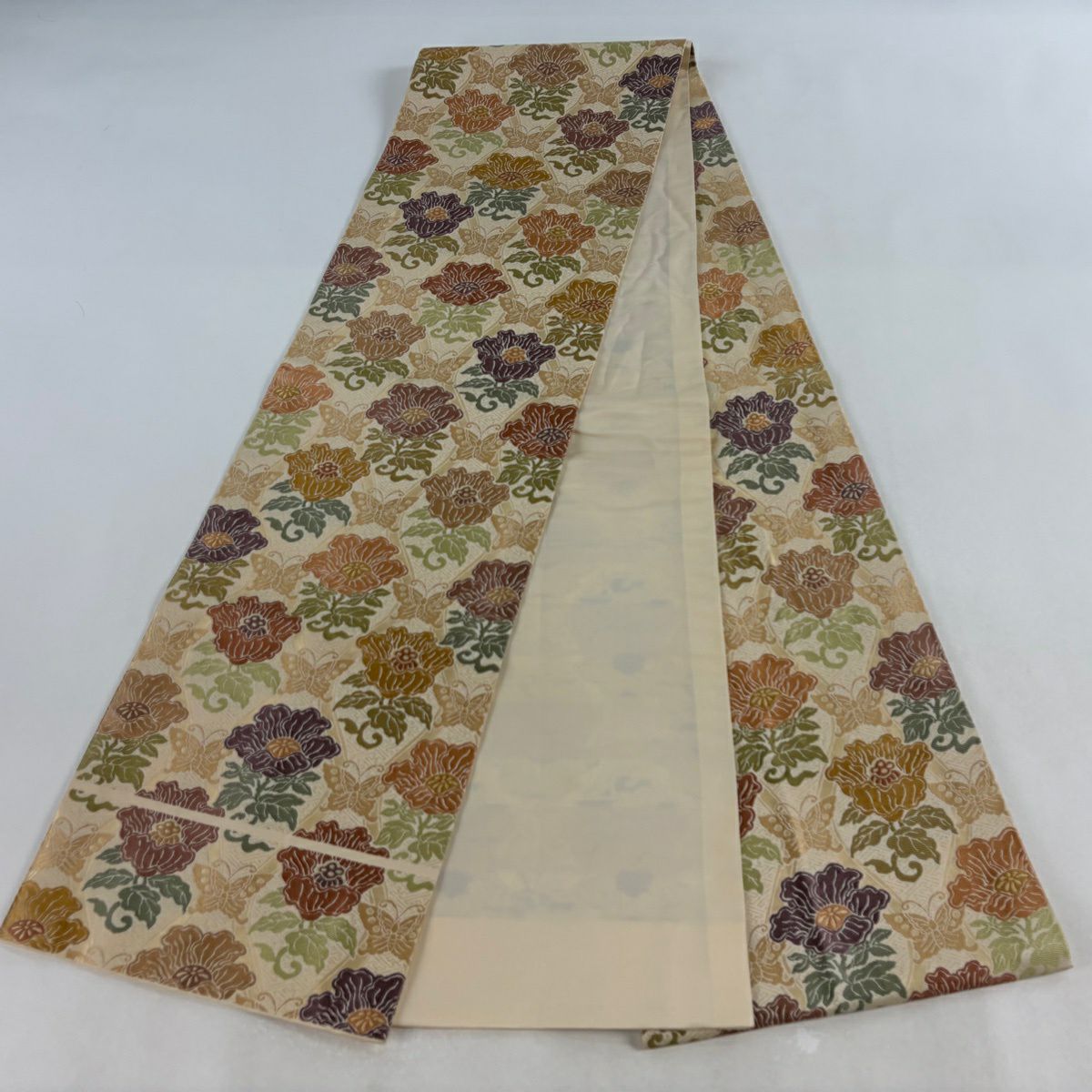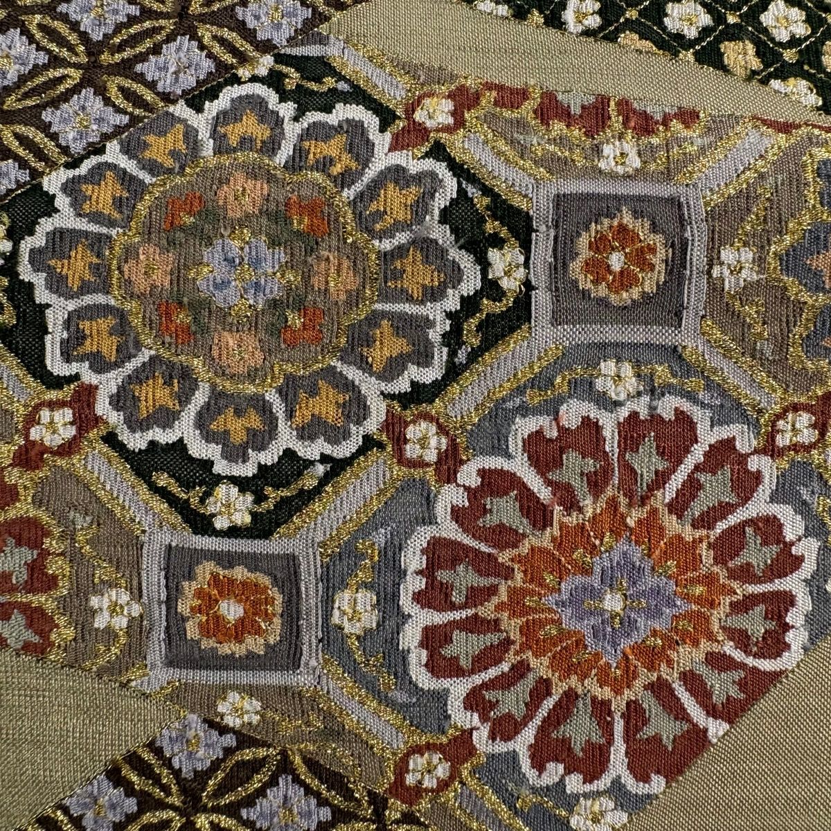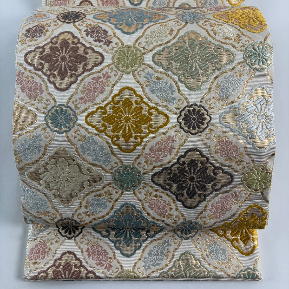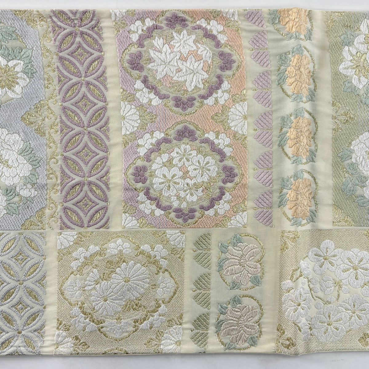 袋帯 逸品 草花 七宝 金糸 クリーム 六通 正絹