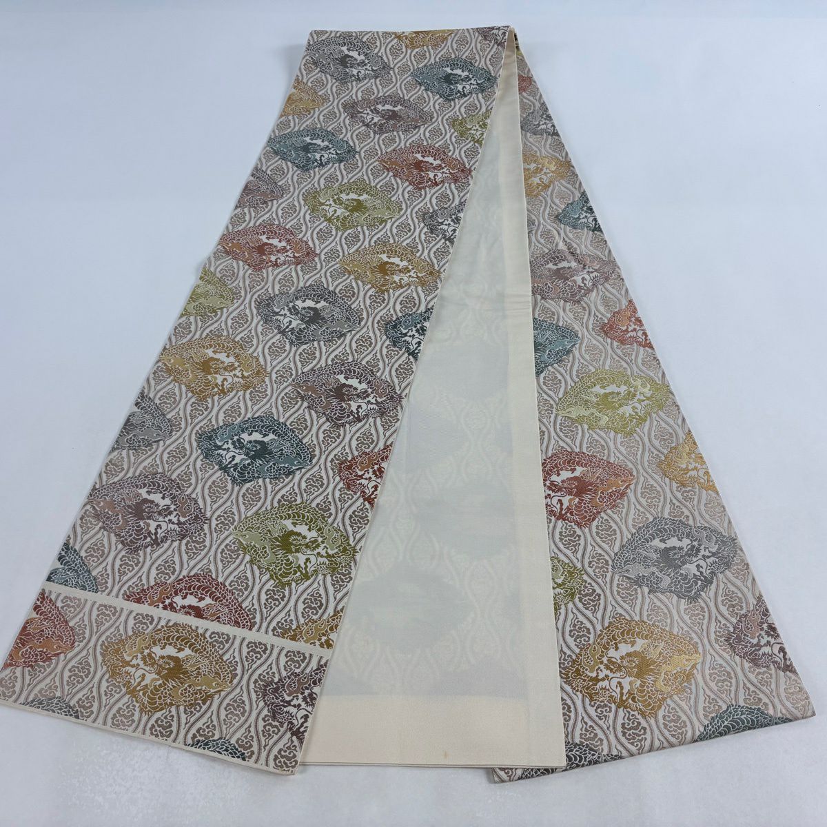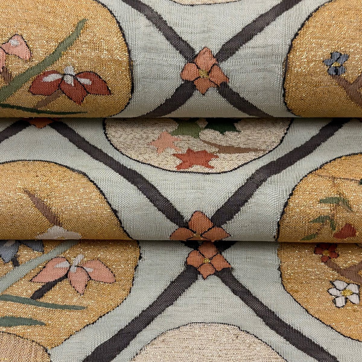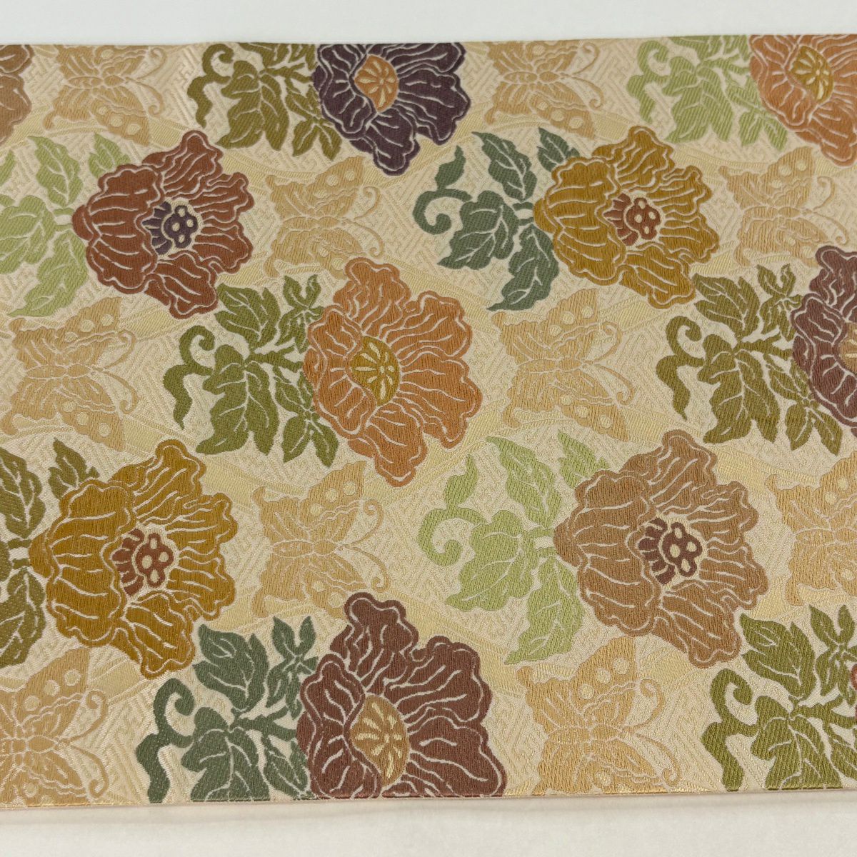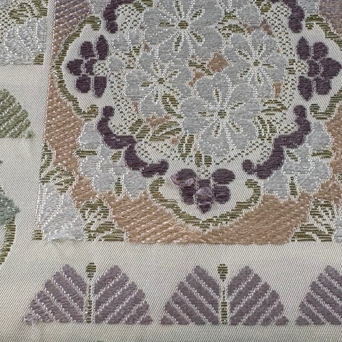 袋帯 逸品 草花 七宝 金糸 クリーム 六通 正絹