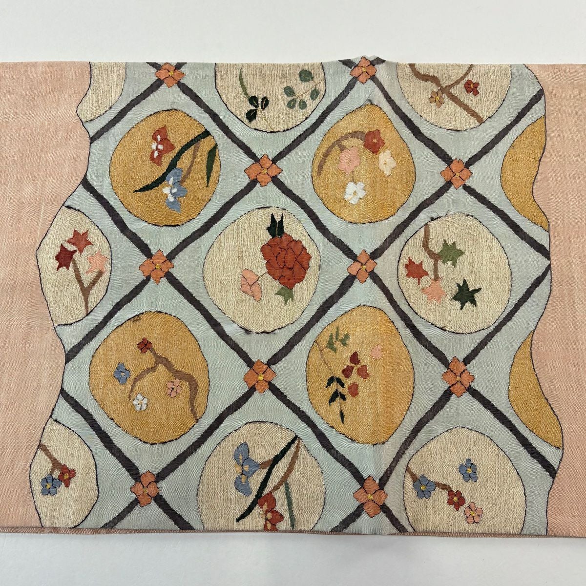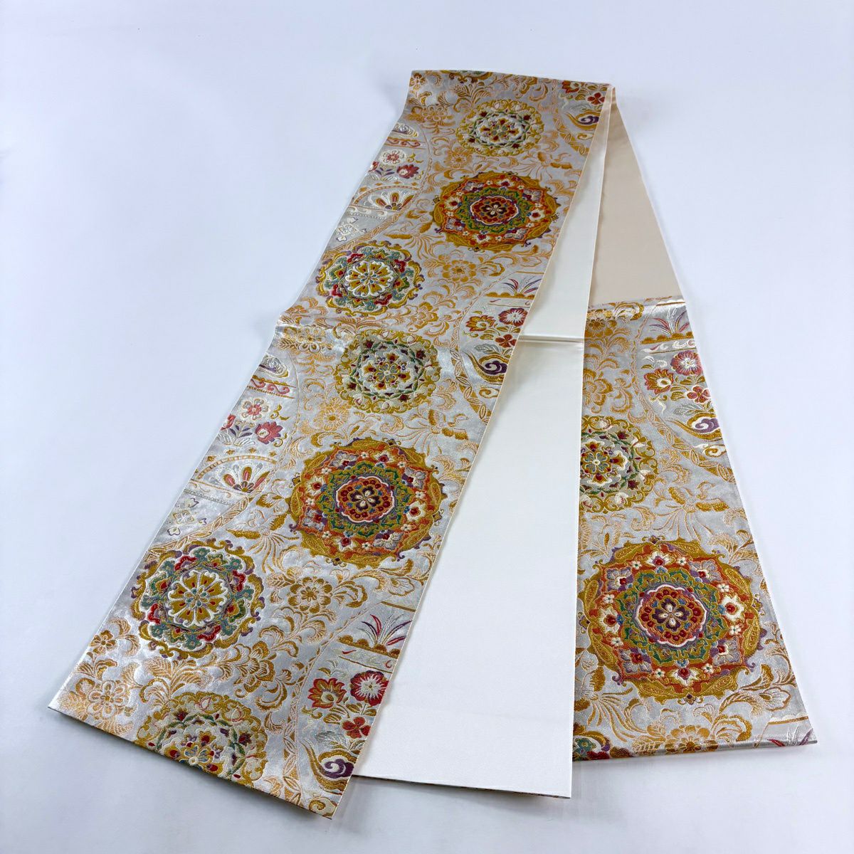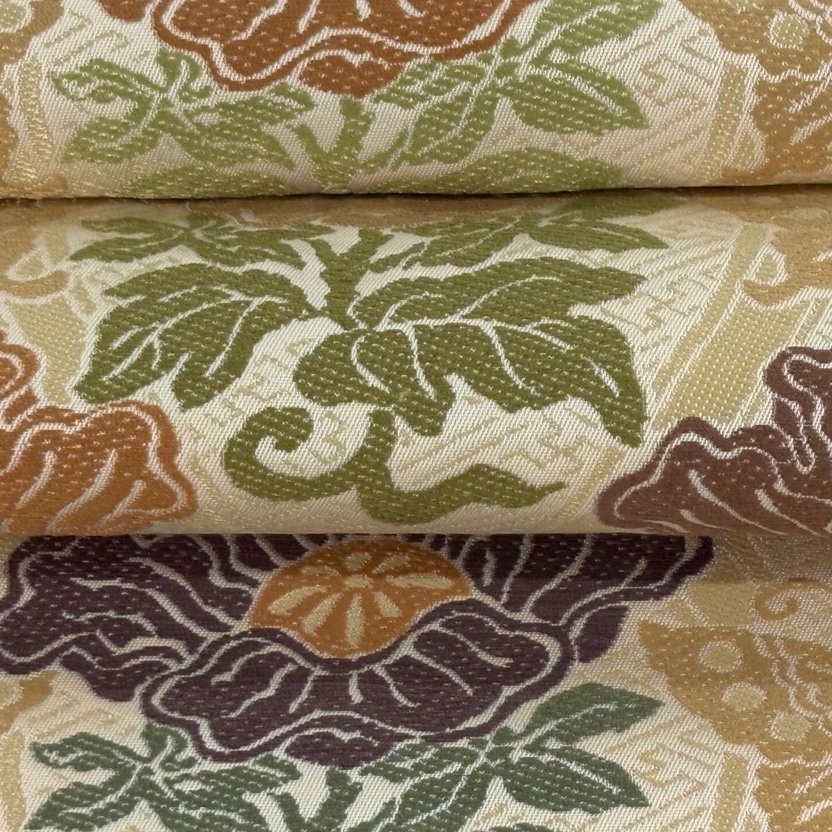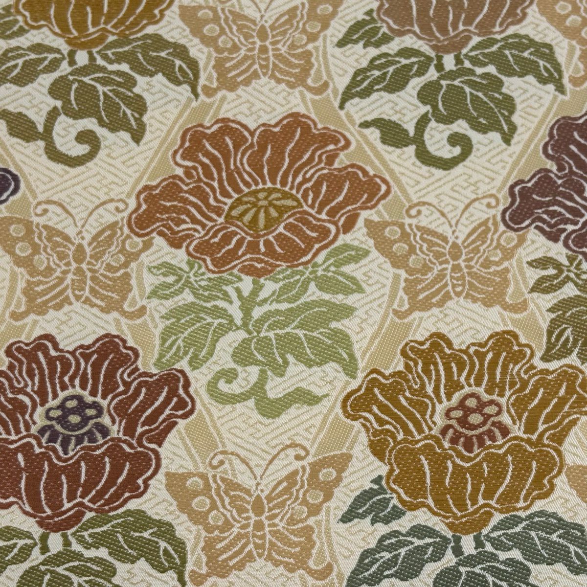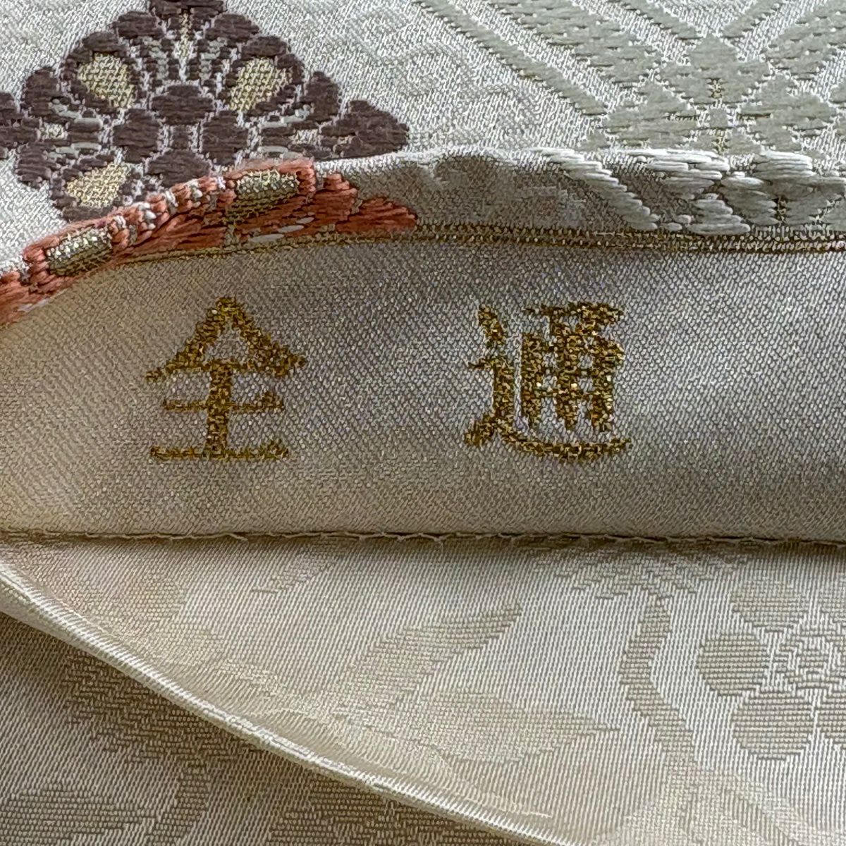 袋帯 逸品 草花 七宝 金糸 クリーム 六通 正絹