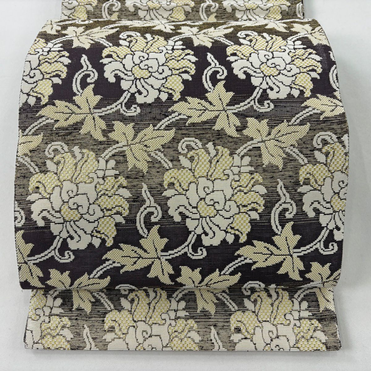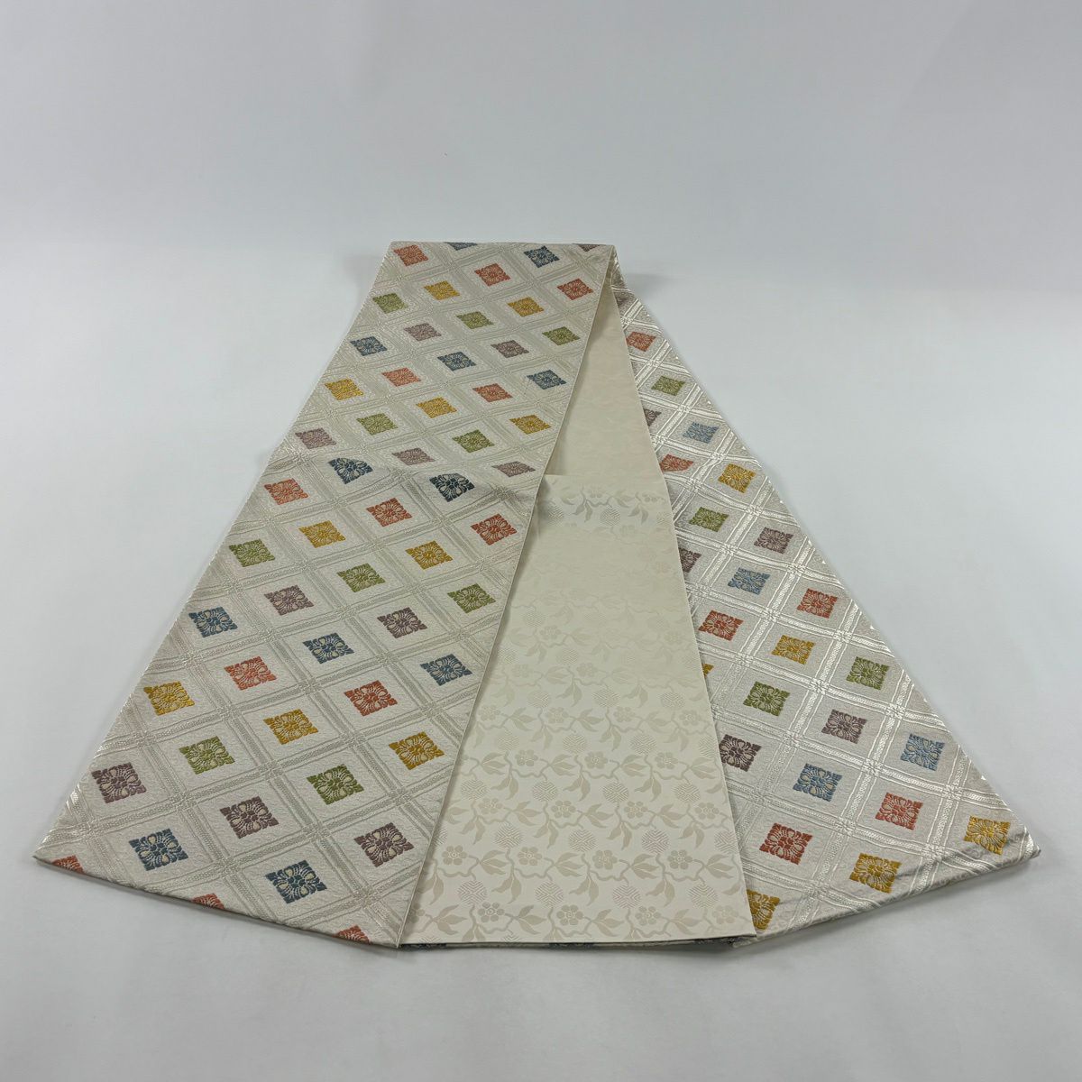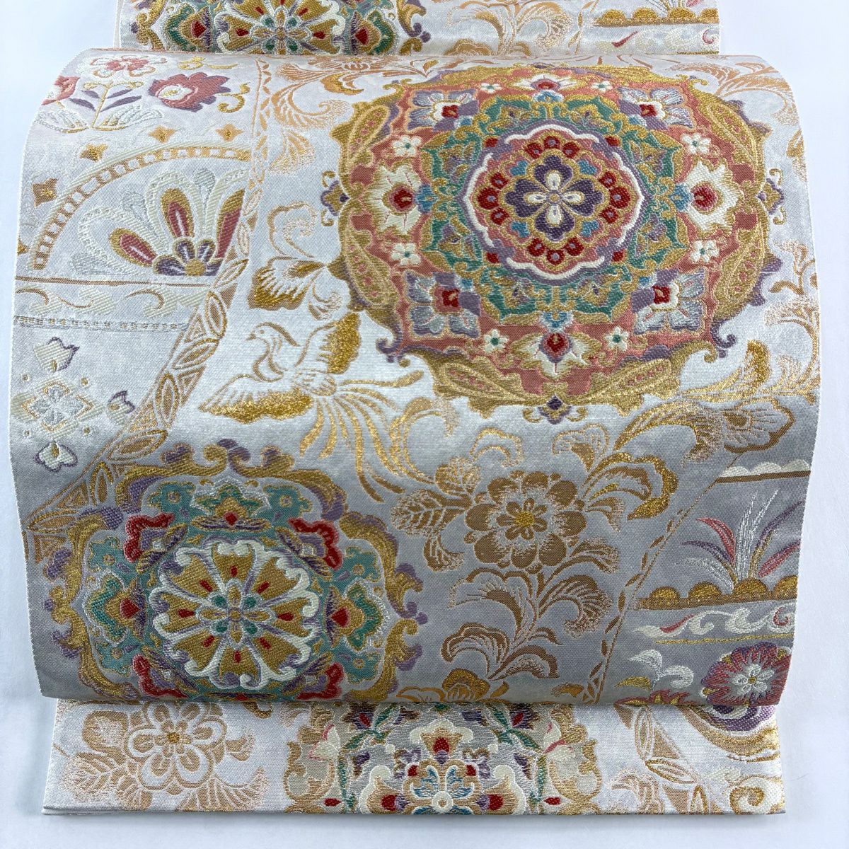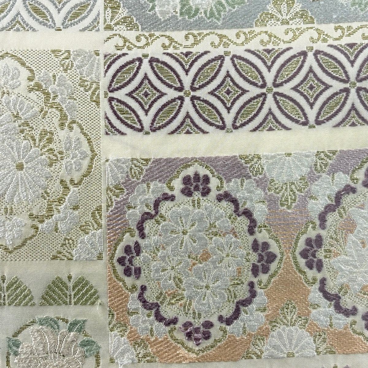 袋帯 逸品 草花 七宝 金糸 クリーム 六通 正絹