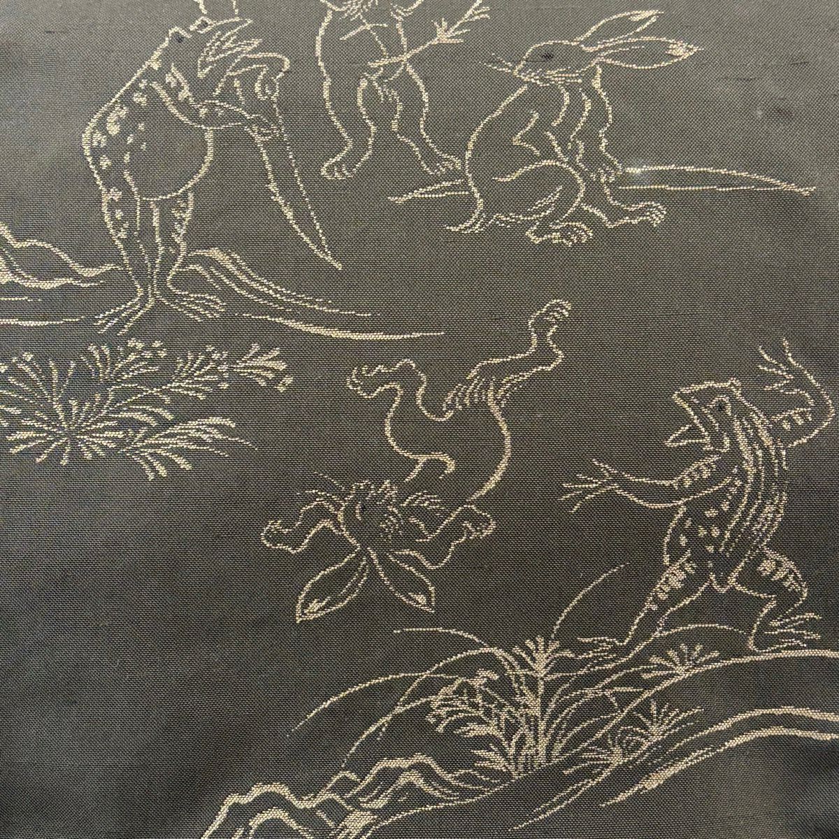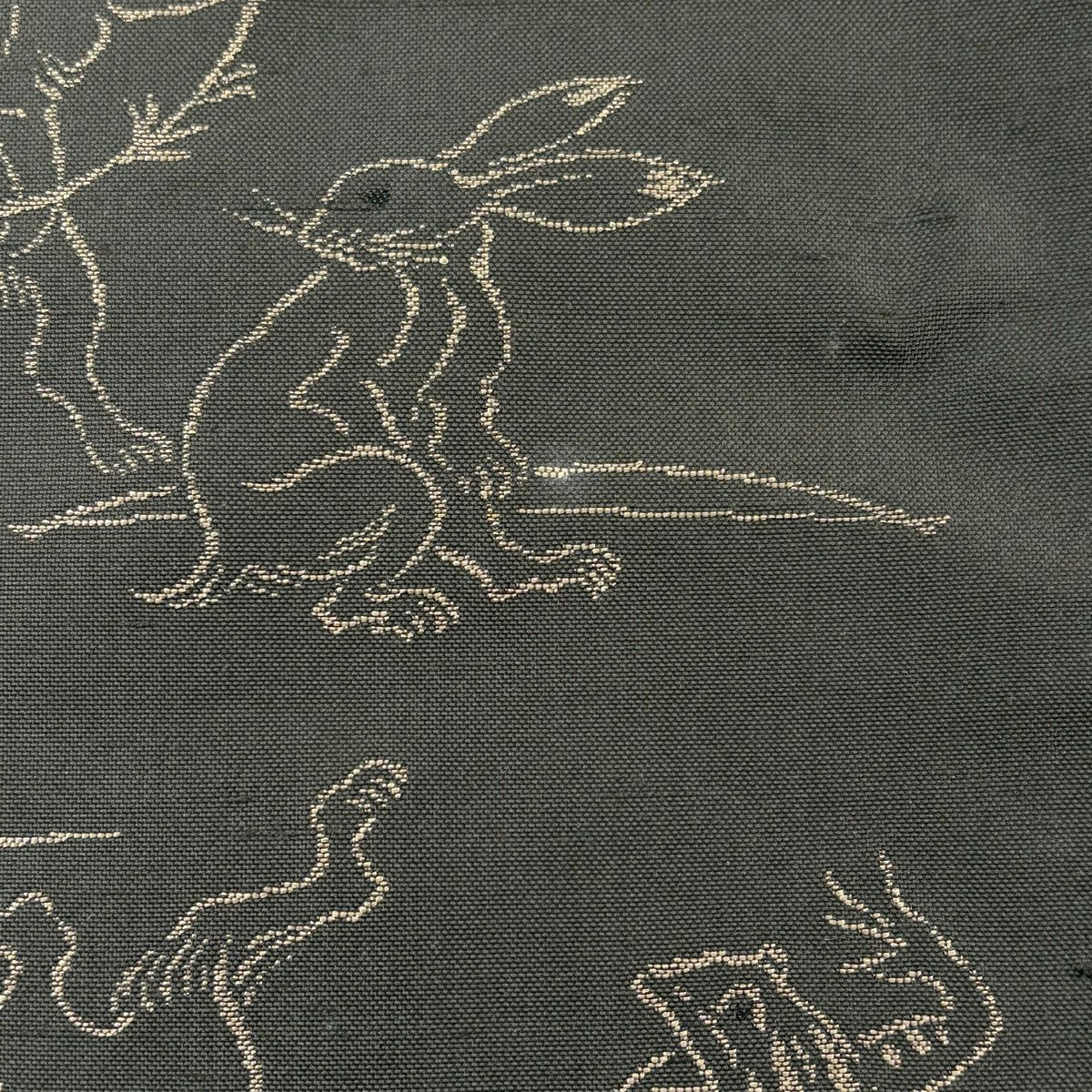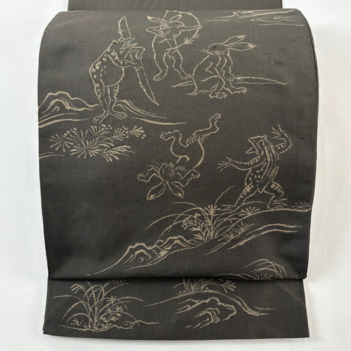 袋帯 逸品 紬地 鳥獣戯画 焦茶色 お太鼓柄 正絹