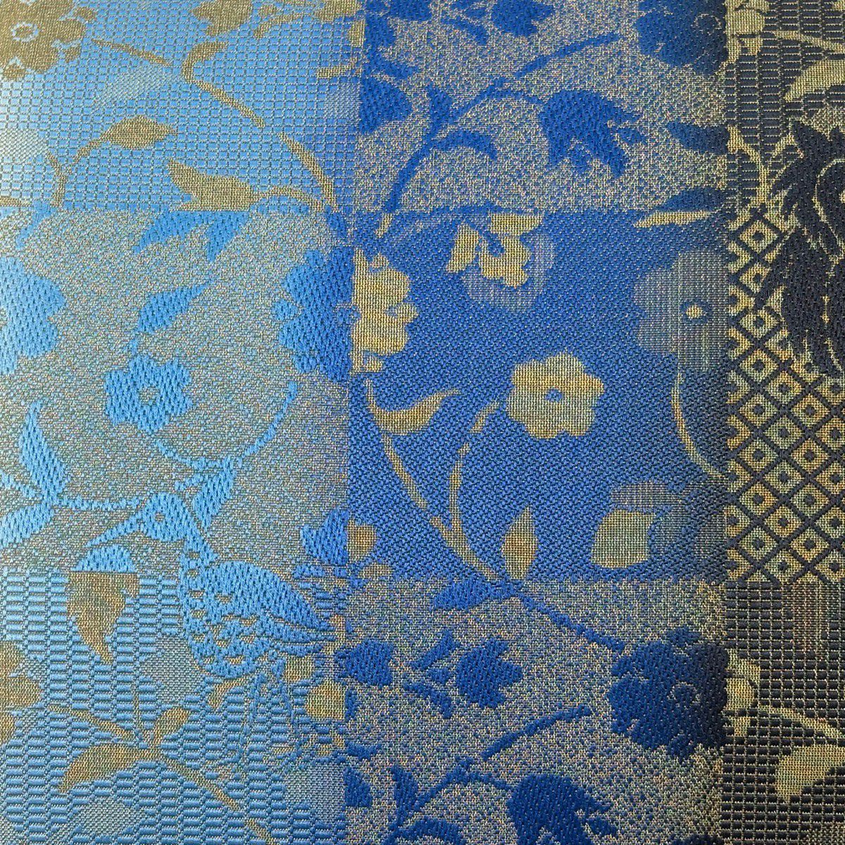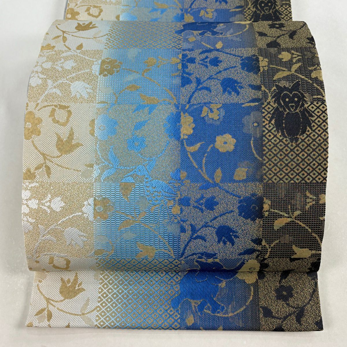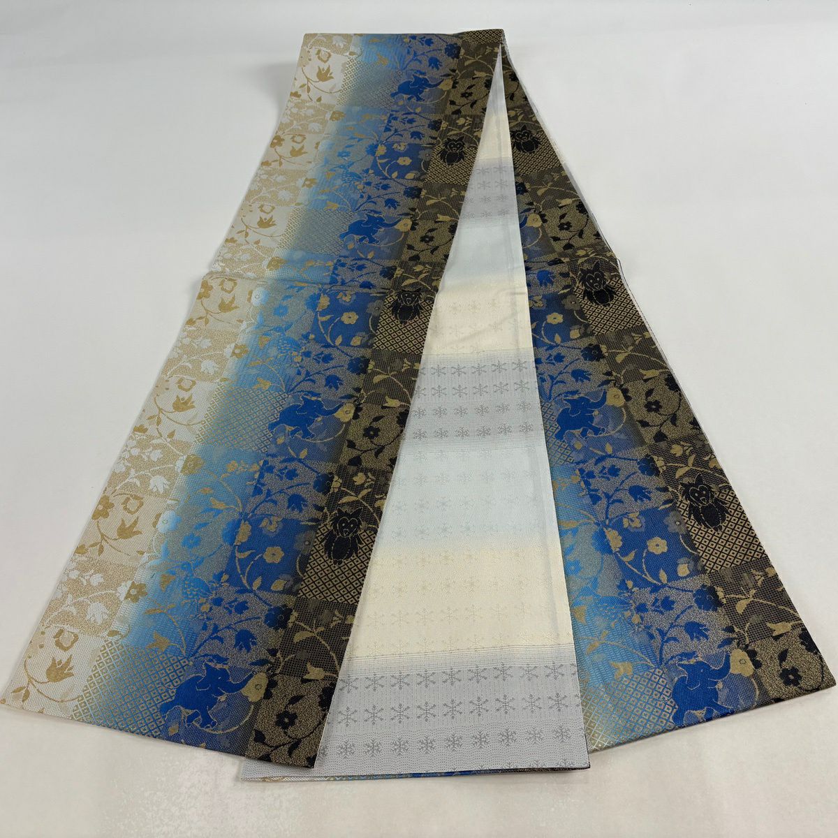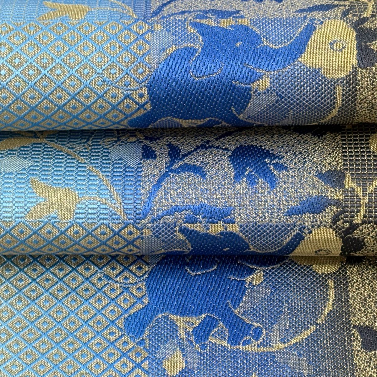 袋帯 逸品 ゾウ フクロウ 金糸 青 全通 正絹