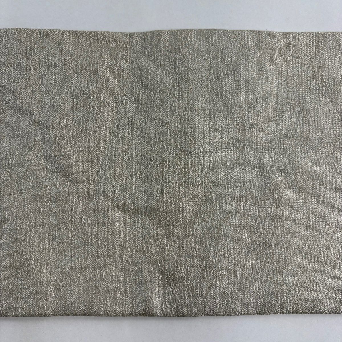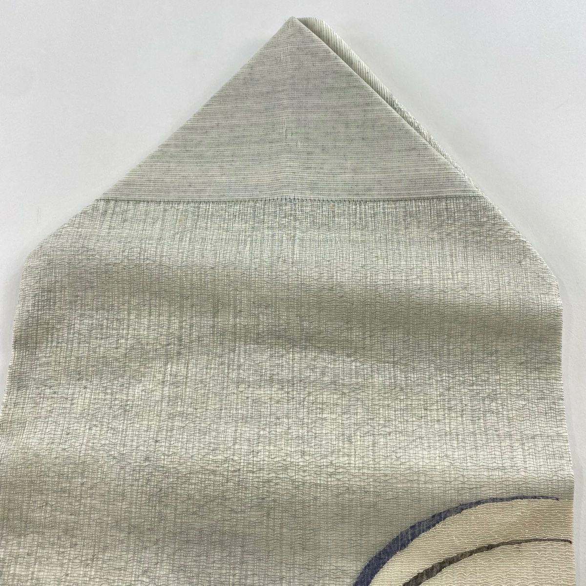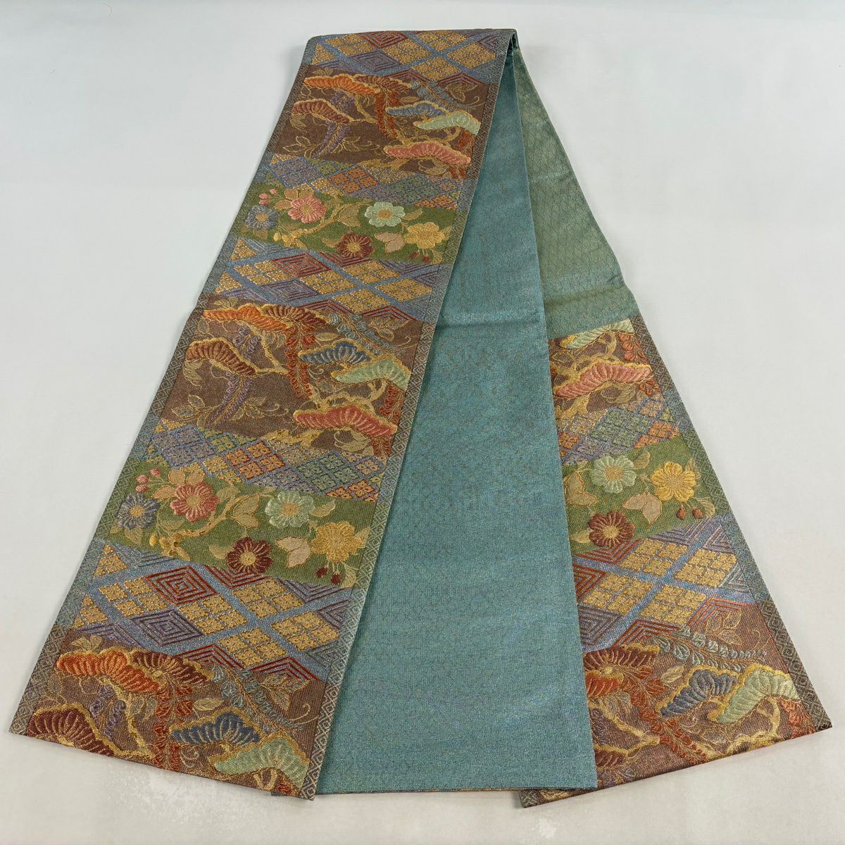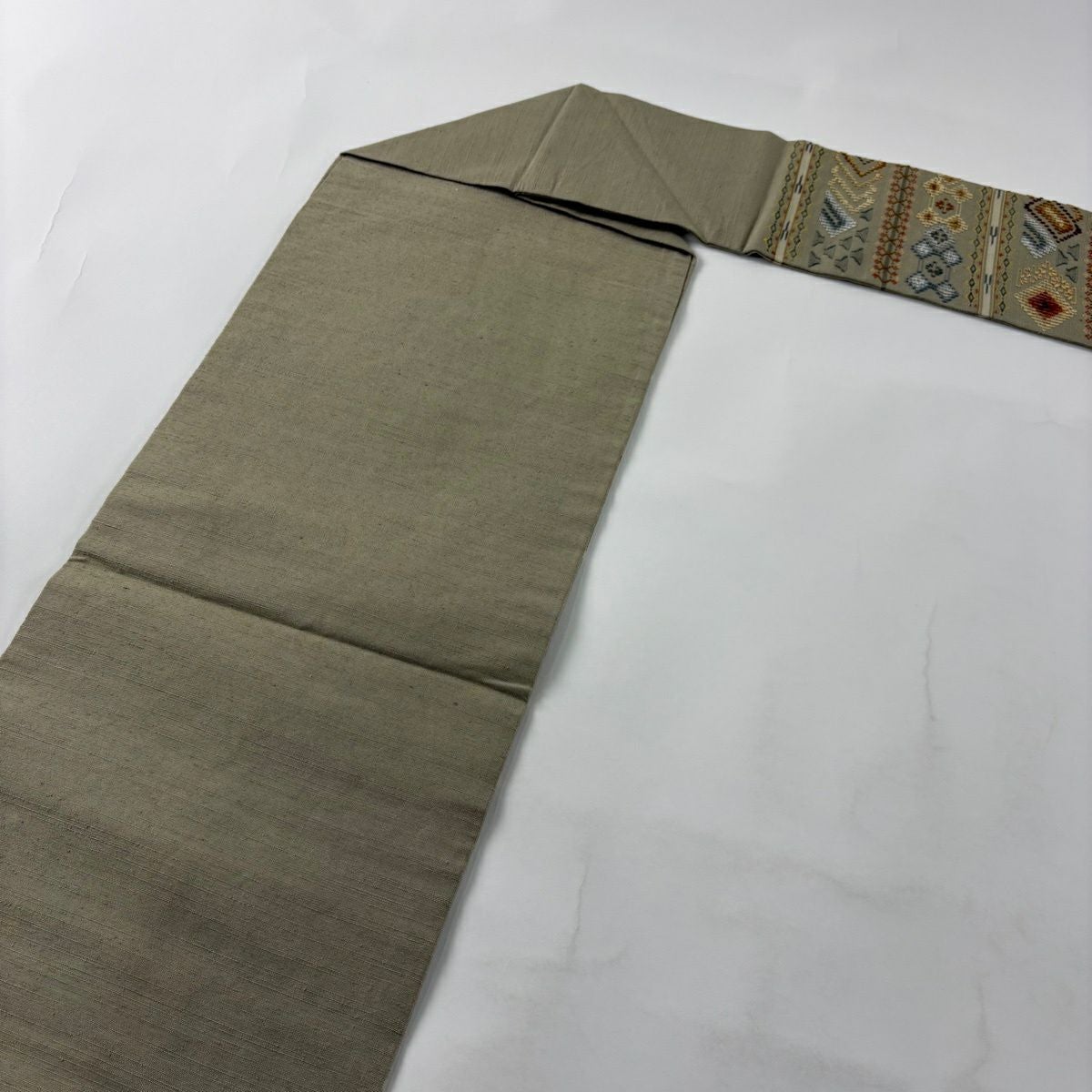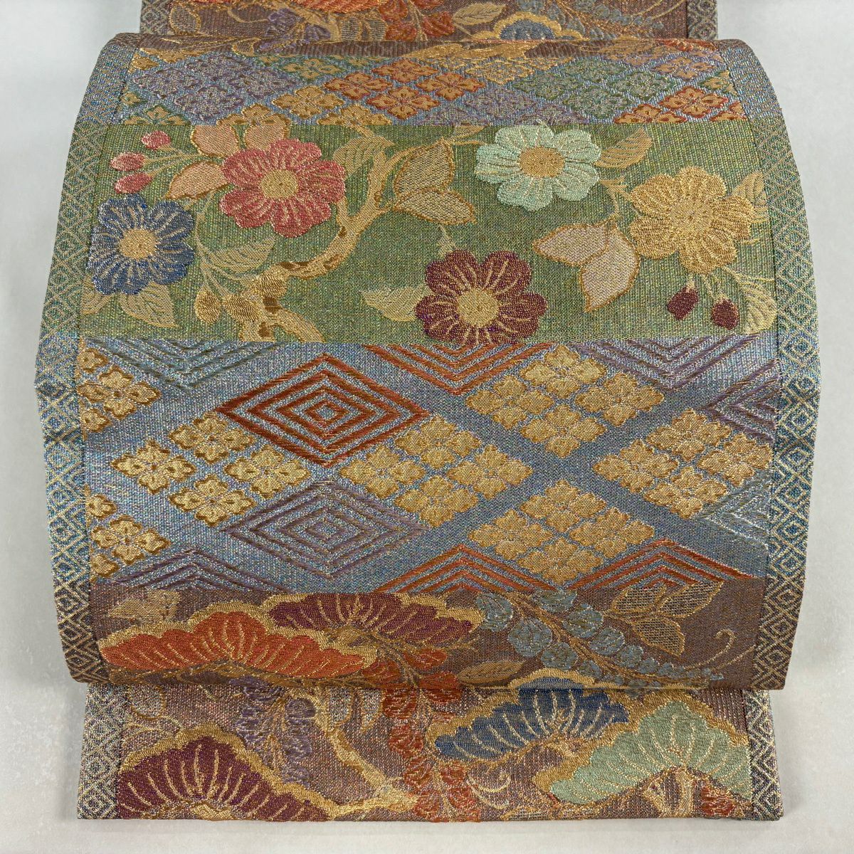 名古屋帯 逸品 紬地 幾何学模様 花織 灰緑 正絹