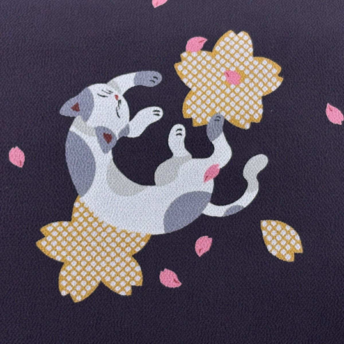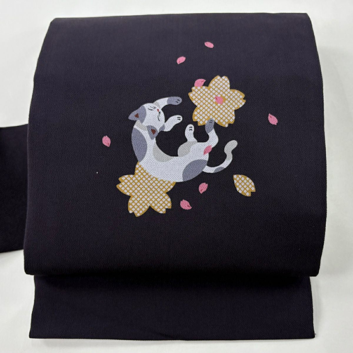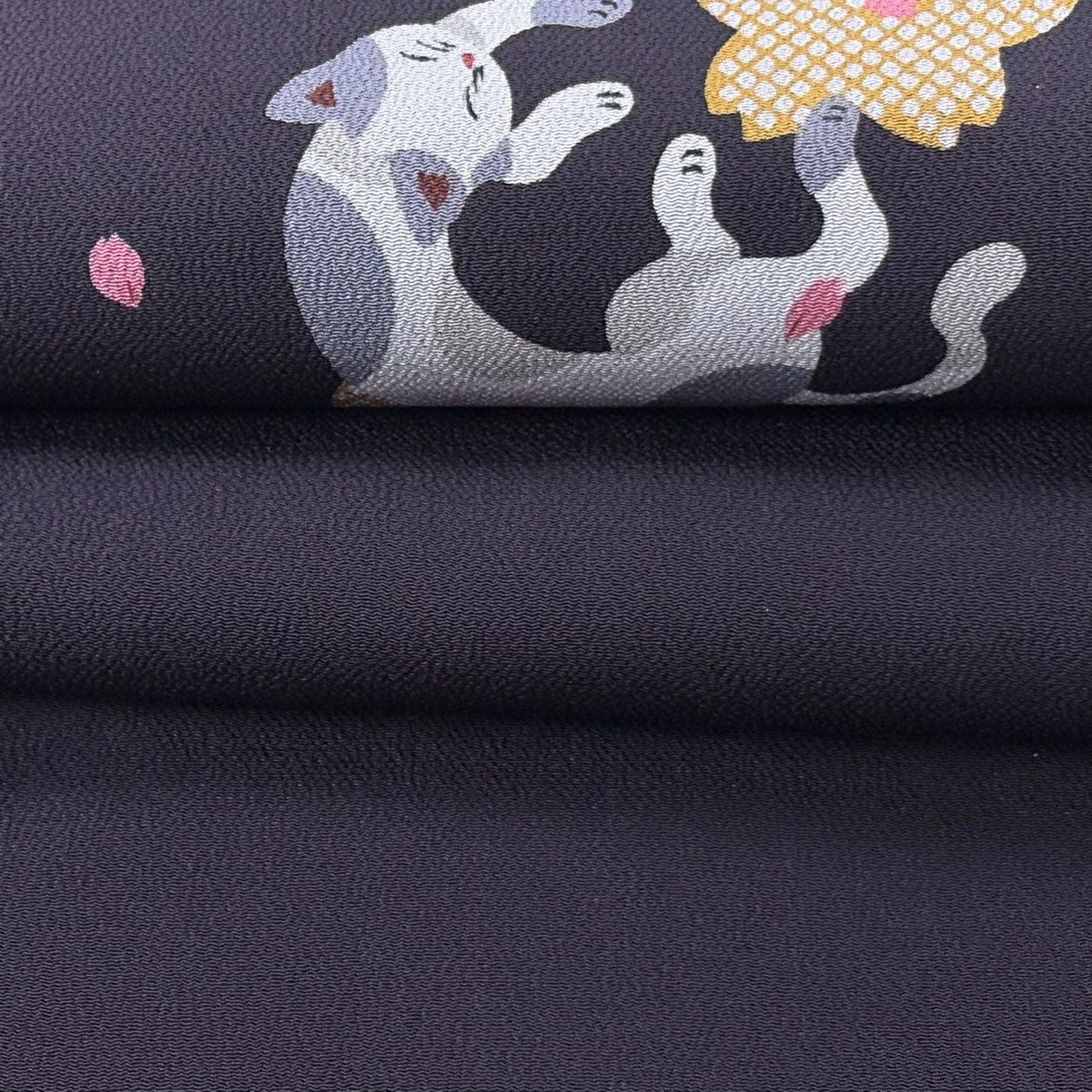 【美品】 名古屋帯 逸品 猫 桜 縮緬 濃紫 正絹