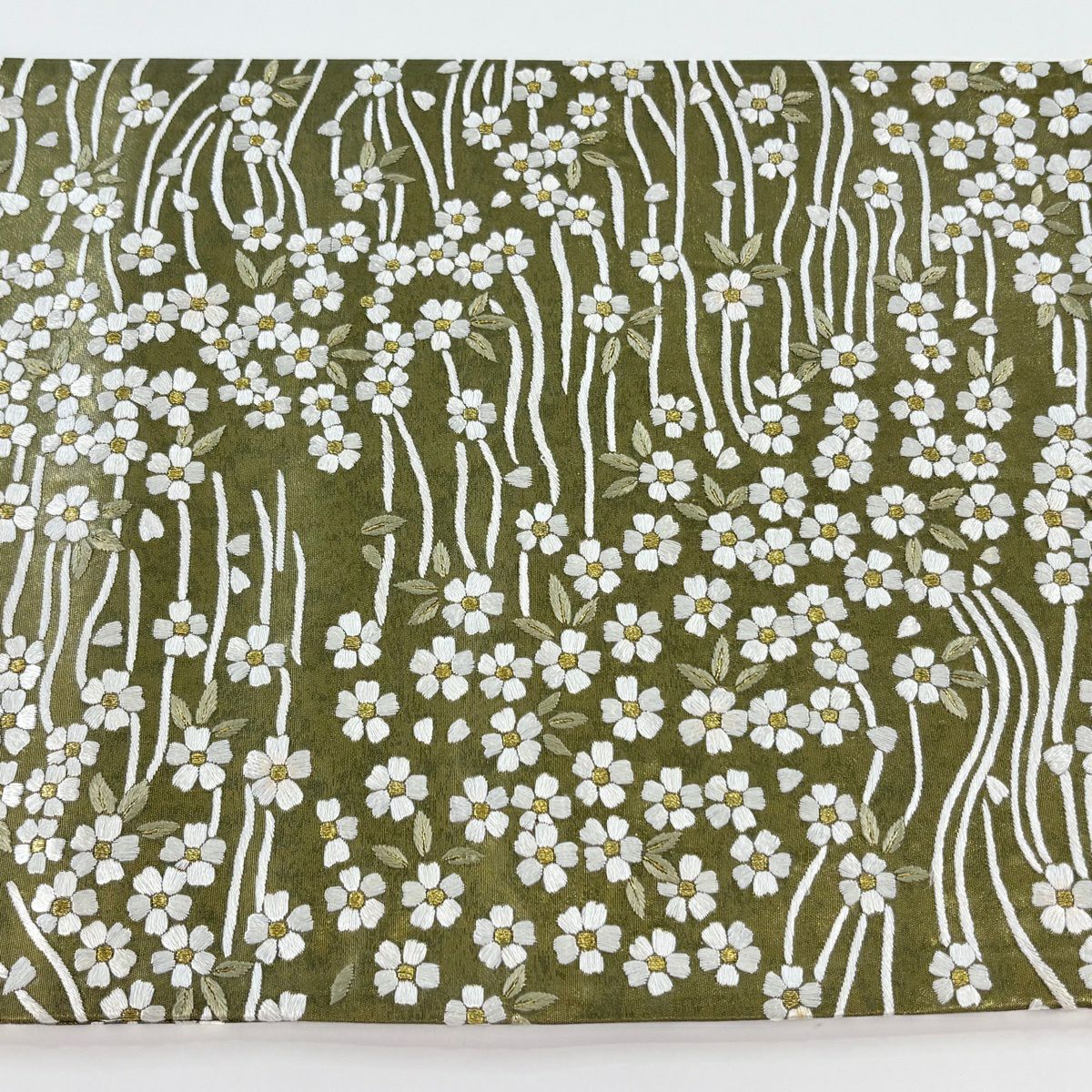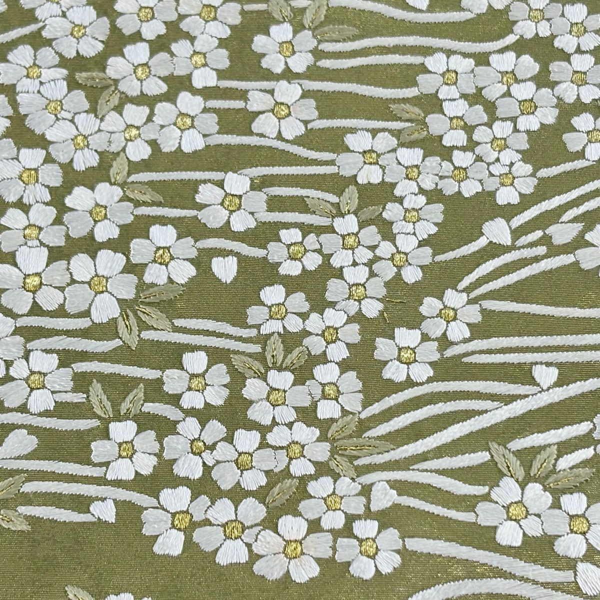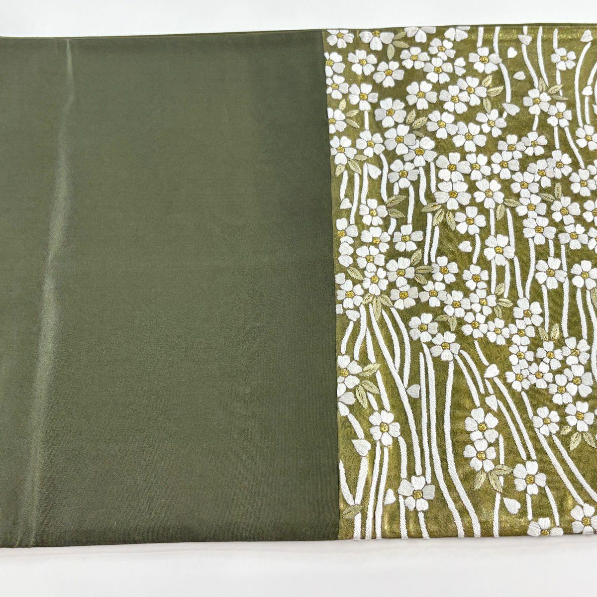 袋帯 逸品 桜 流水 金糸 刺繍 鶯色 六通 正絹