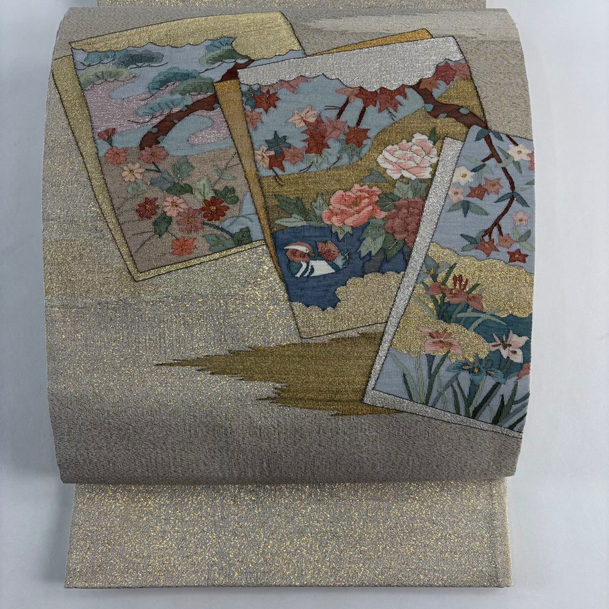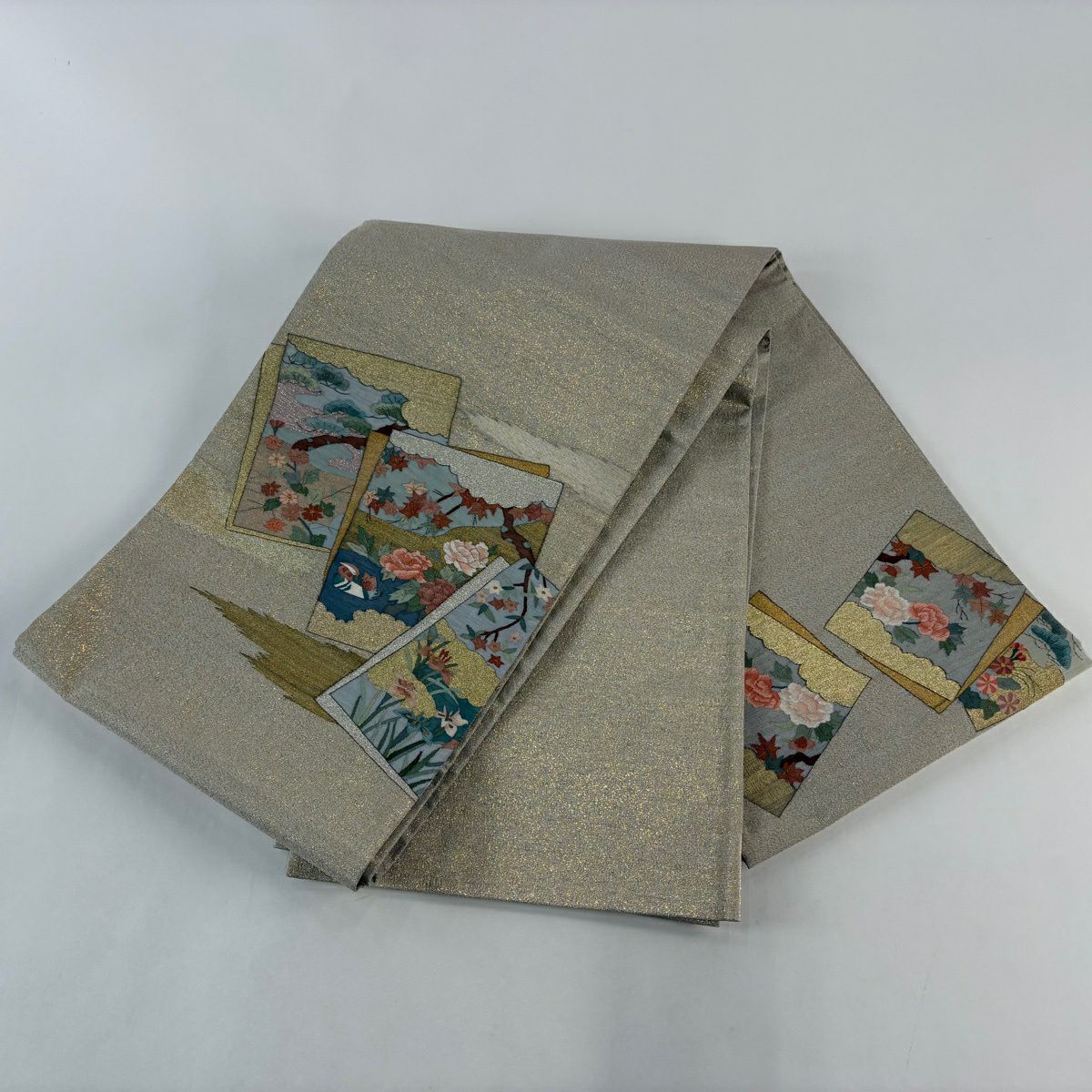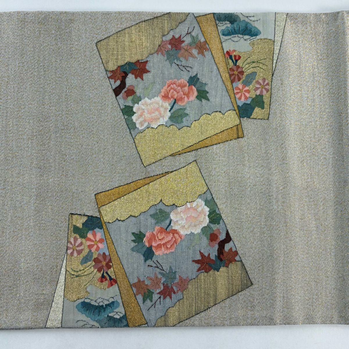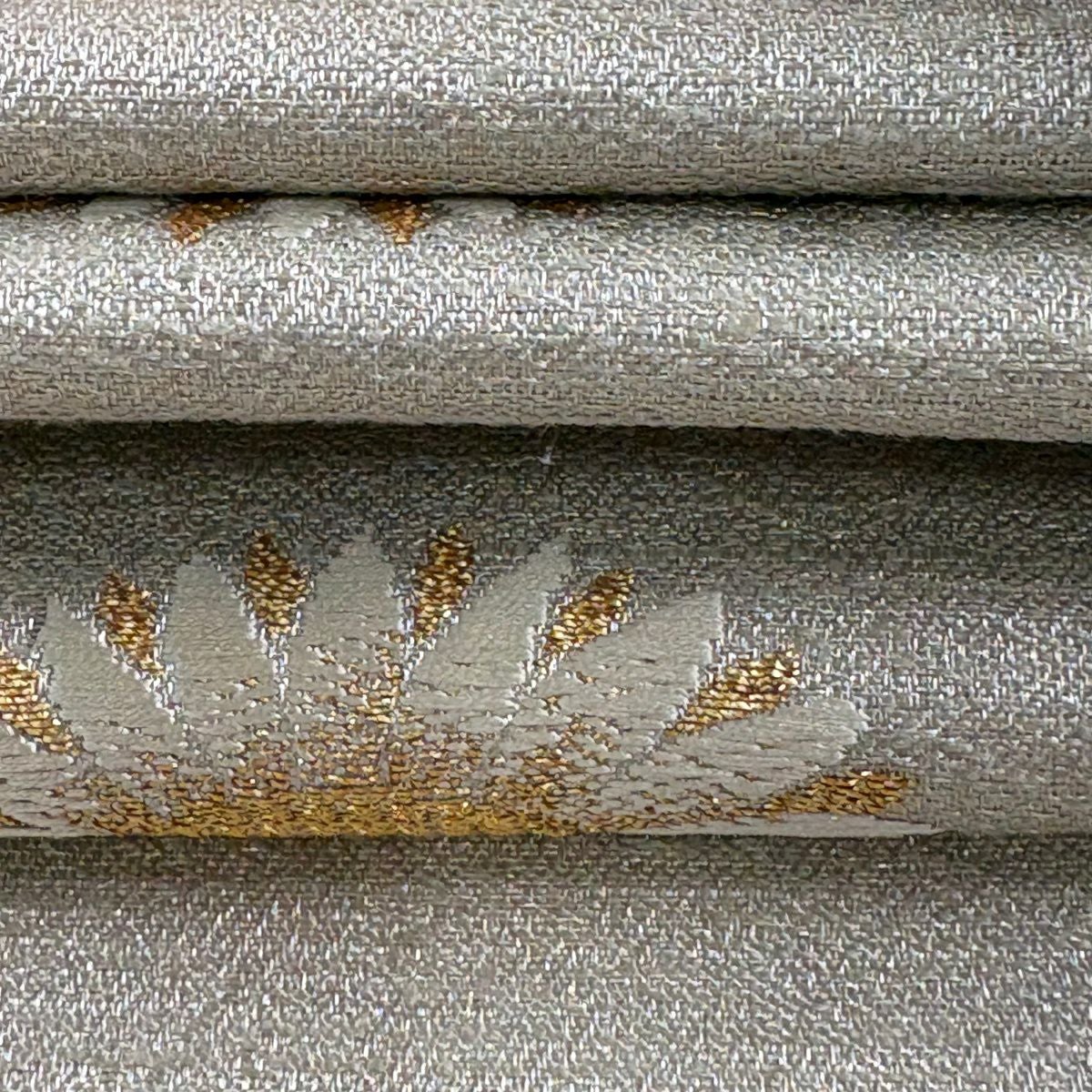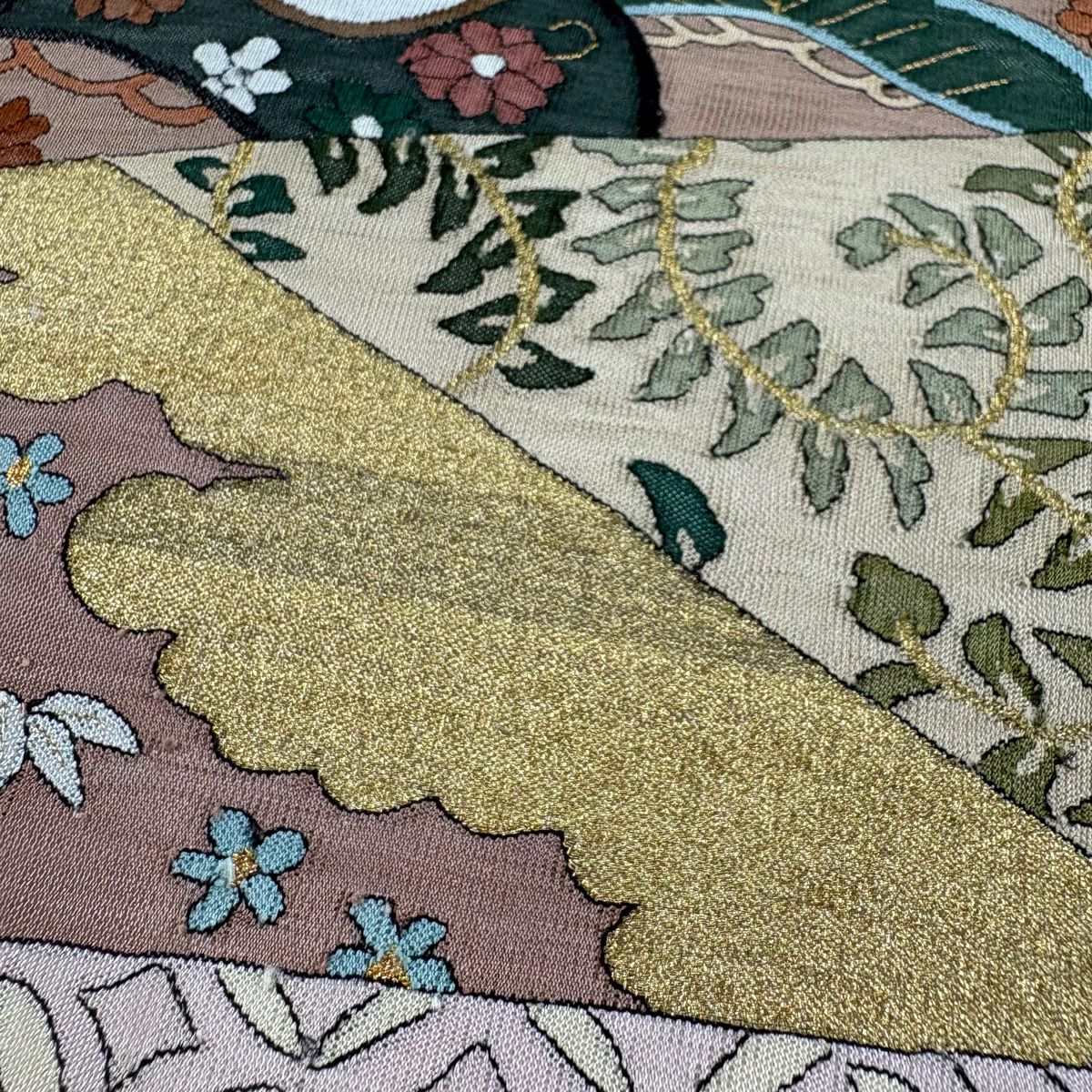 【美品】 名古屋帯 逸品 草花 金銀糸 灰茶 正絹