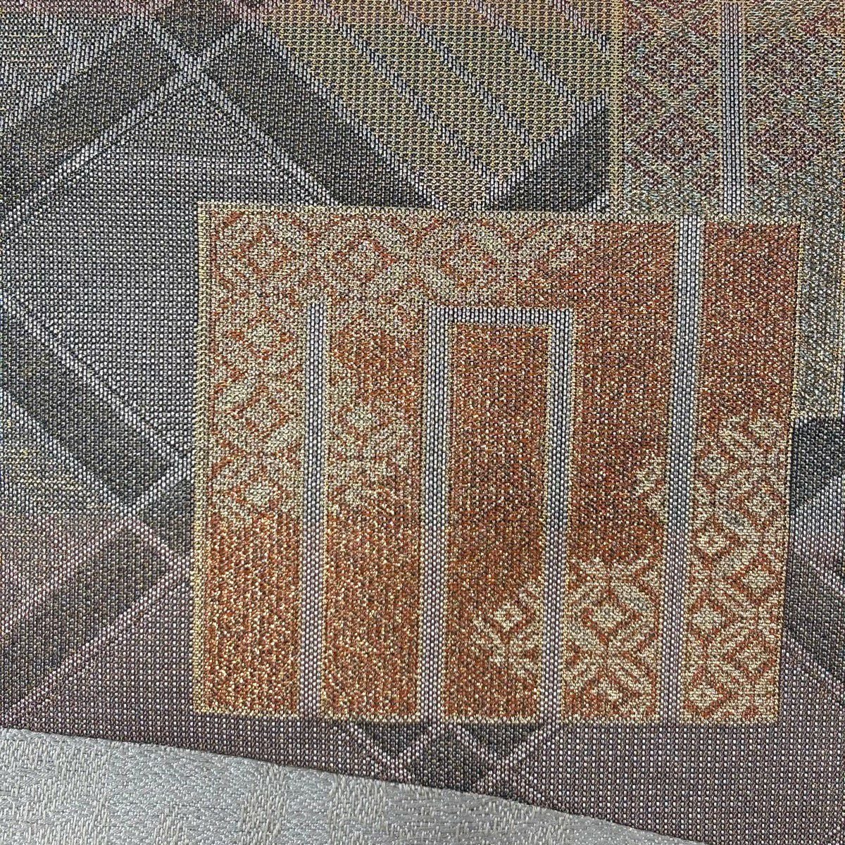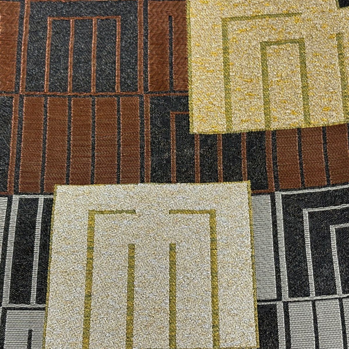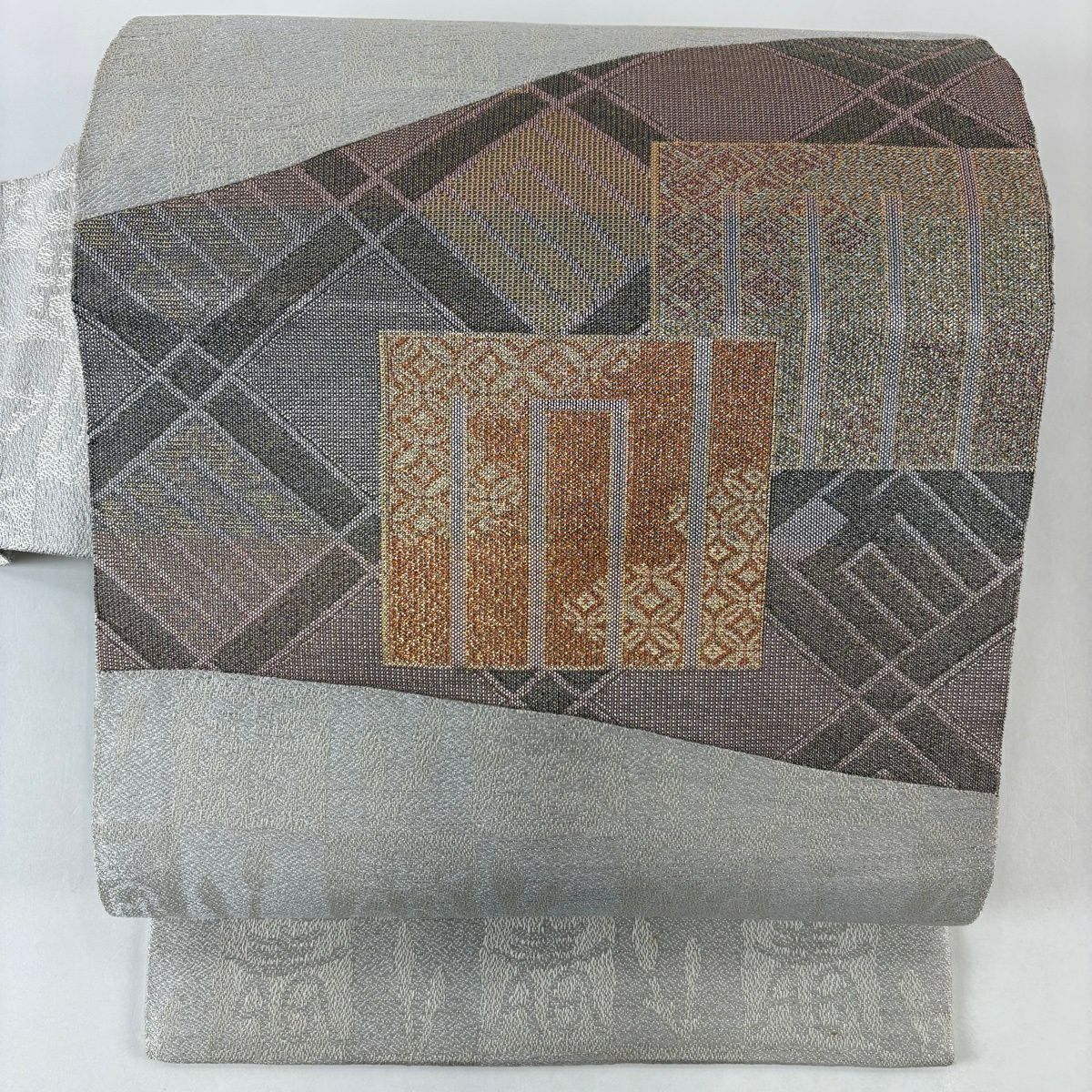名古屋帯 逸品 源氏香 市松 銀糸 箔 灰色 正絹