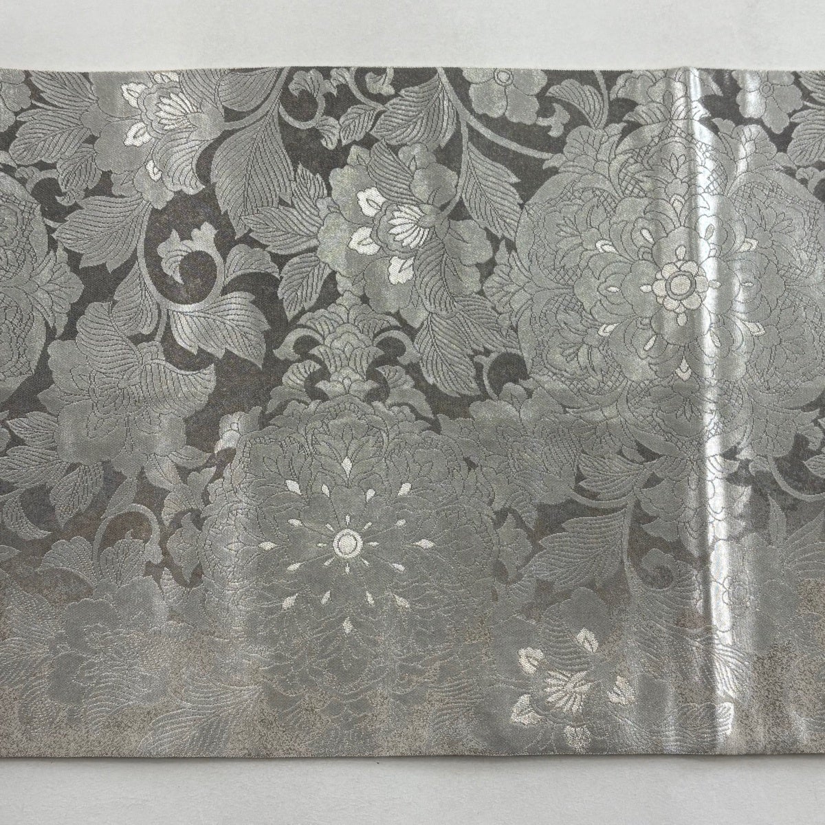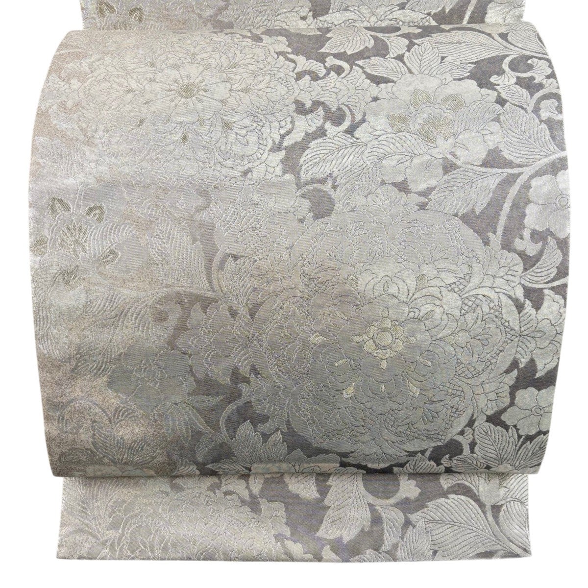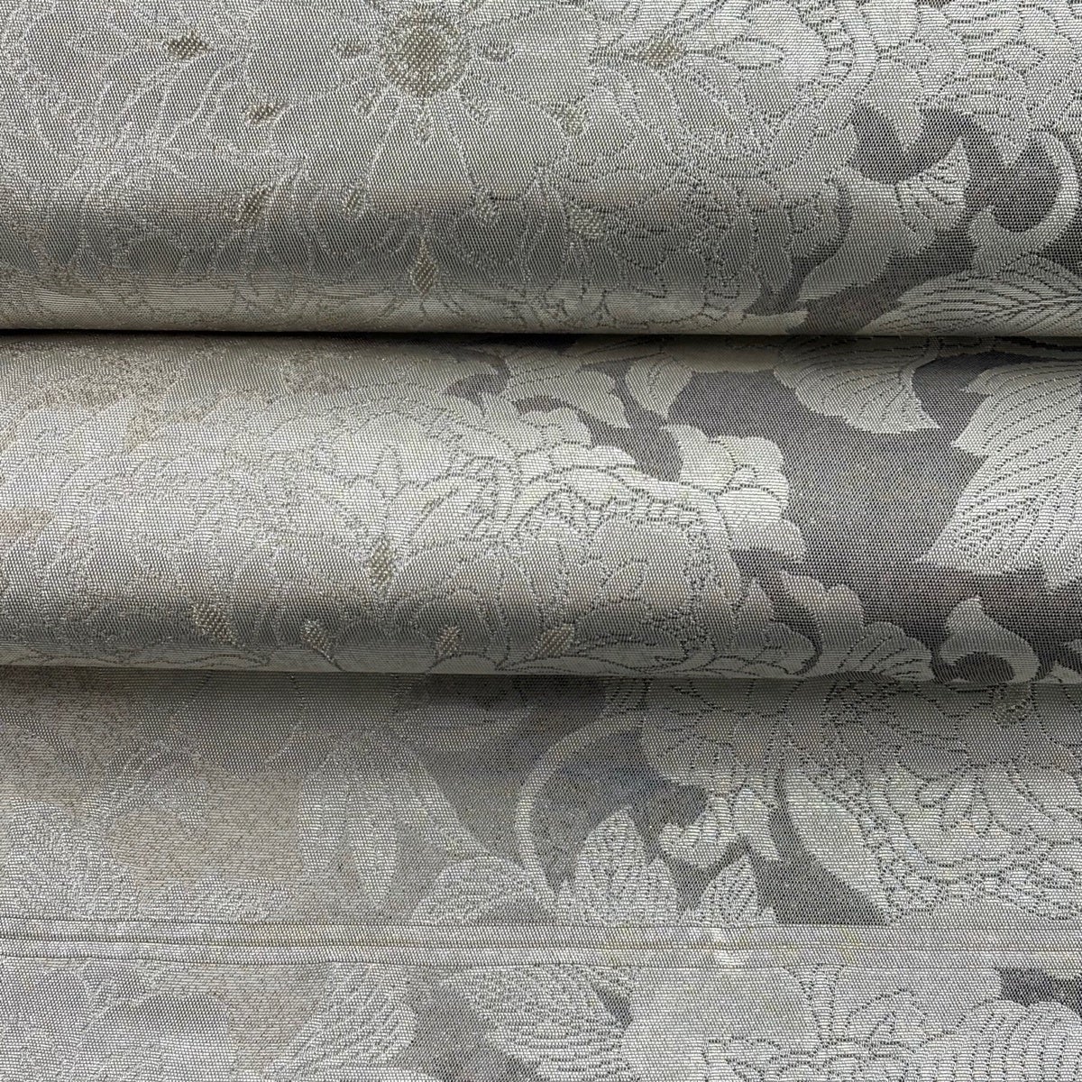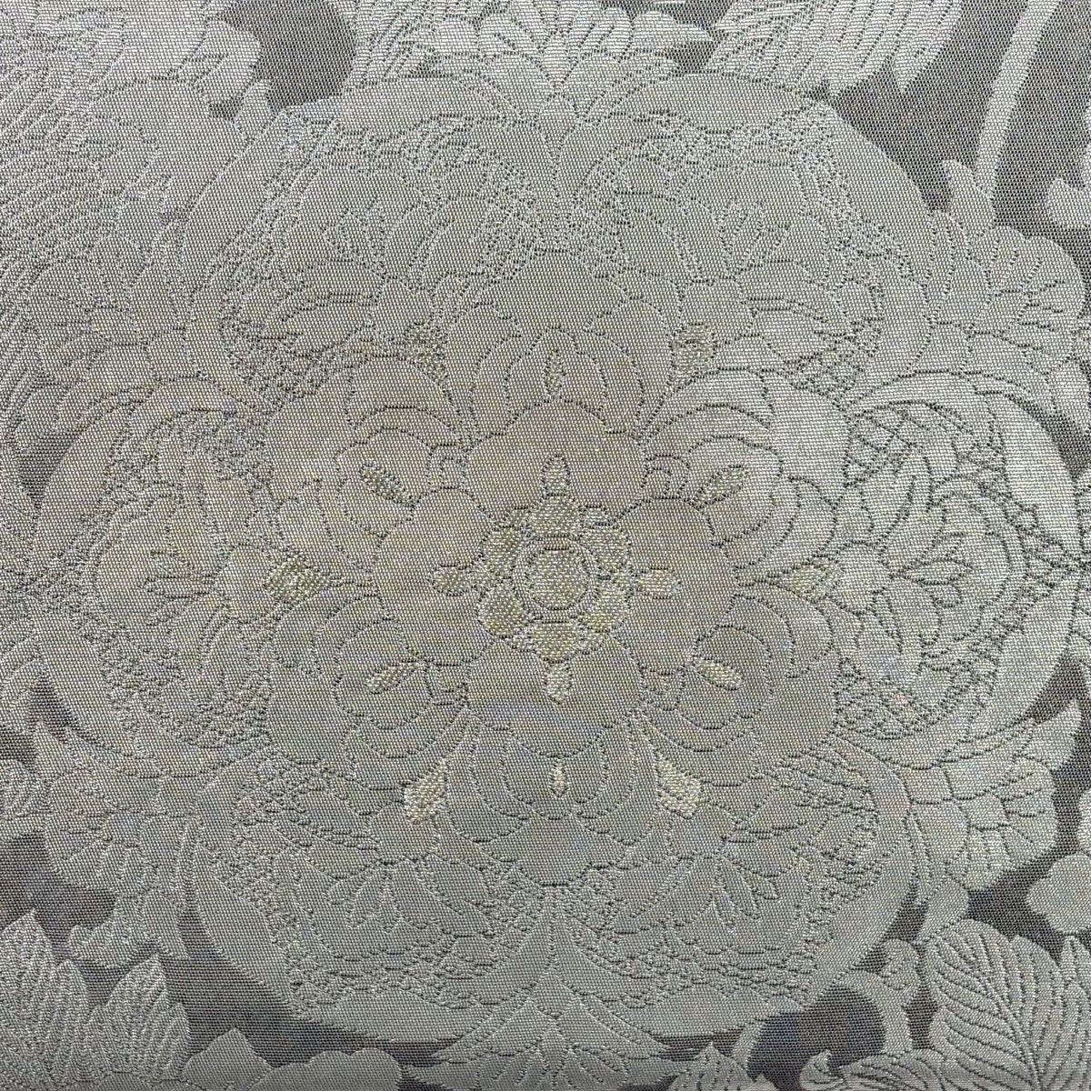 【美品】 袋帯 逸品 落款あり じゅらく帝王紫 花唐草 金銀糸 灰色 お太鼓柄 正絹