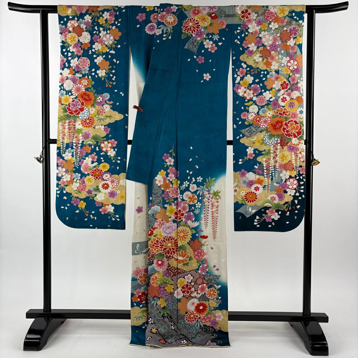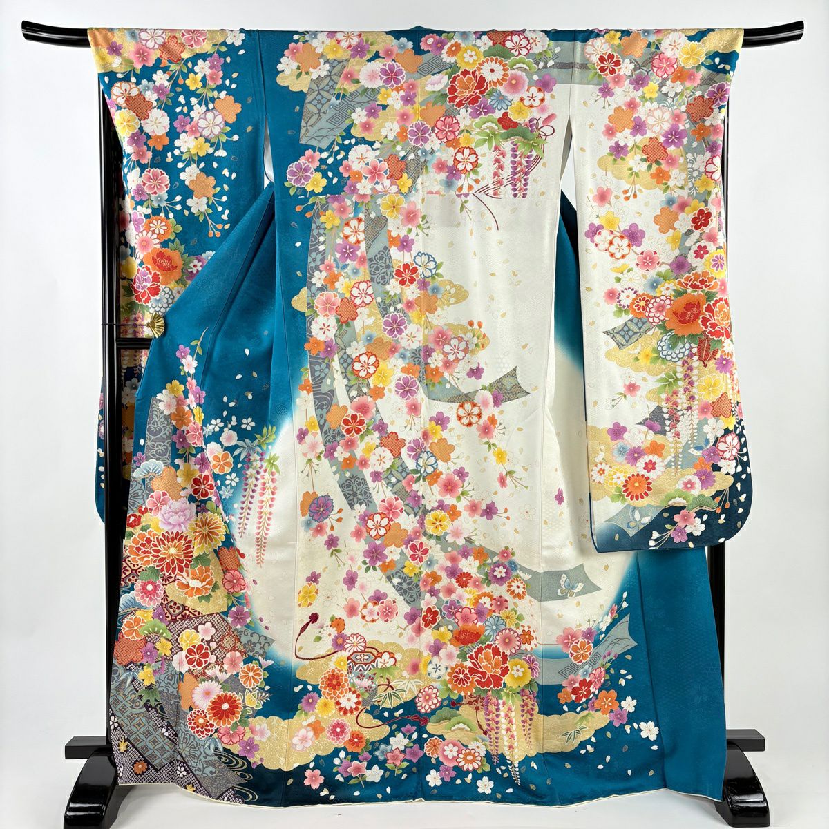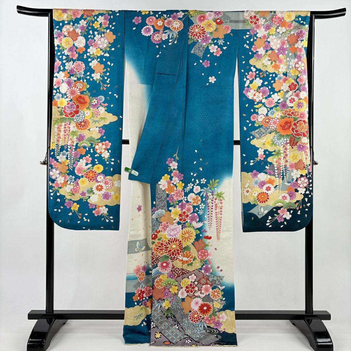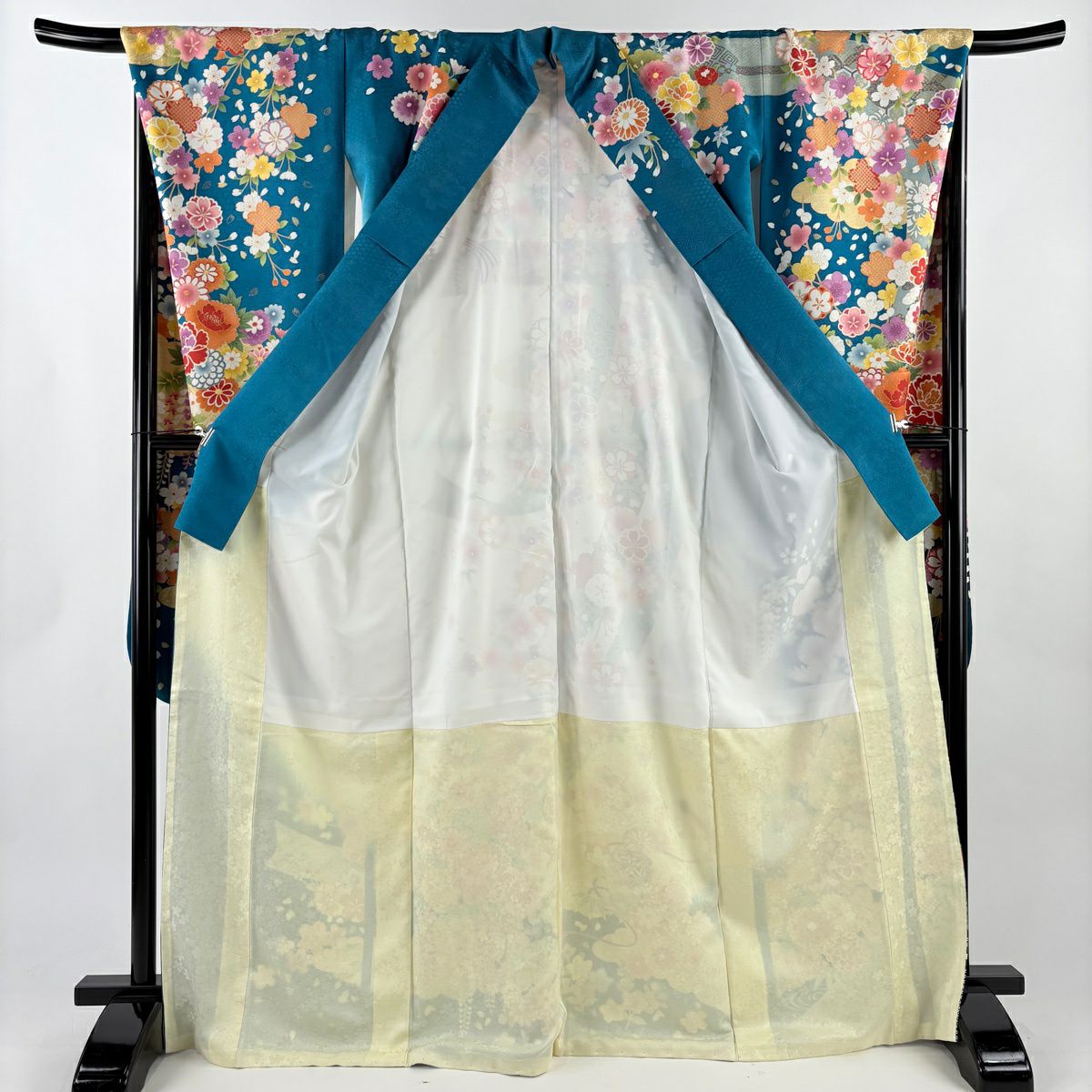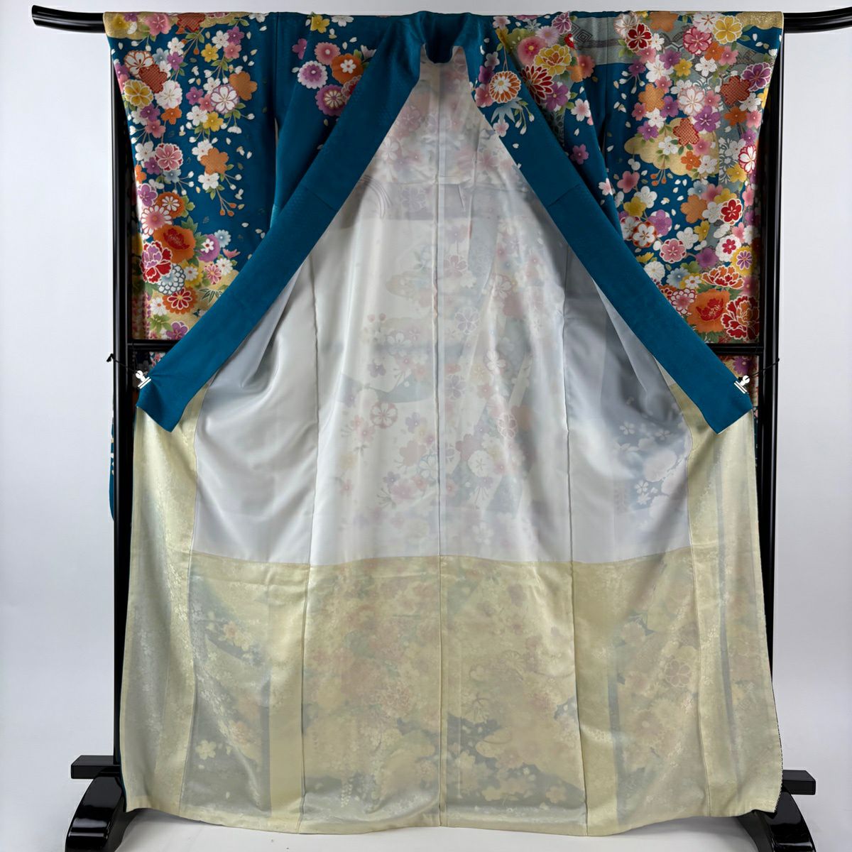 50%OFF 振袖 身丈169cm 裄丈67cm M 袷 草花 扇面 銀通し 金糸 青緑 正絹 逸品 K50