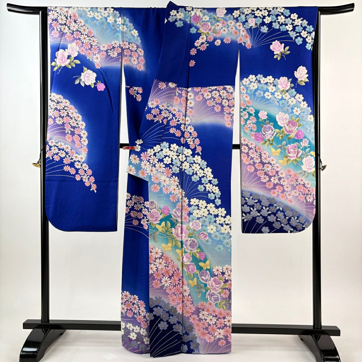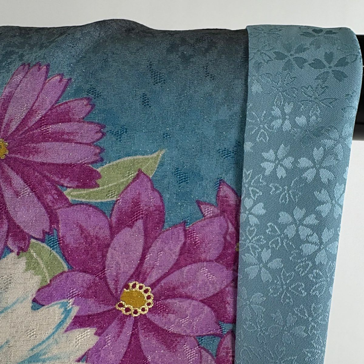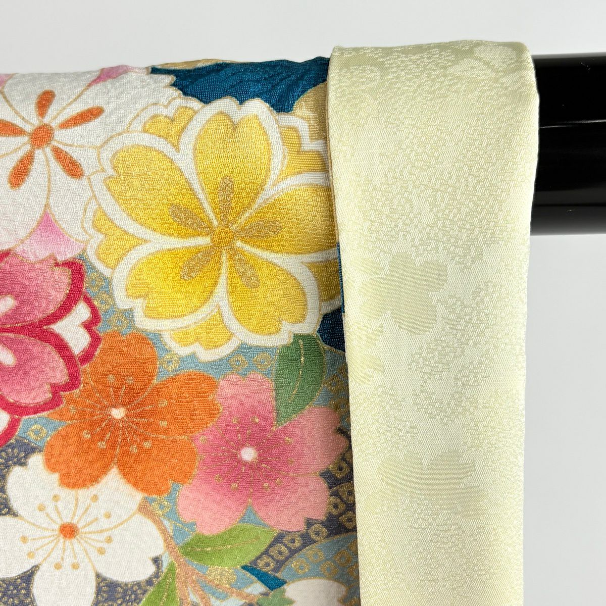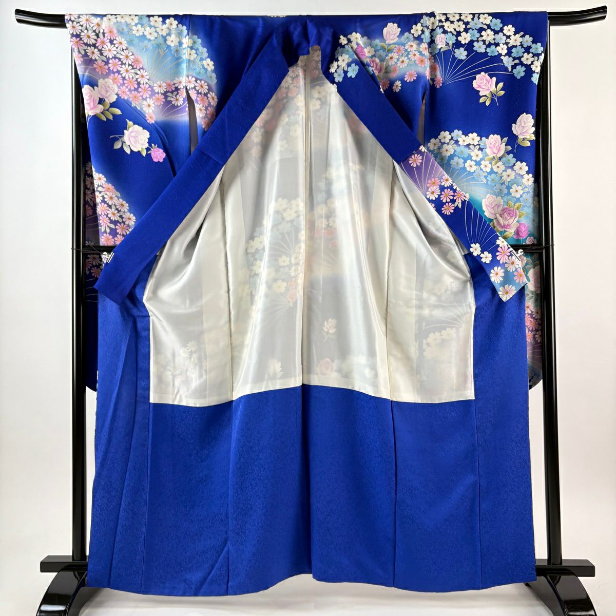 50%OFF 振袖 身丈169cm 裄丈67cm M 袷 草花 扇面 銀通し 金糸 青緑 正絹 逸品 K50