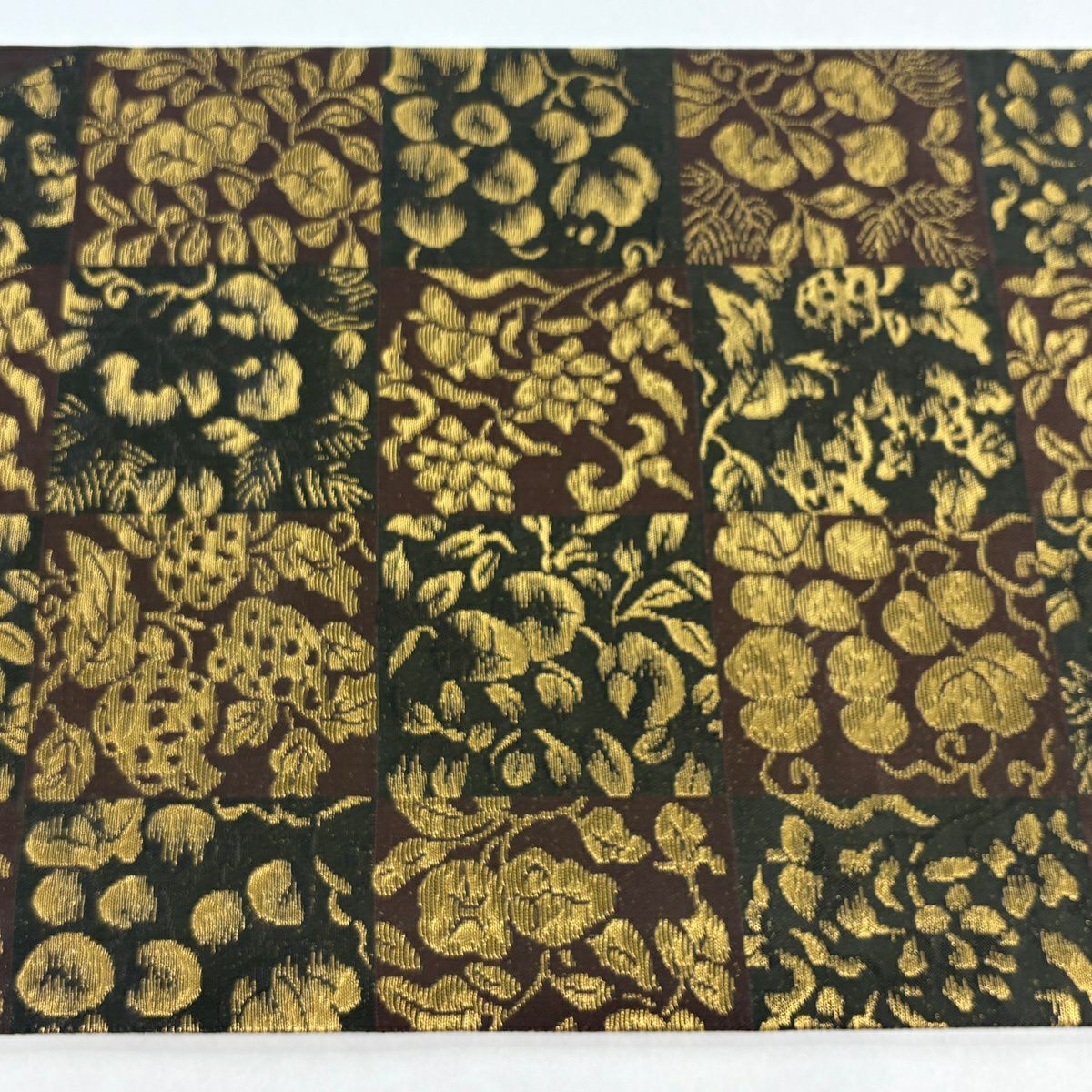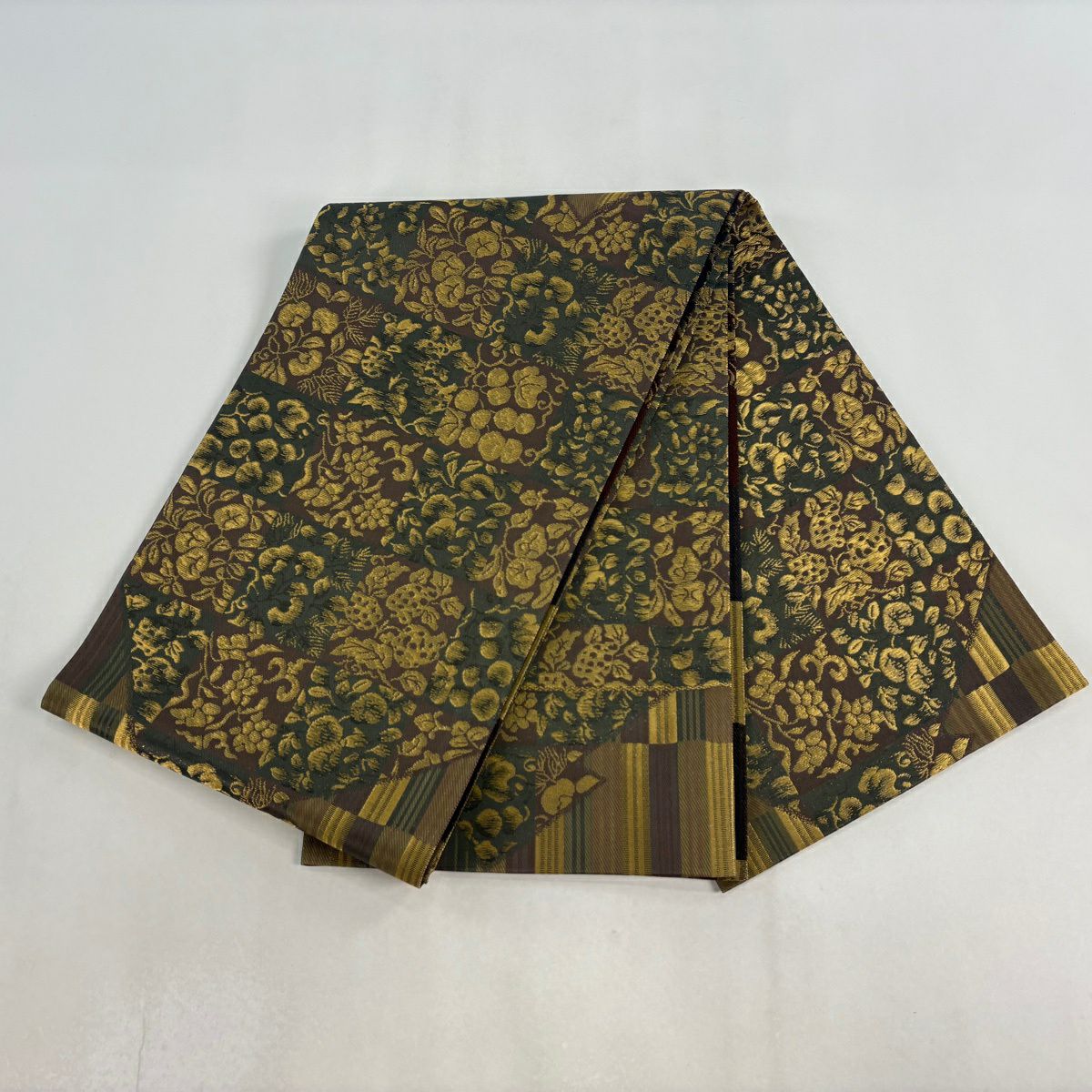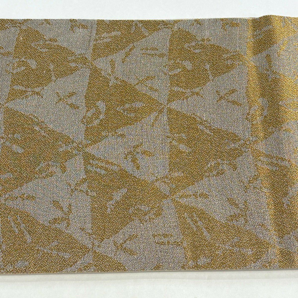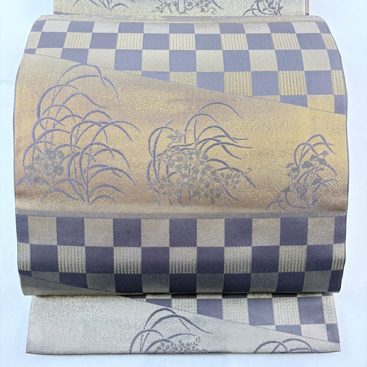 50%OFF 【美品】 袋帯 逸品 北出与三郎 落款あり 草花 市松 金糸 箔 薄茶色 六通 正絹 K50