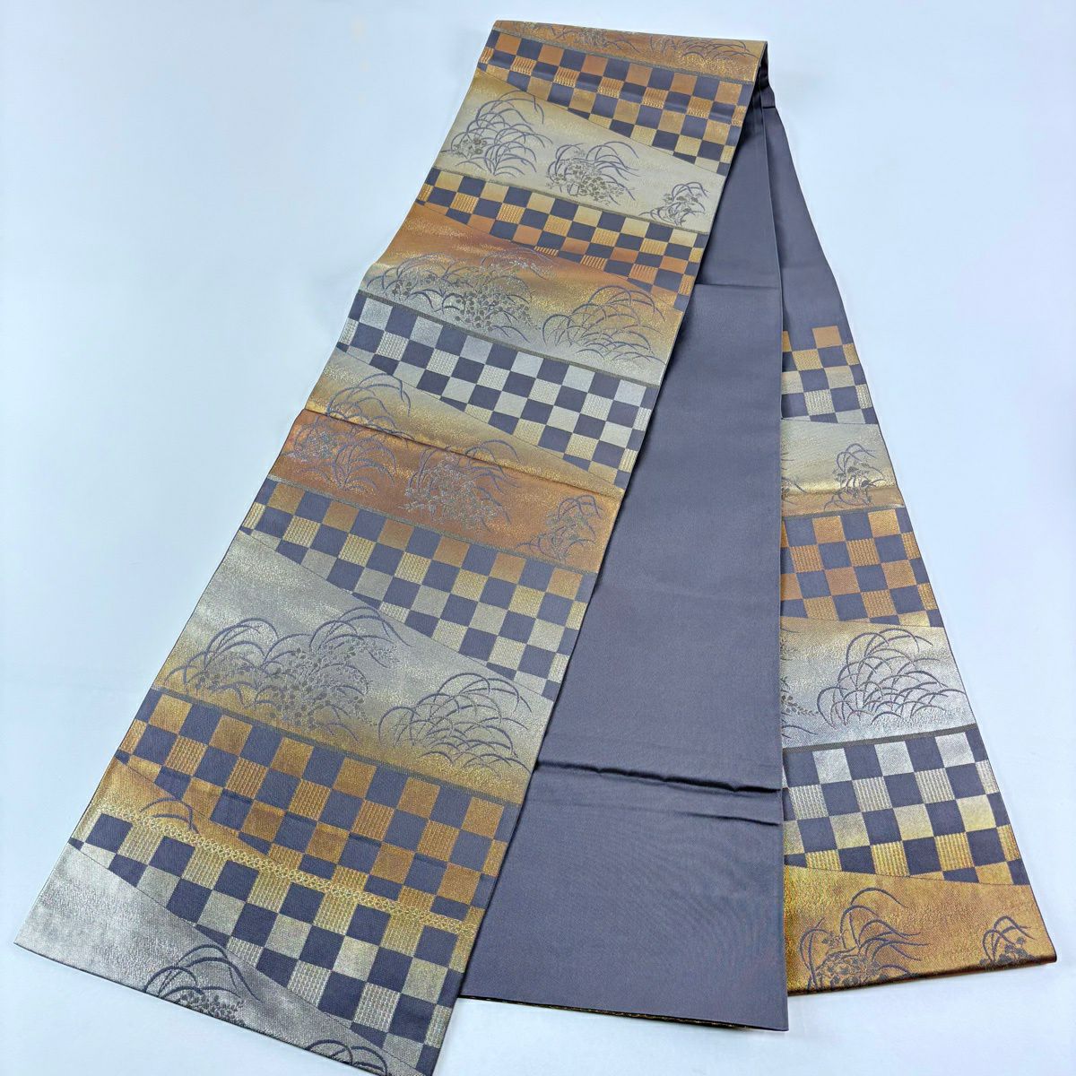50%OFF 袋帯 逸品 じゅらく 落款あり じゅらく帝王紫 色紙 華文 金銀糸 箔 灰紫 お太鼓柄 正絹 K50