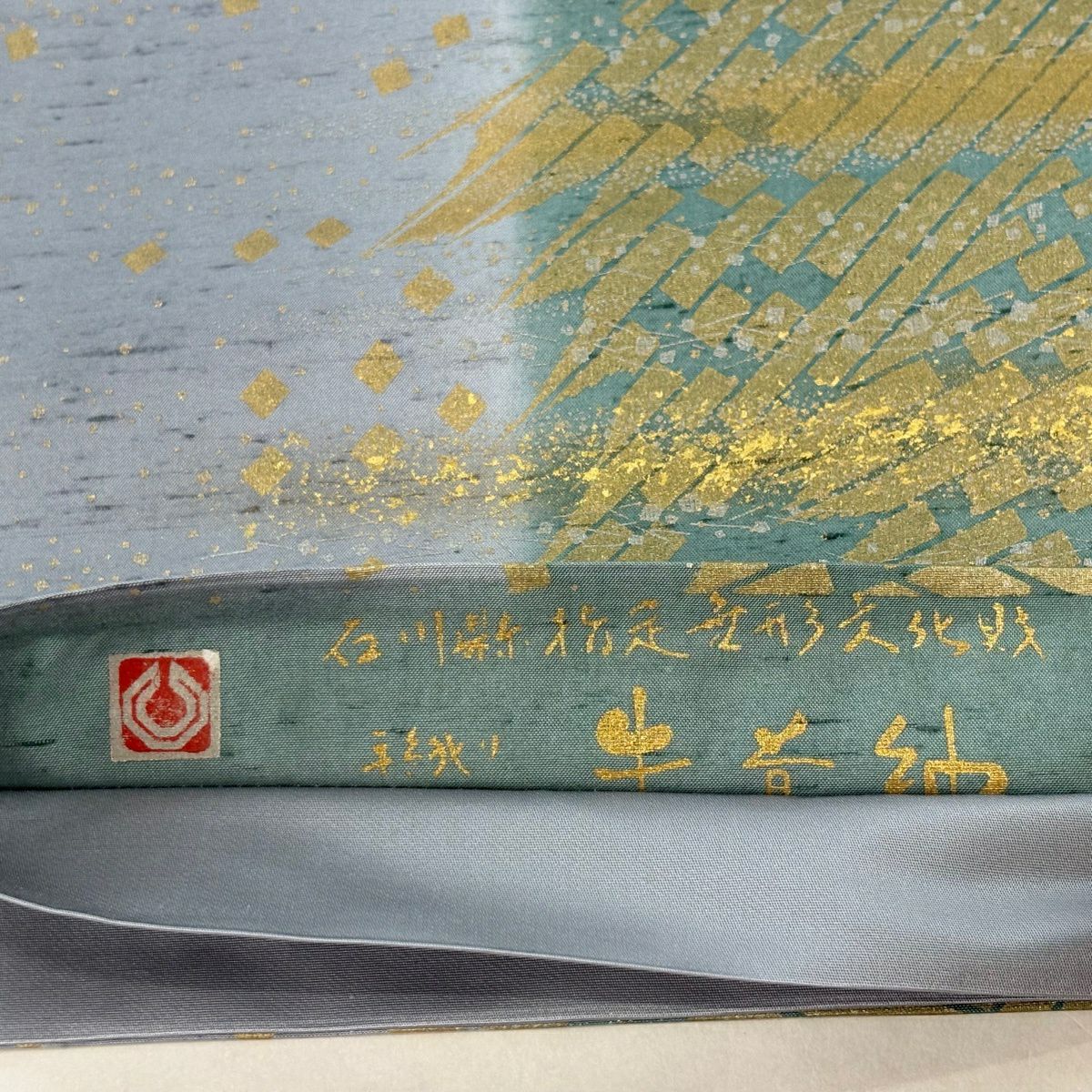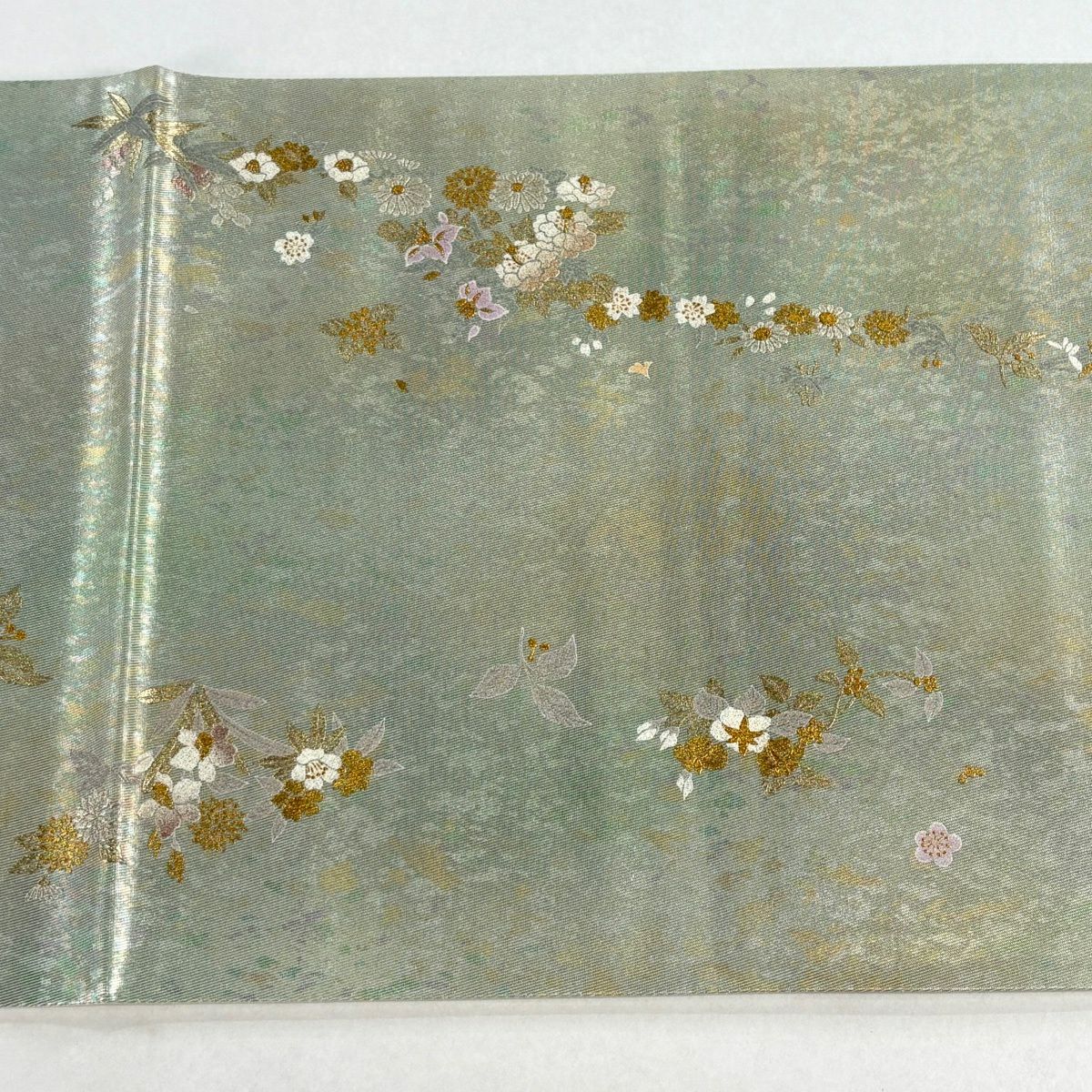 40%OFF 【美品】 袋帯 逸品 和田光正 落款あり 草花 桜 金銀彩 箔 薄緑 お太鼓柄 正絹 K30
