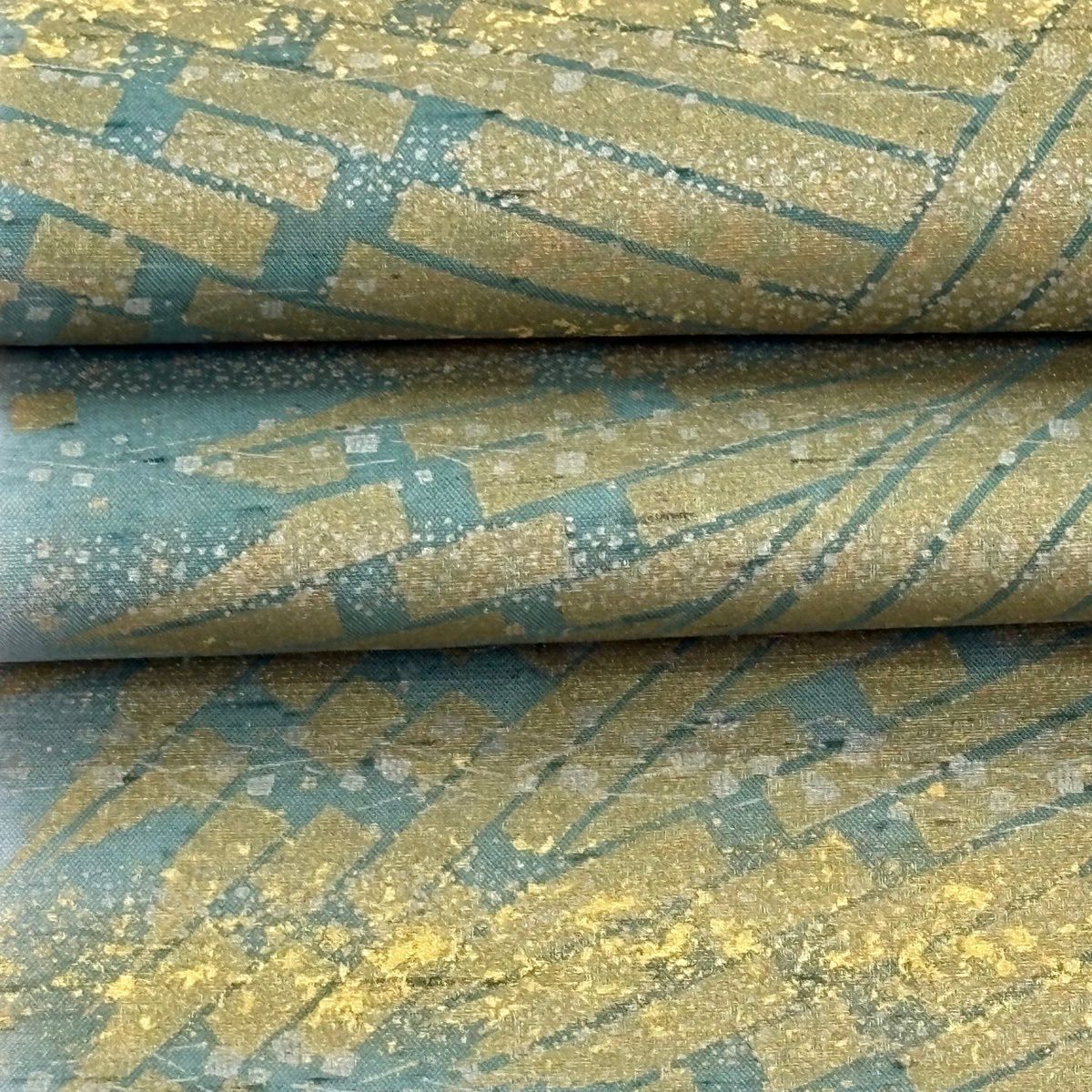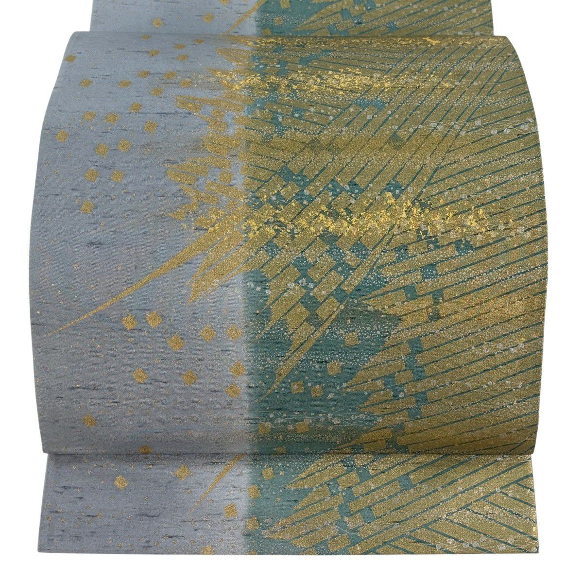 【最終値引き】 70%OFF 袋帯 逸品 しょうざん 紬地 花 縞 箔 金糸 青緑 お太鼓柄 正絹 K70