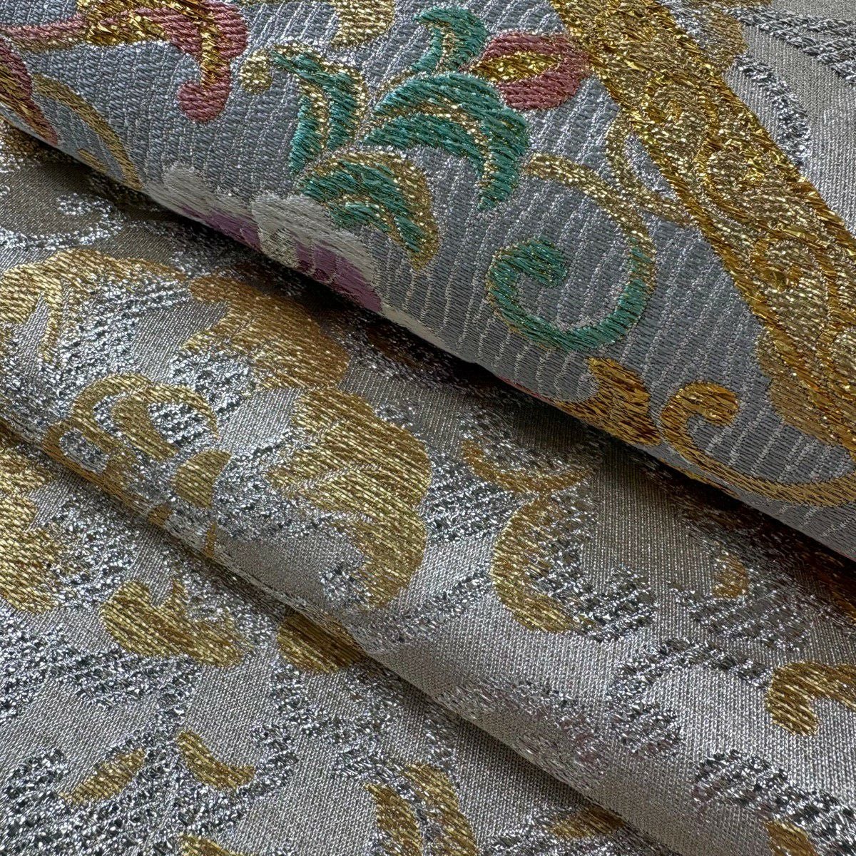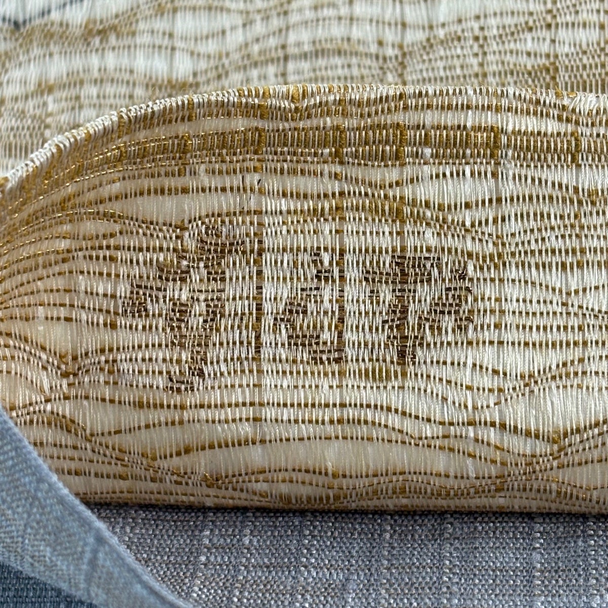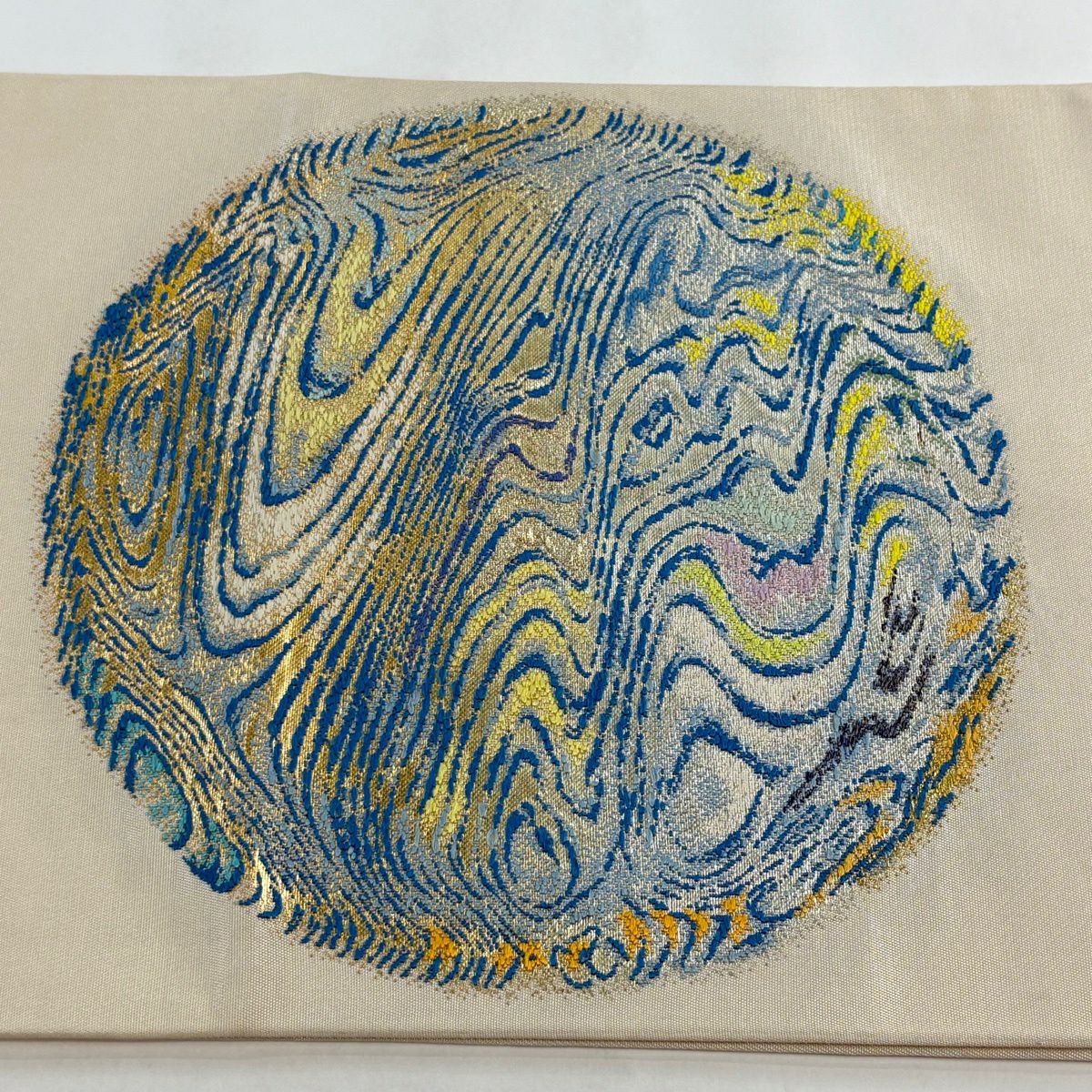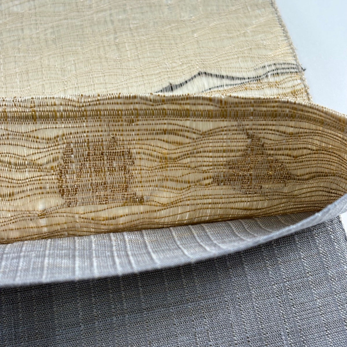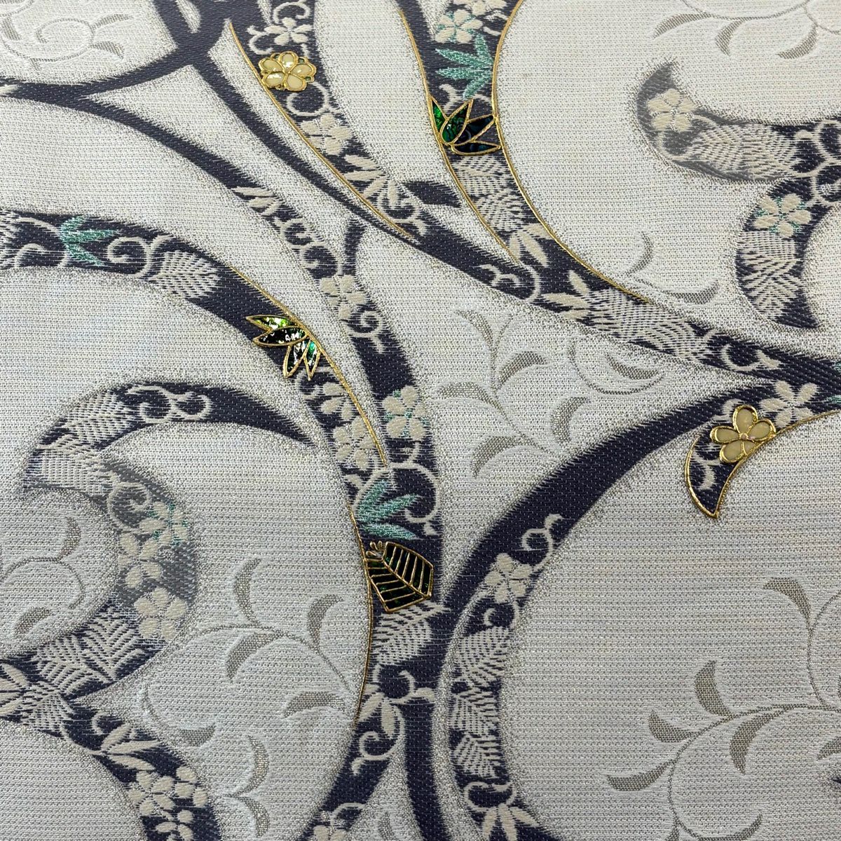 20%OFF 袋帯 逸品 草木染 新小石丸 大王松おしるし文 華文 刺繍 金糸 クリーム 六通 正絹 K30