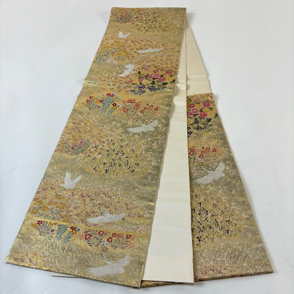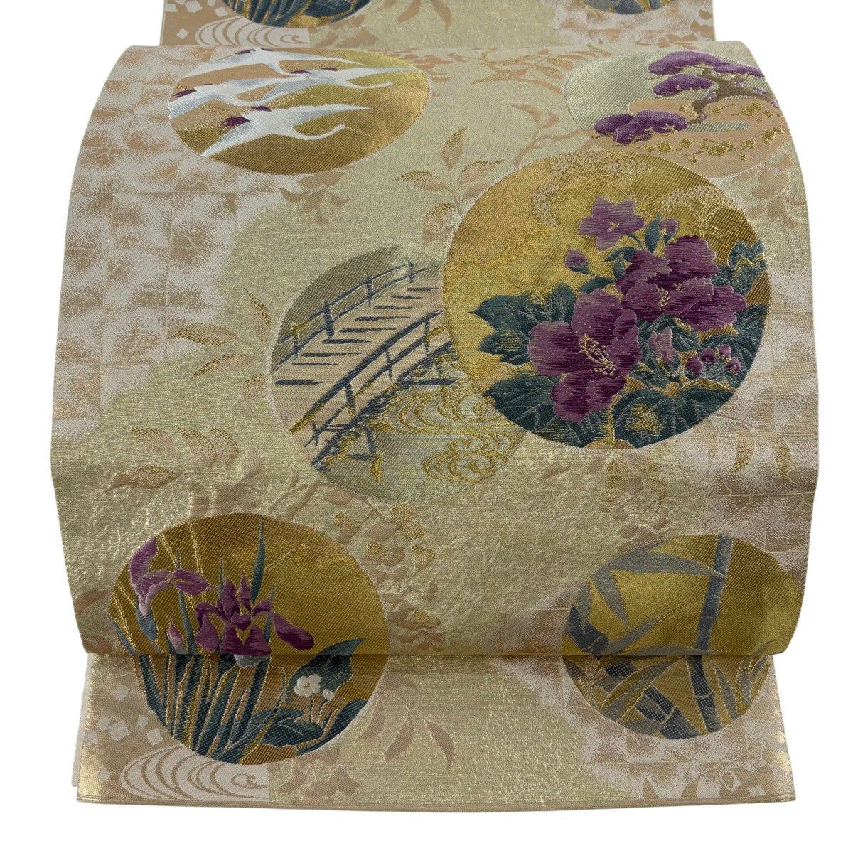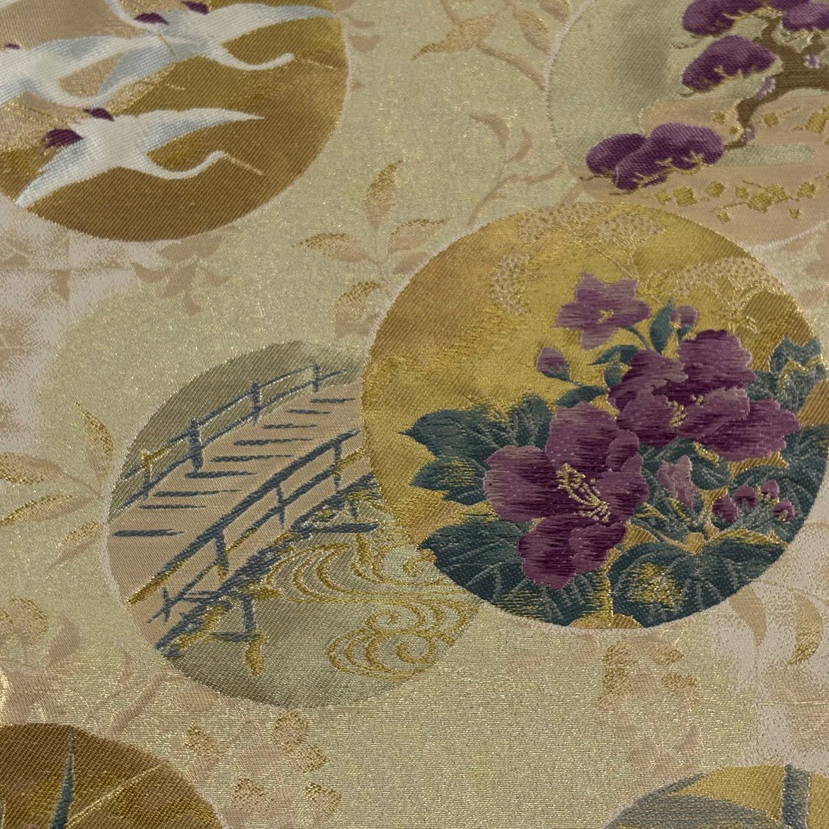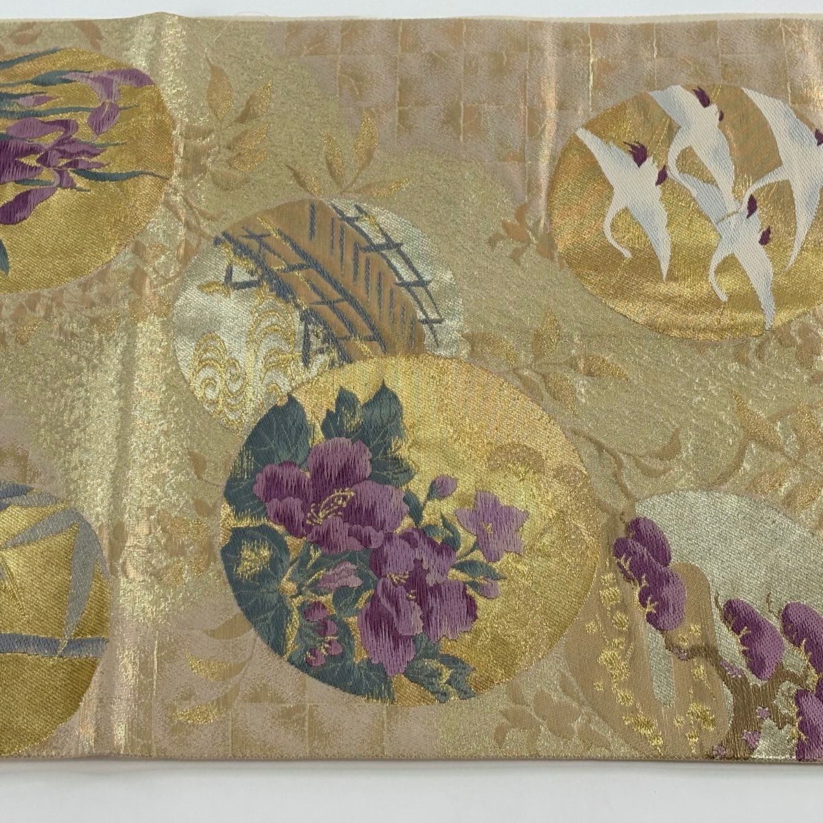 40%OFF 袋帯 逸品 じゅらく 落款あり じゅらく帝王紫 丸文 鶴 金糸 刺繍 ベージュ 六通 正絹 K30