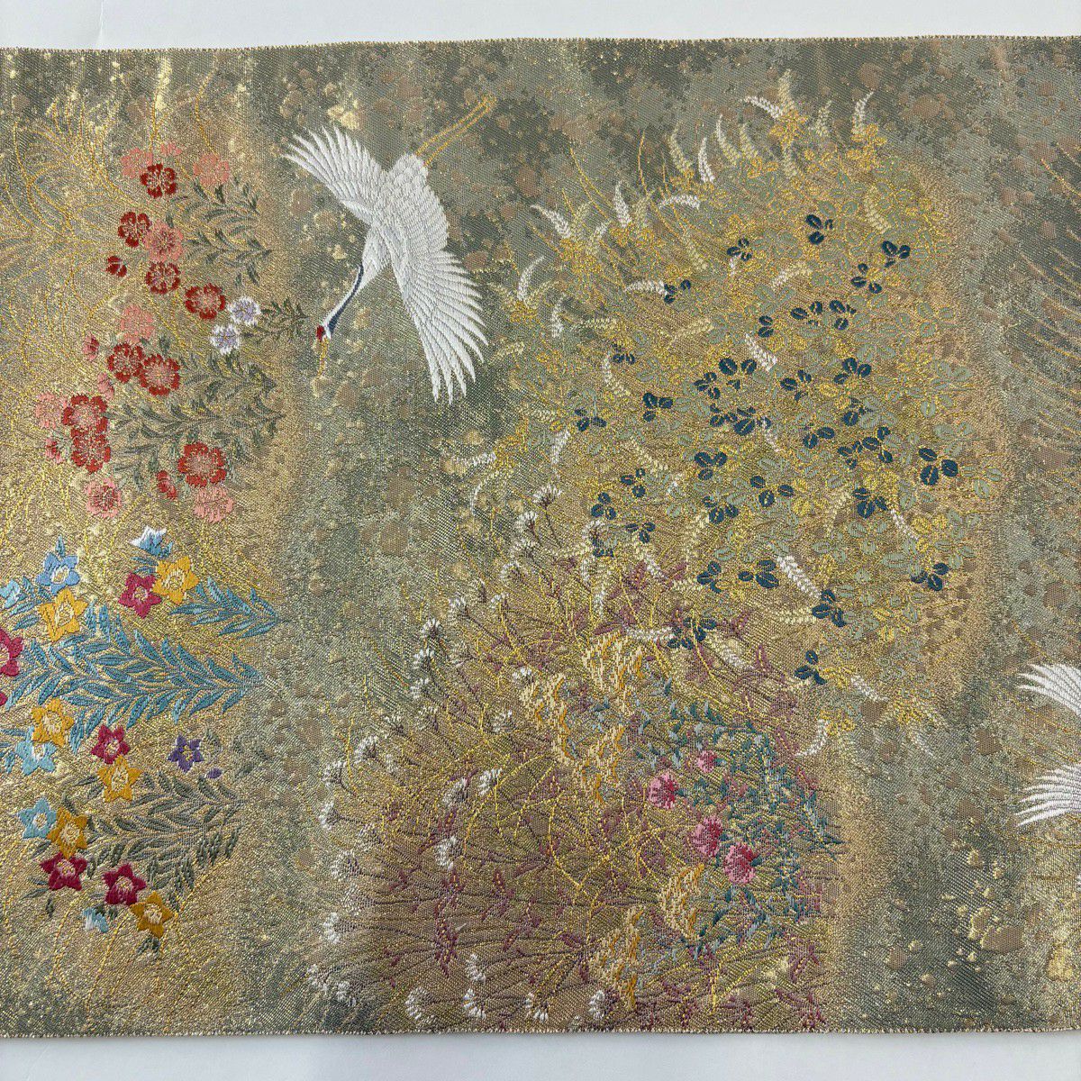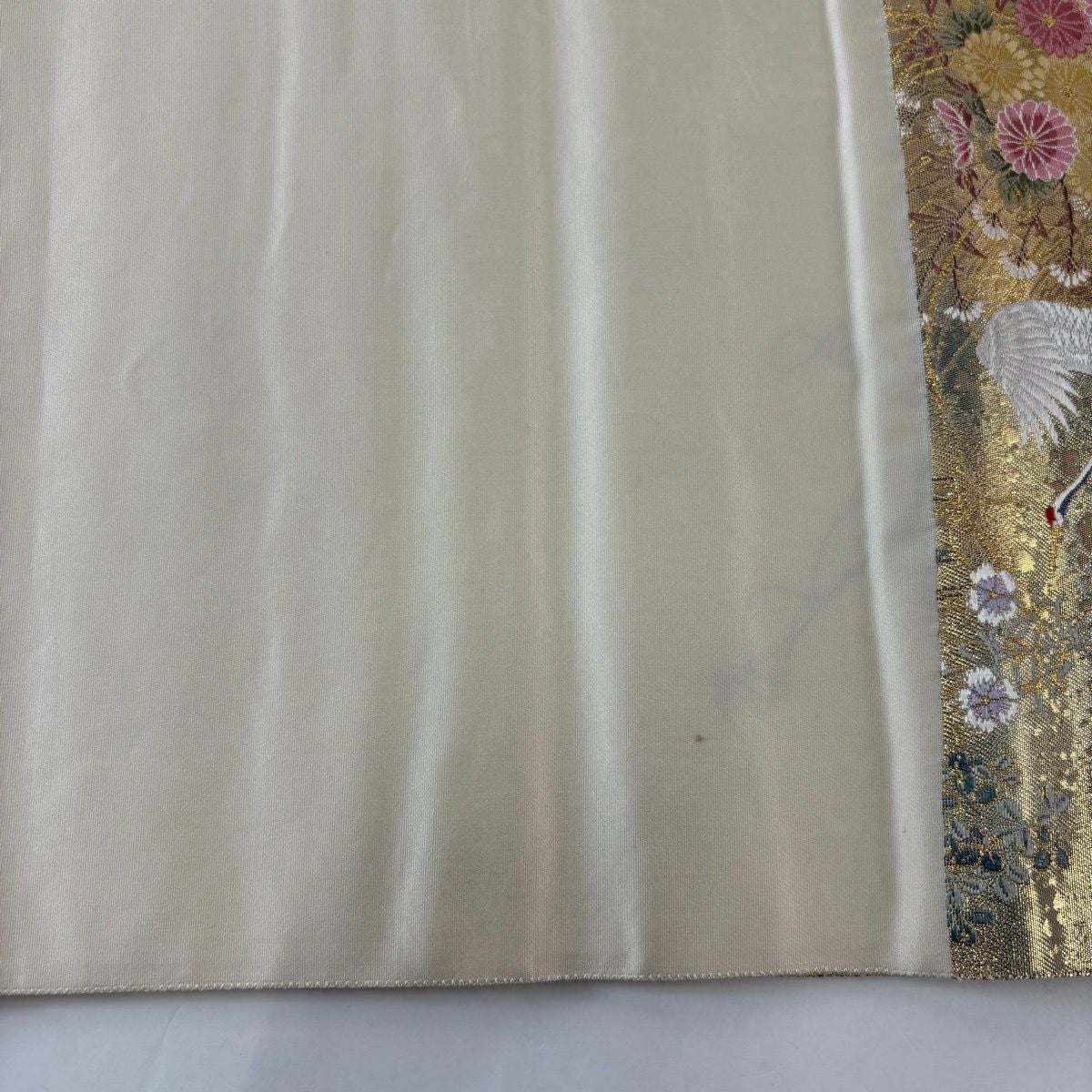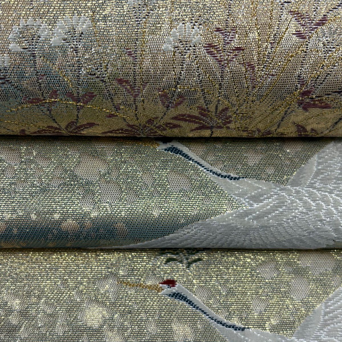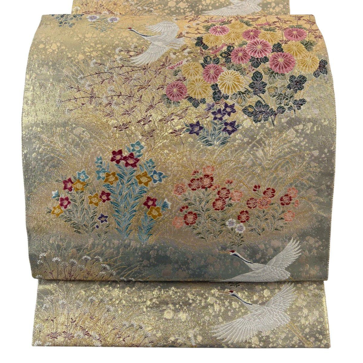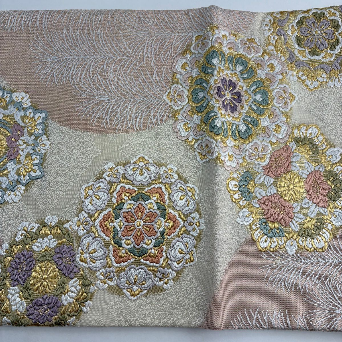 40%OFF 袋帯 逸品 じゅらく 落款あり じゅらく帝王紫 丸文 鶴 金糸 刺繍 ベージュ 六通 正絹 K30