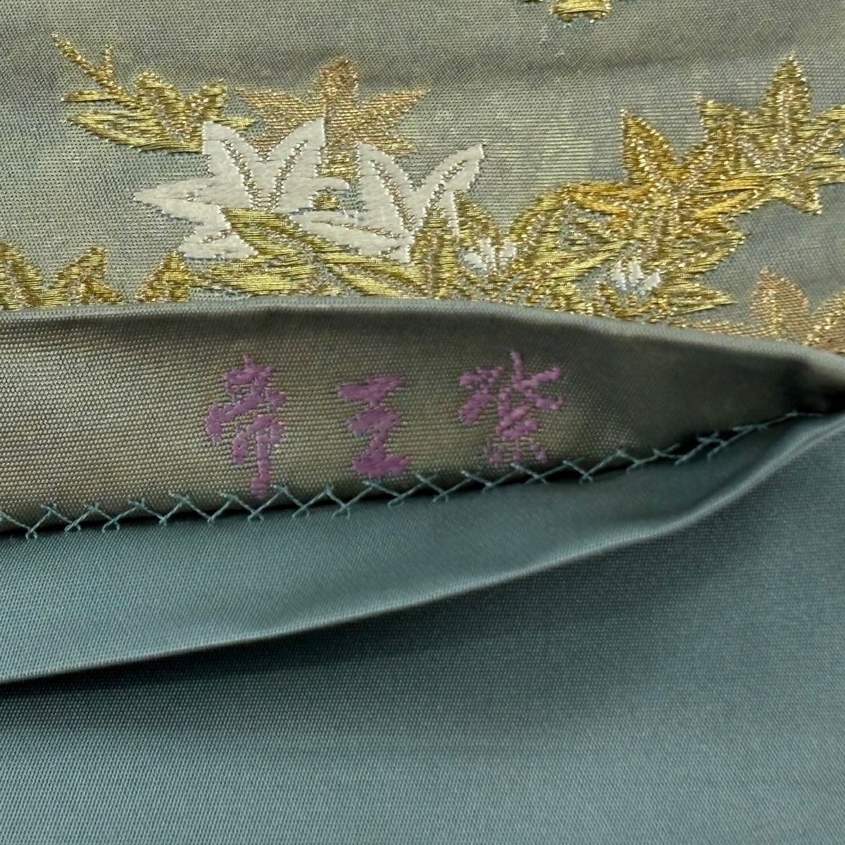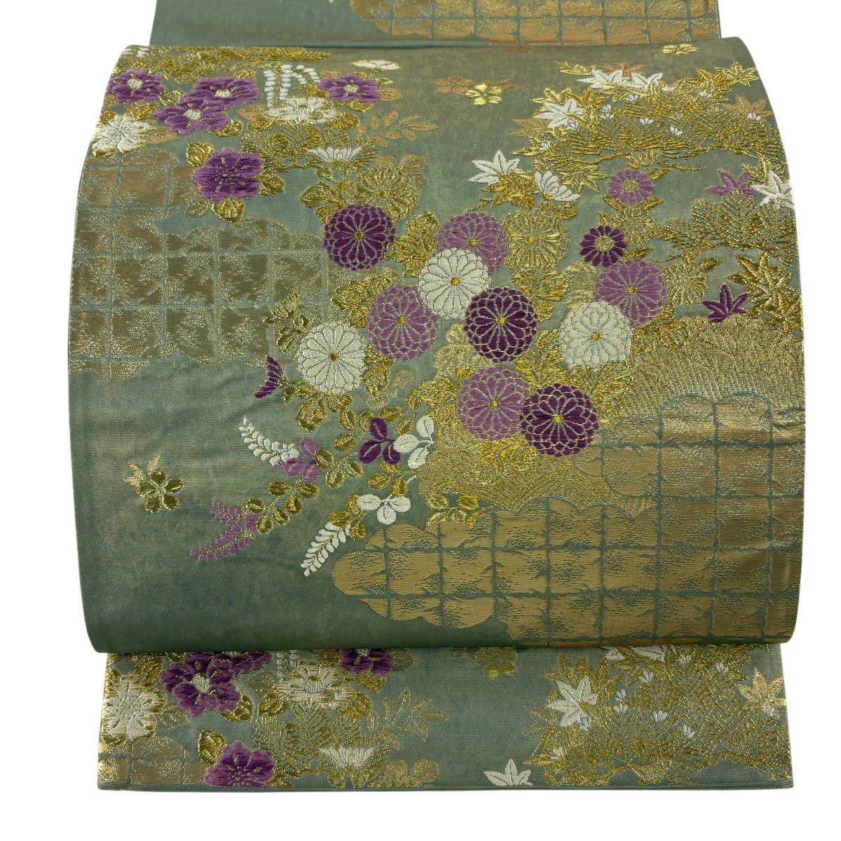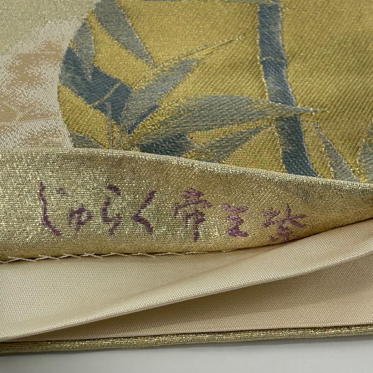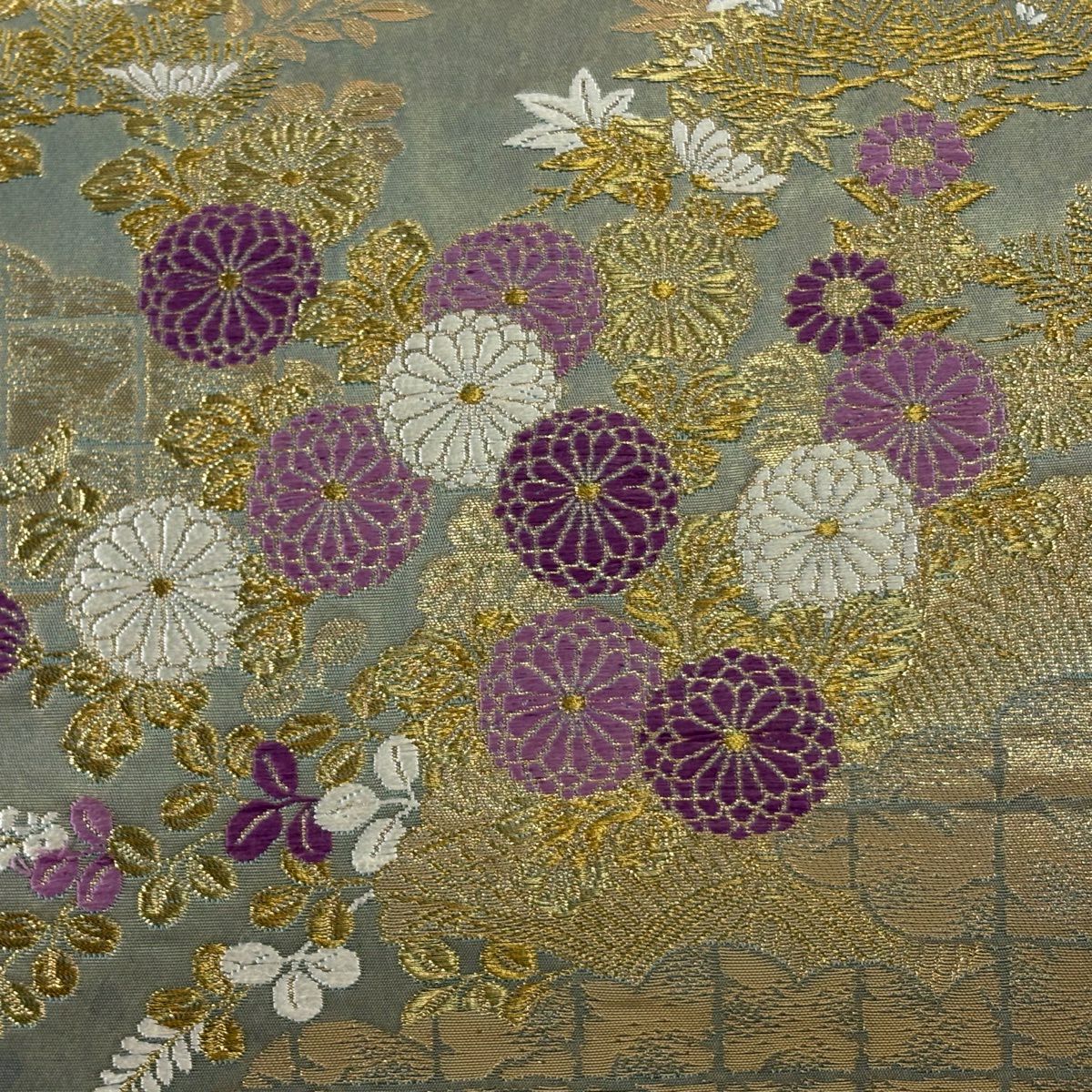 40%OFF 【美品】 袋帯 逸品 じゅらく 落款あり 帝王紫 菊 雲文 金糸 箔 薄緑 六通 正絹 K30