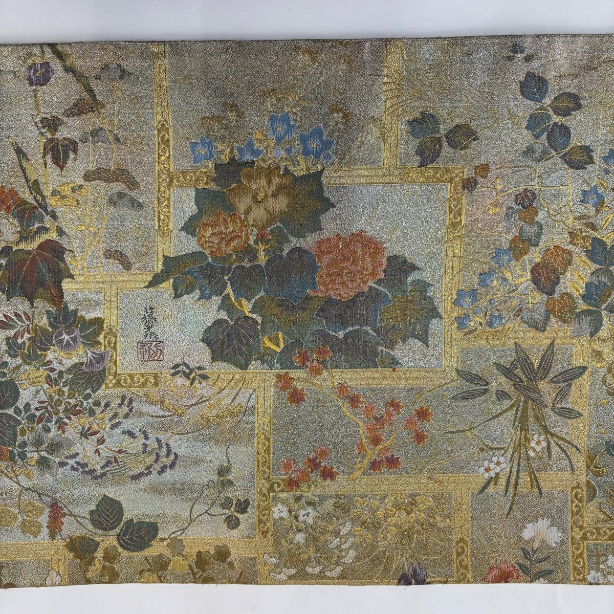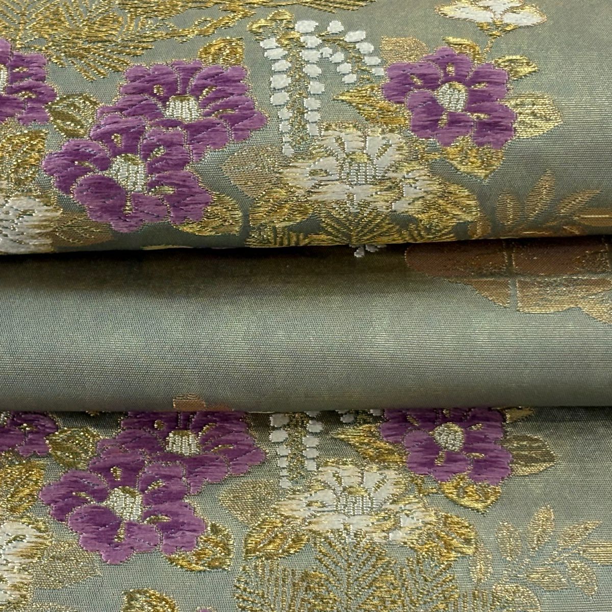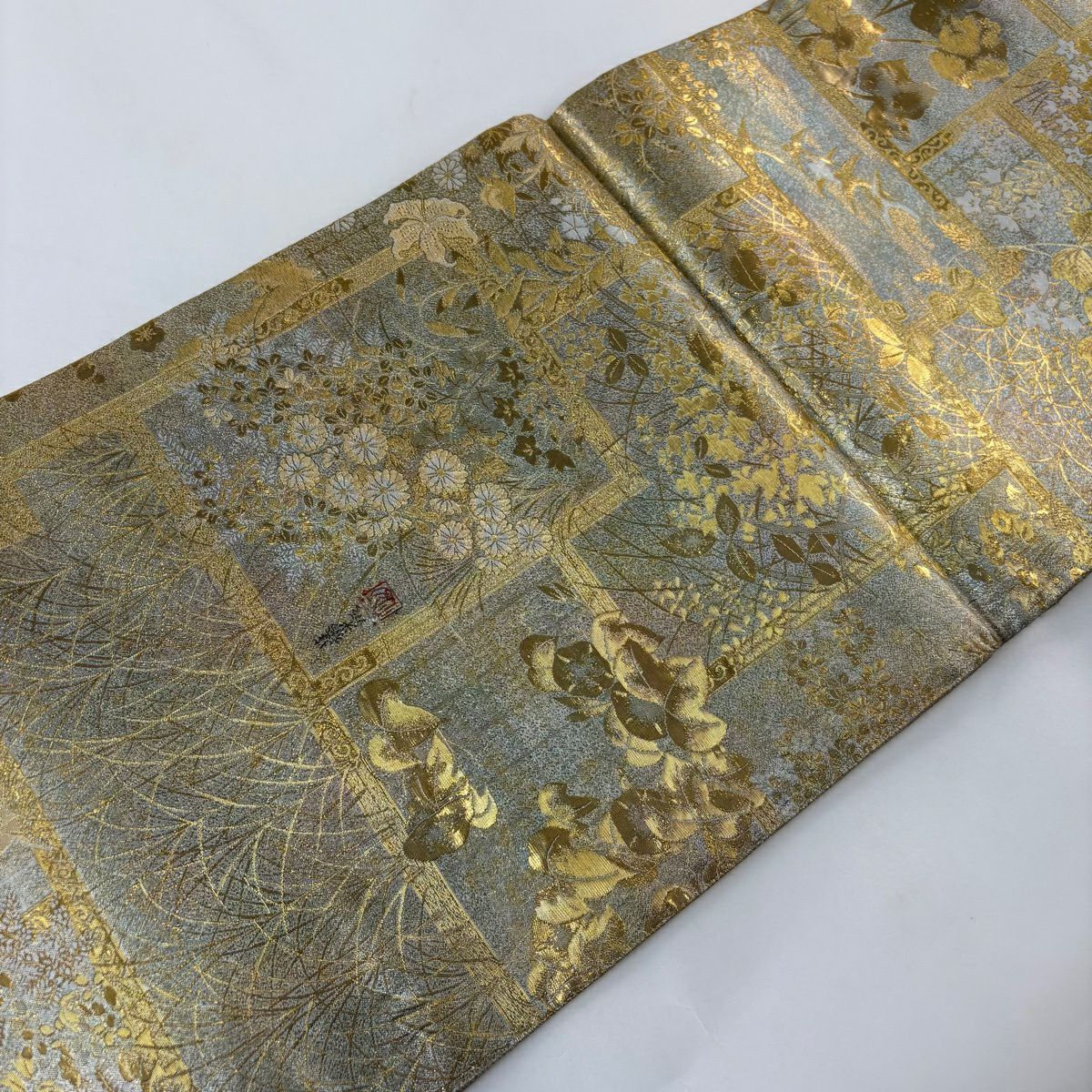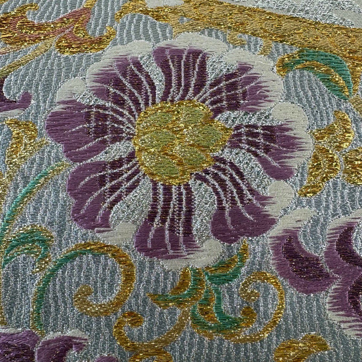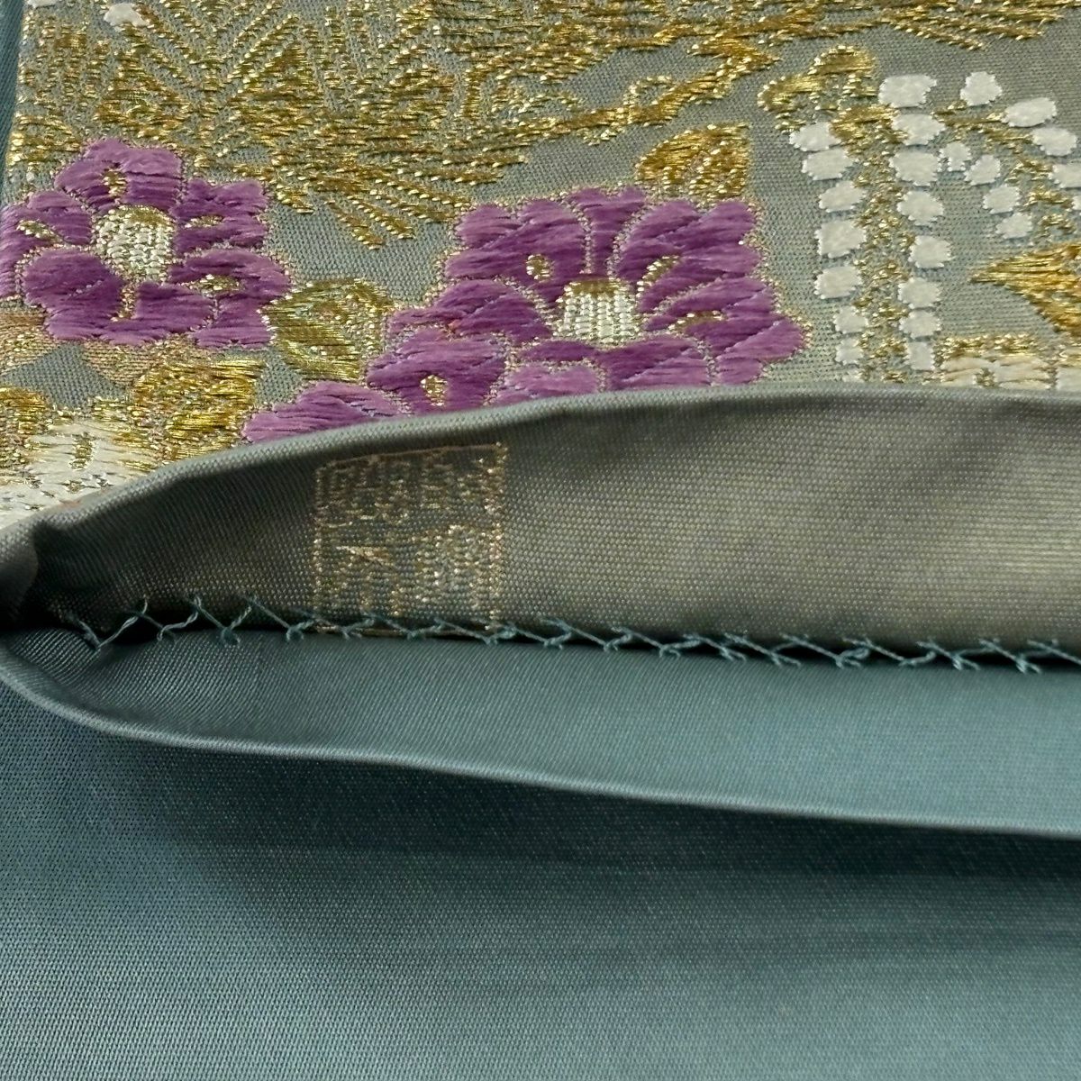 40%OFF 【美品】 袋帯 逸品 じゅらく 落款あり 帝王紫 菊 雲文 金糸 箔 薄緑 六通 正絹 K30