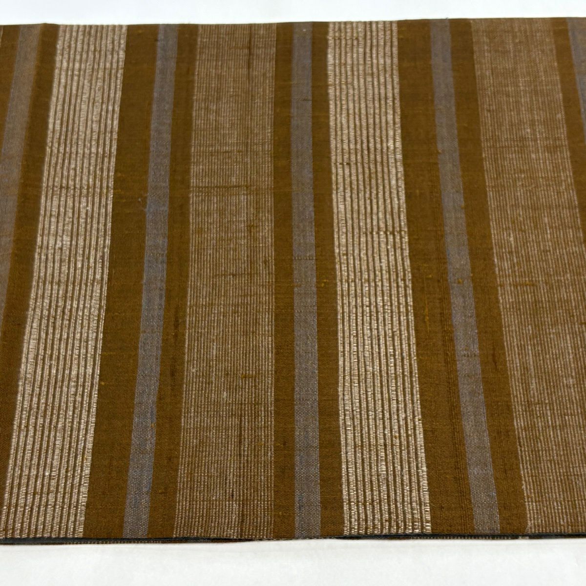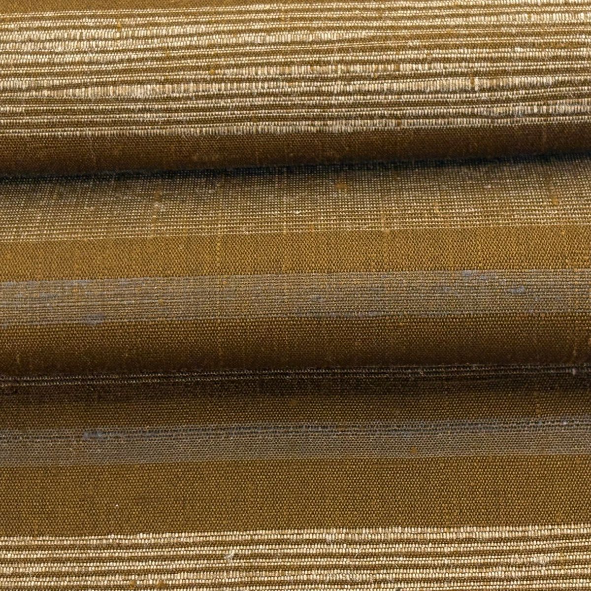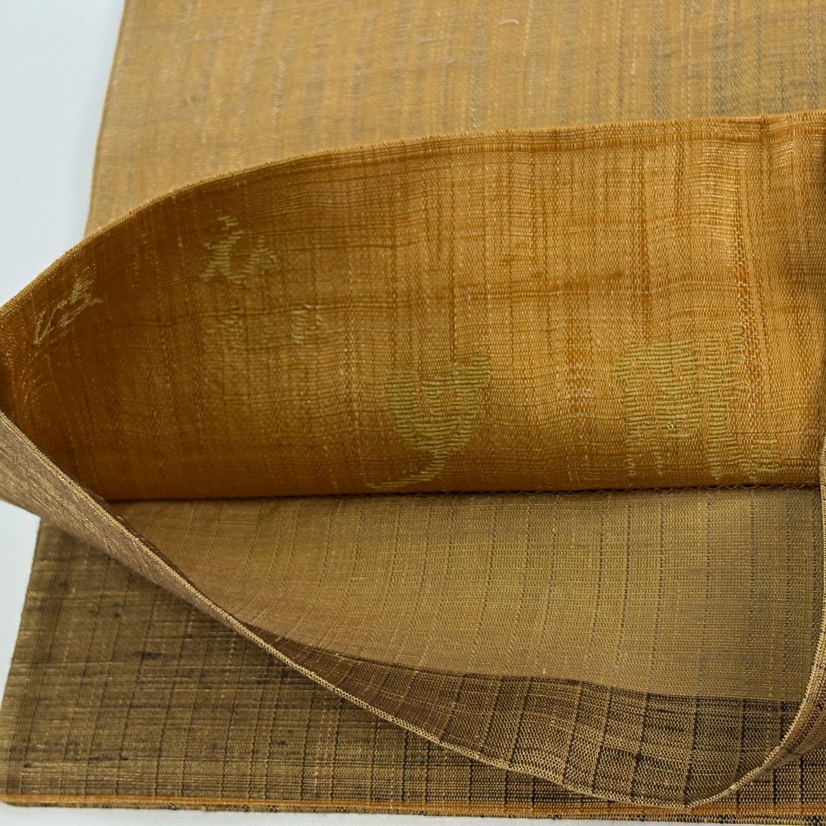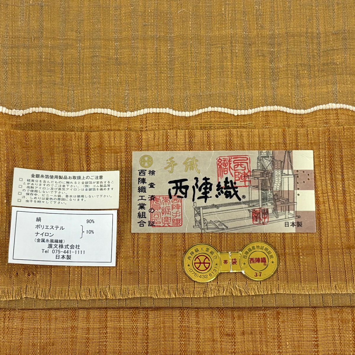 40%OFF 【美品】 袋帯 逸品 渡文 落款あり 証紙あり よろけ縞 金糸 山吹茶色 お太鼓柄 正絹 K30