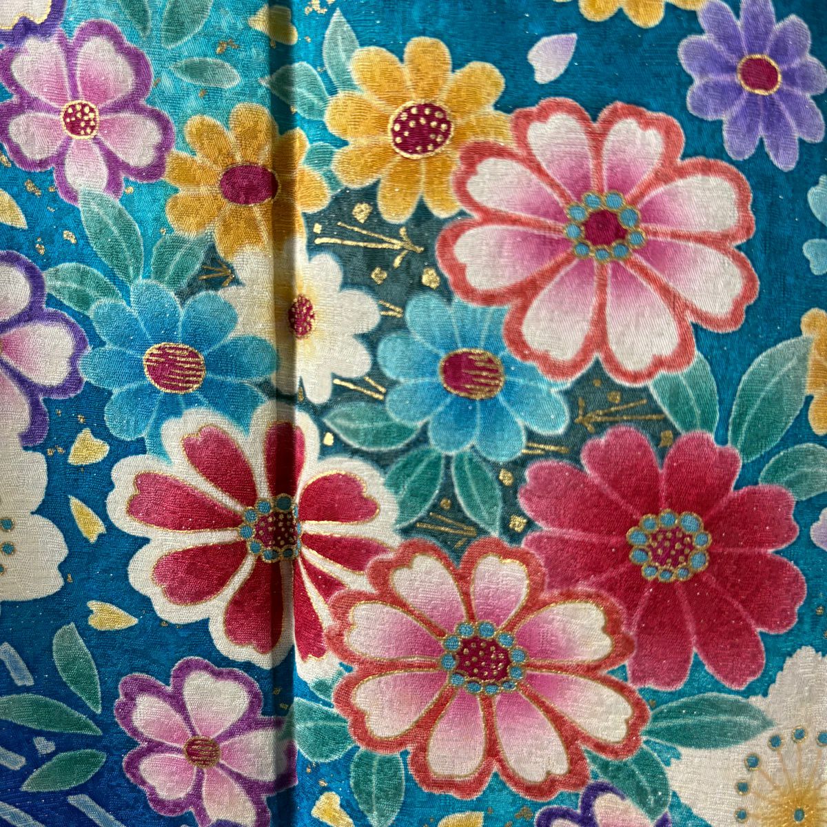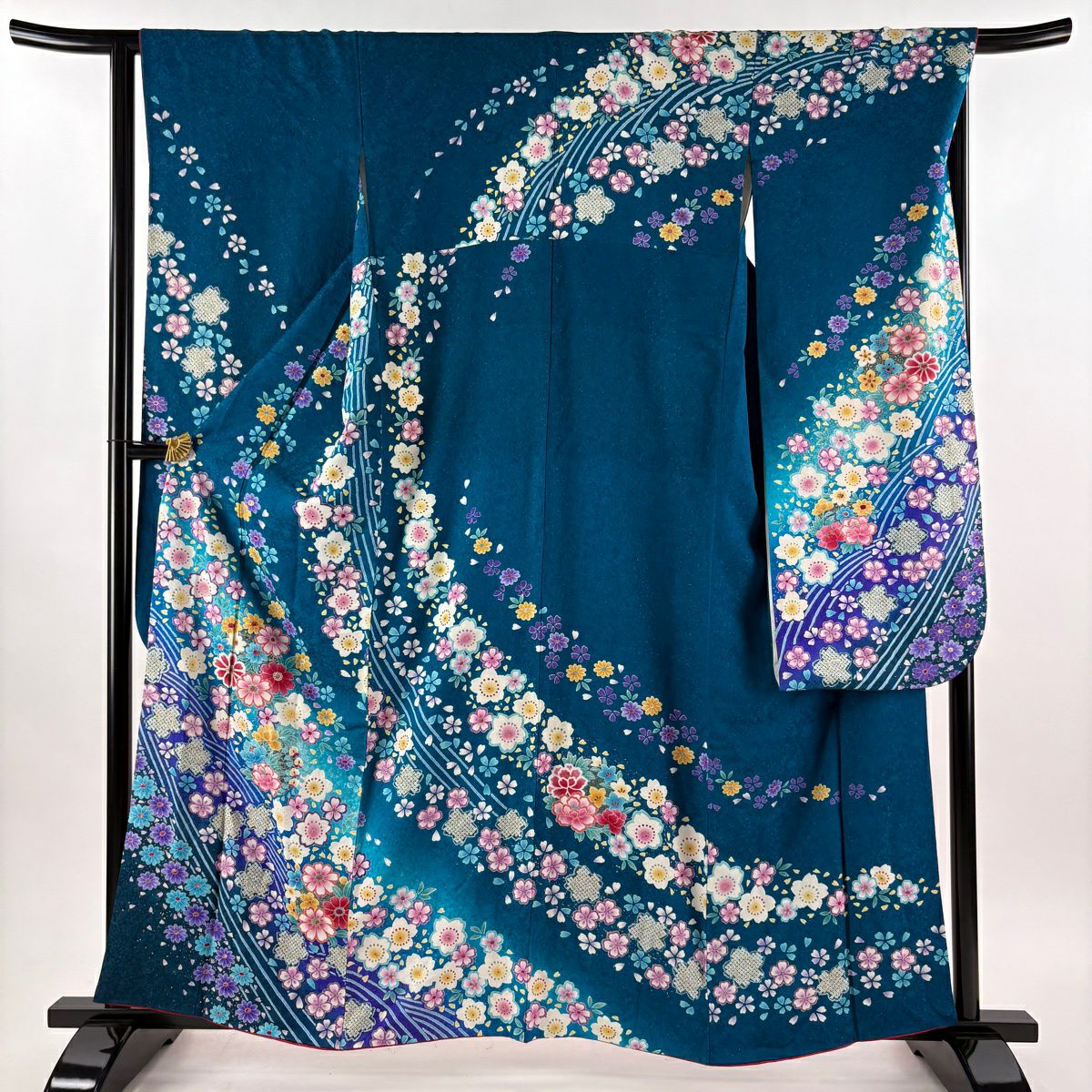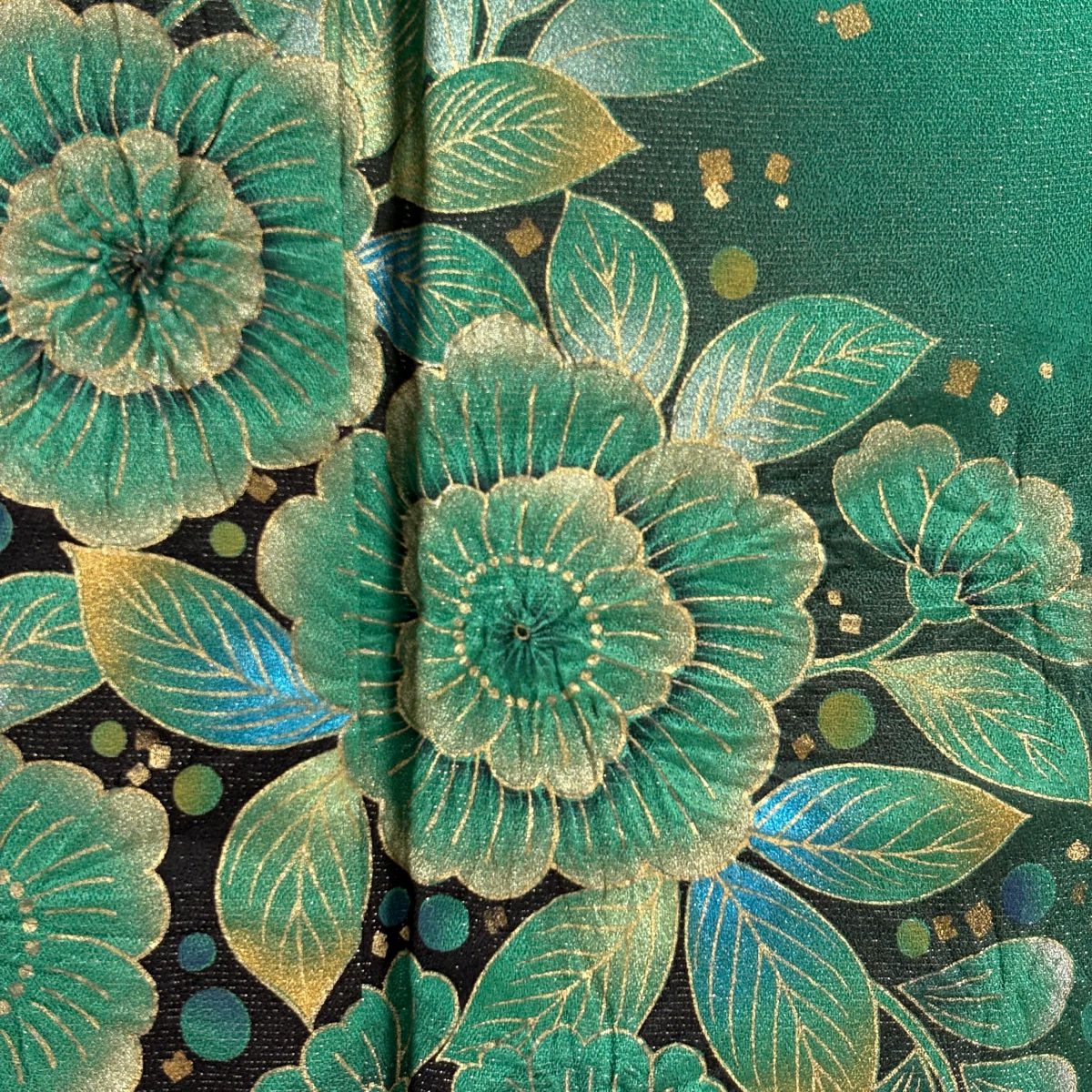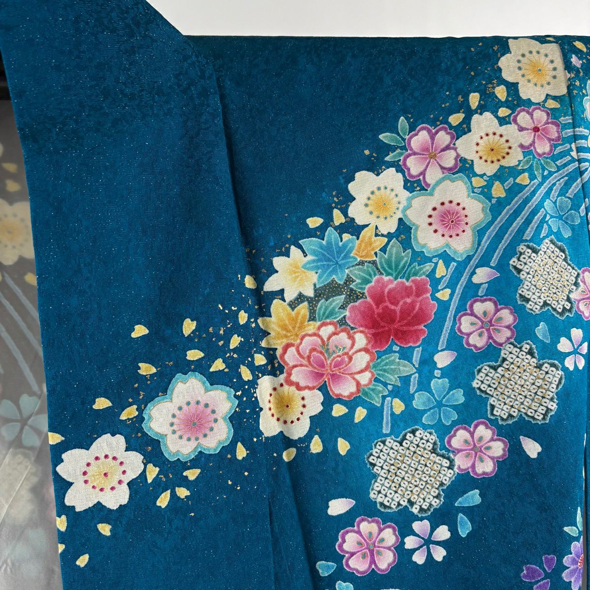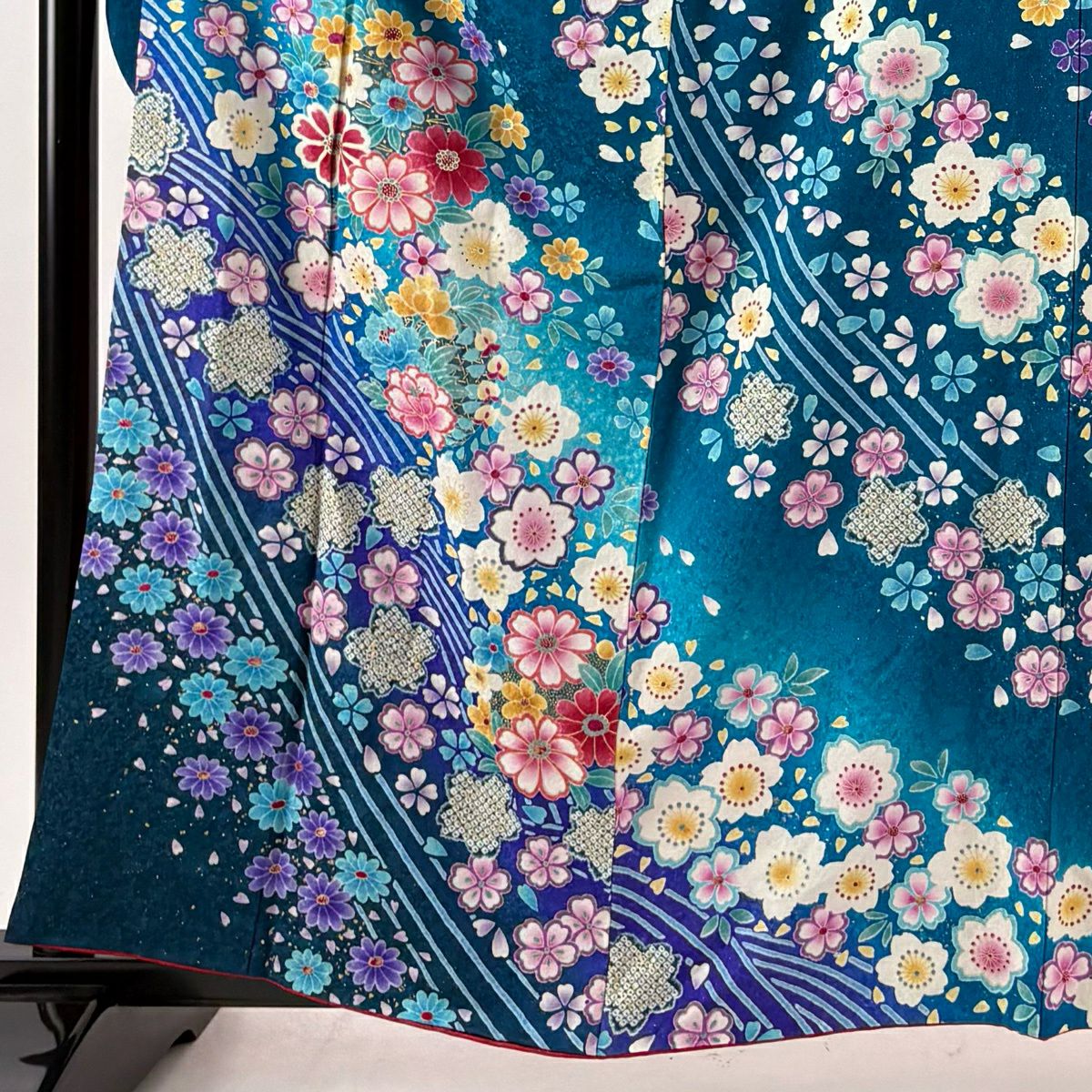 40%OFF 振袖 身丈159.5cm 裄丈66cm M 袷 草花 波 銀通し 金彩 青緑 正絹 逸品 K30