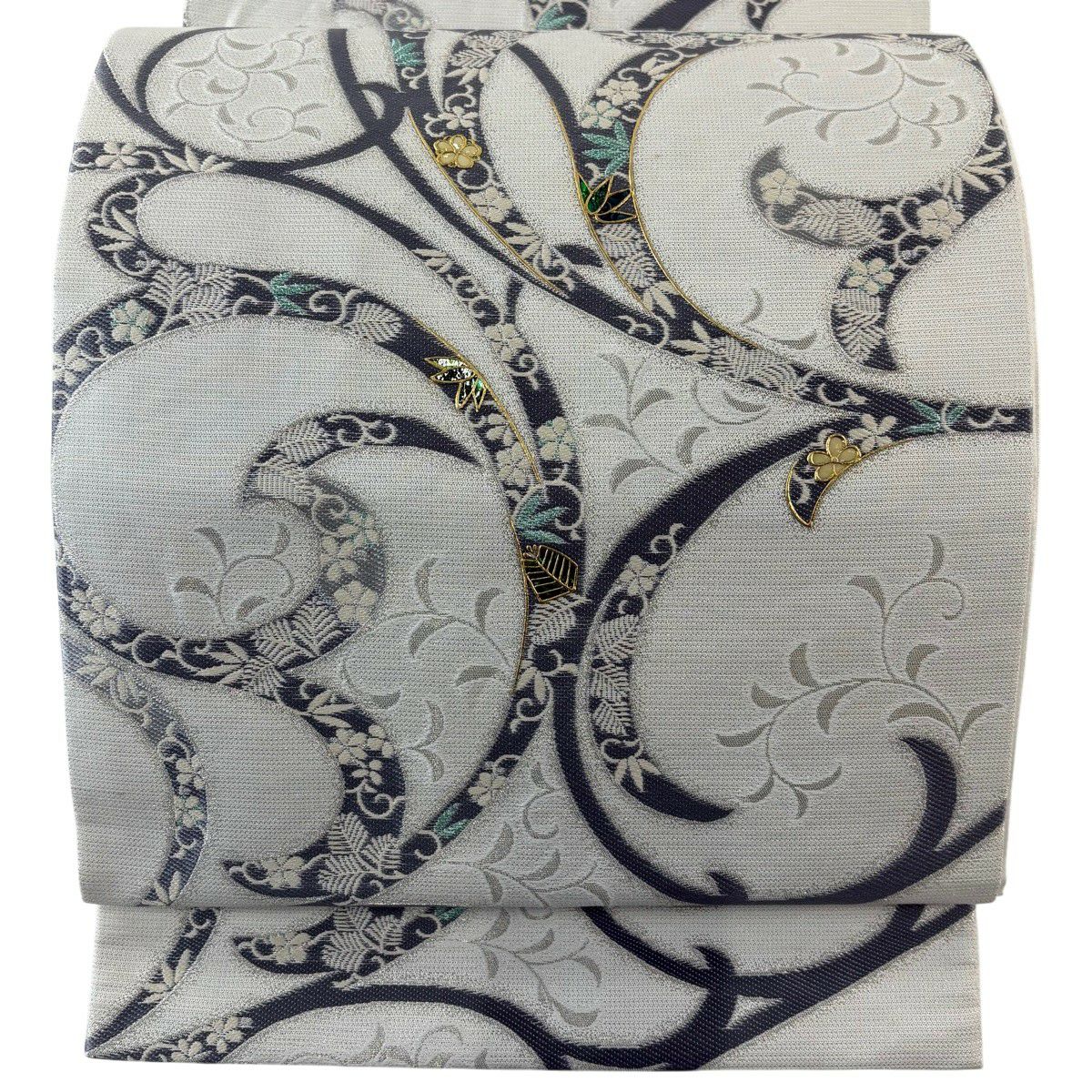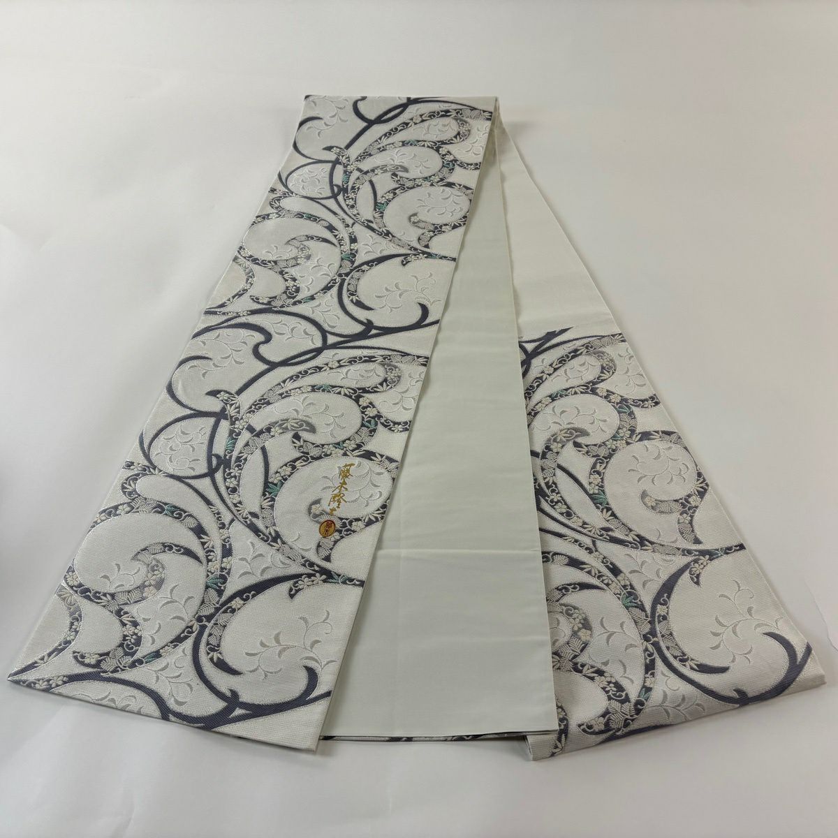 40%OFF 【美品】 袋帯 逸品 藤本隆士 落款あり 唐草 松竹梅 螺鈿 銀糸 白 お太鼓柄 正絹 K30