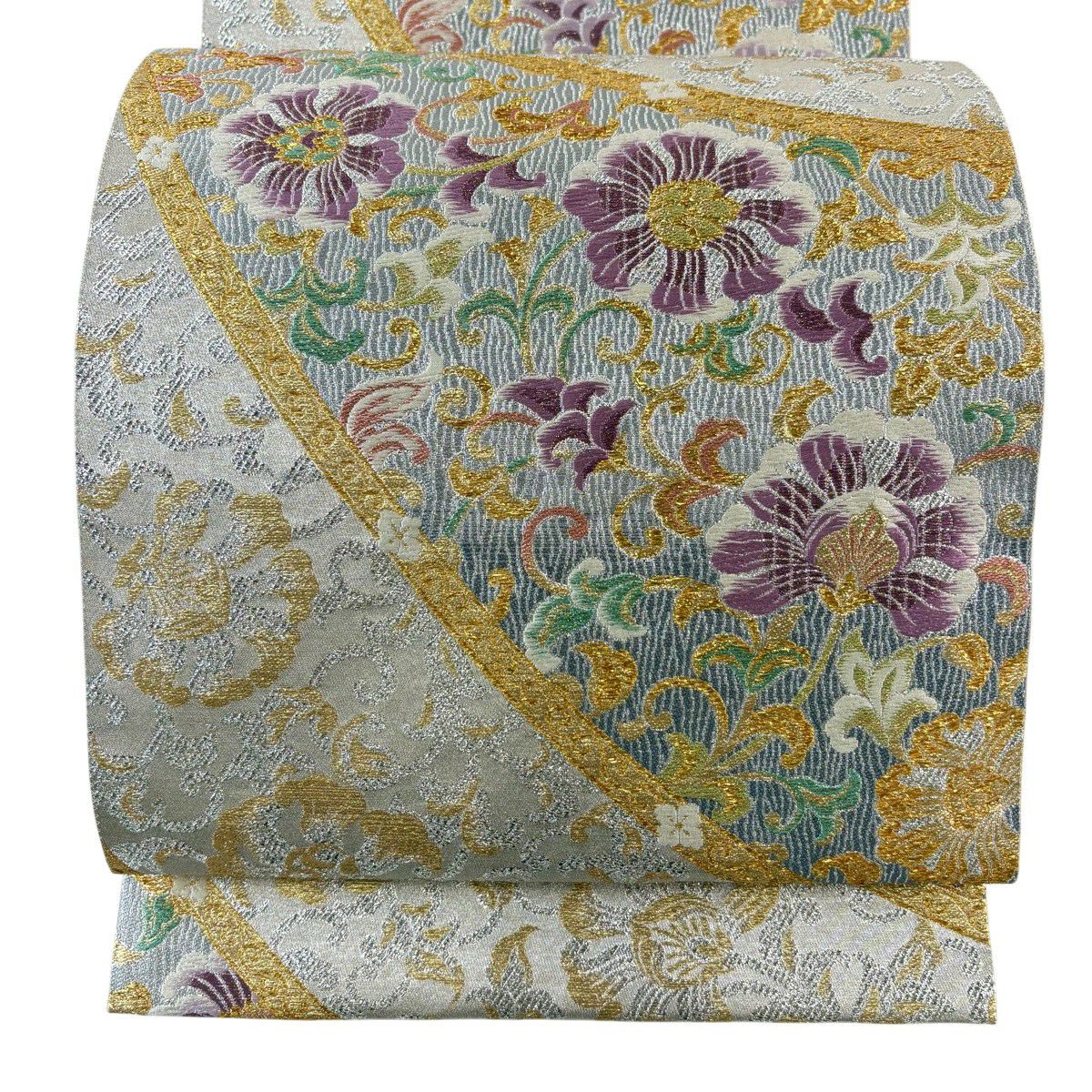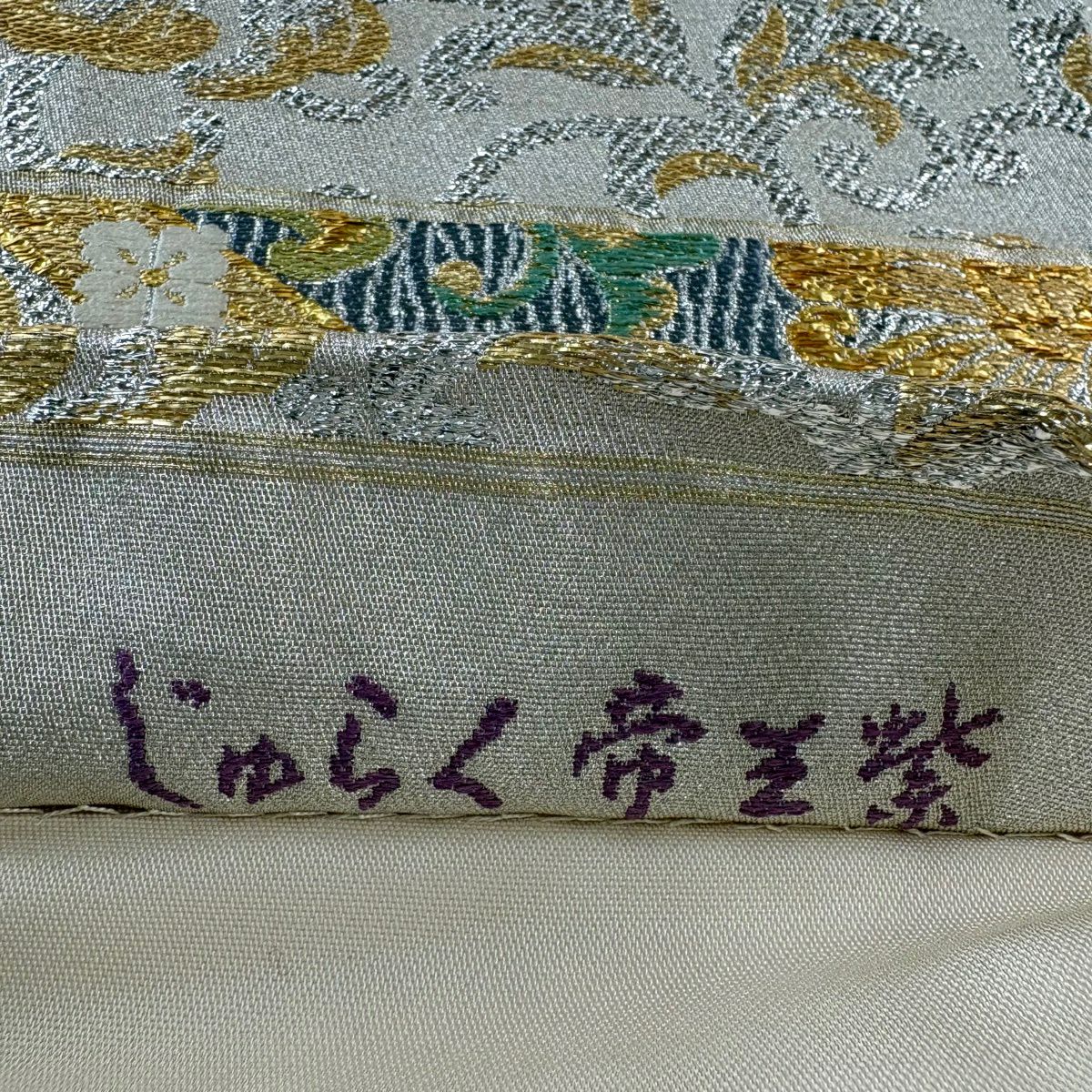 20%OFF 【美品】 袋帯 逸品 じゅらく 落款あり 帝王紫 花唐草 箔 ベージュ 六通 正絹 K30