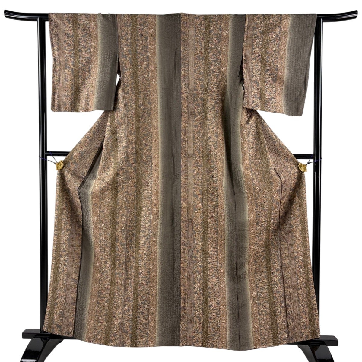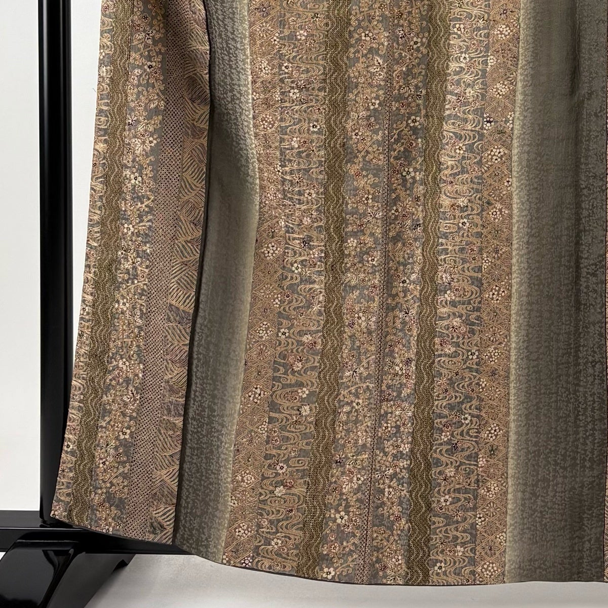 【美品】 小紋 身丈162cm 裄丈62cm S 袷 花 縦縞 刺繍 ぼかし 茶緑色 正絹 逸品