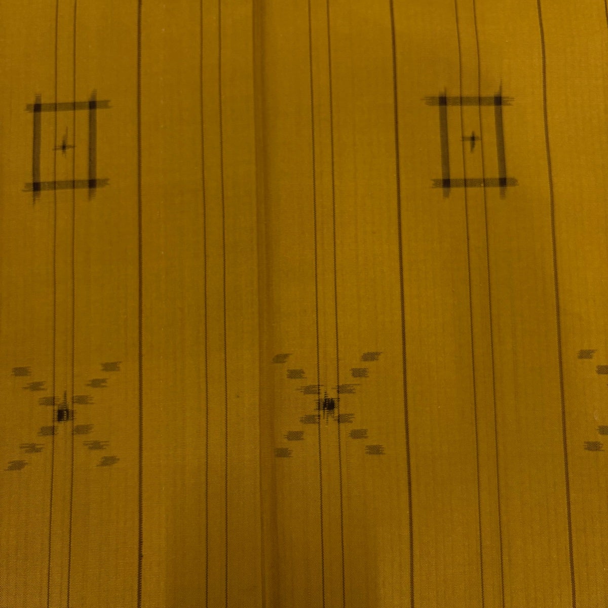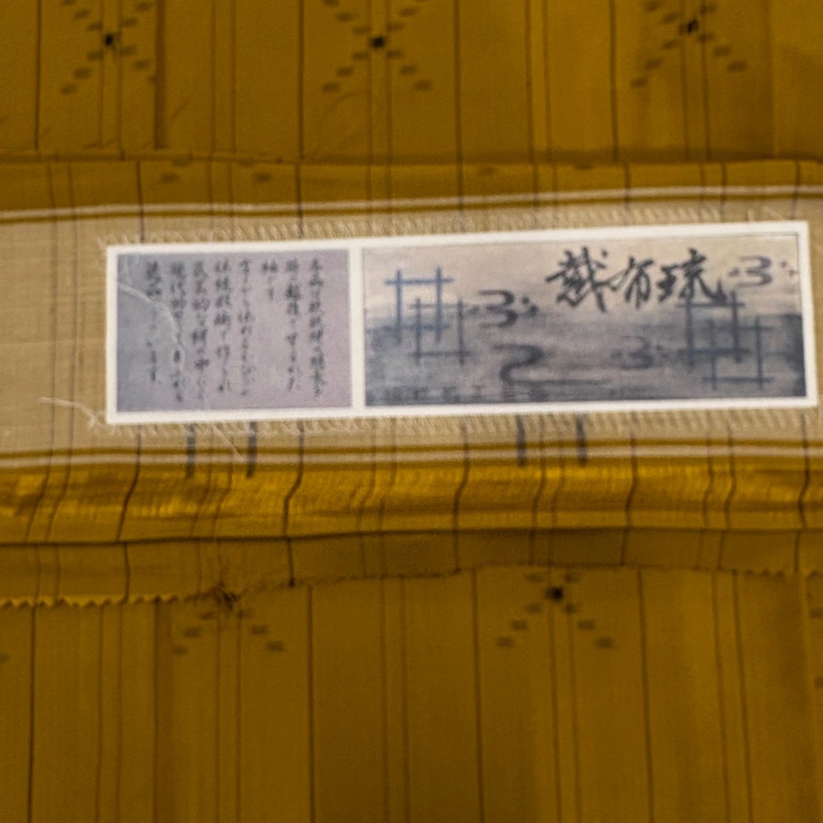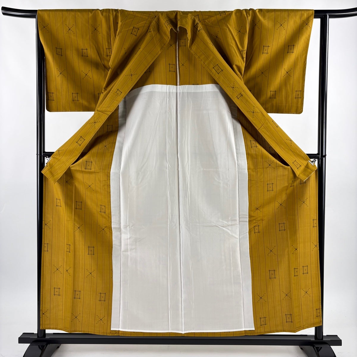 紬 身丈158cm 裄丈64cm M 単衣 越布琉 証紙あり 縦縞 幾何学 山吹色 正絹 逸品