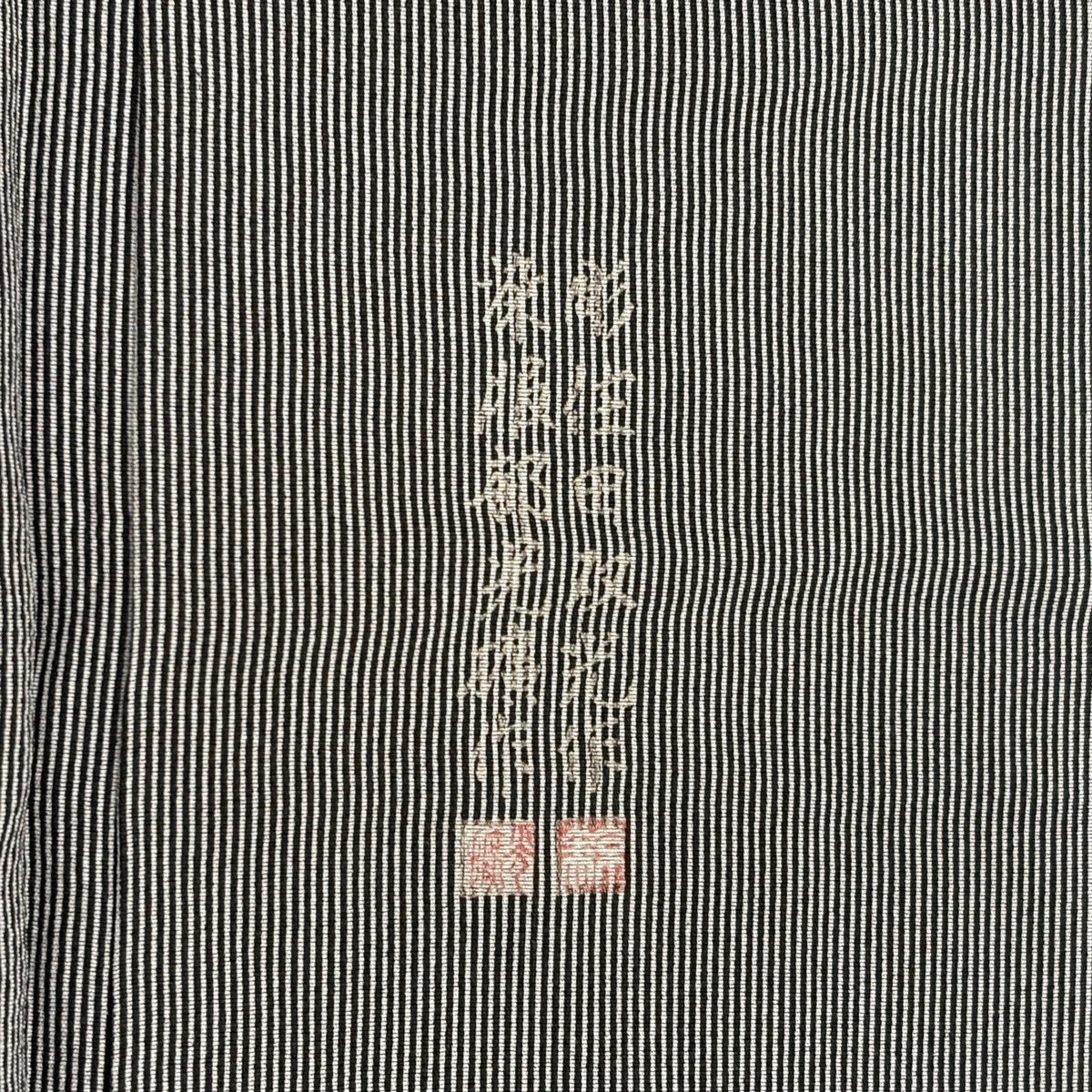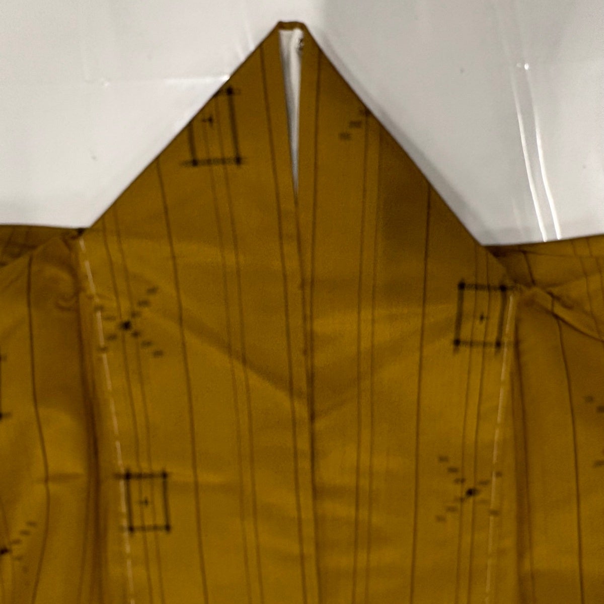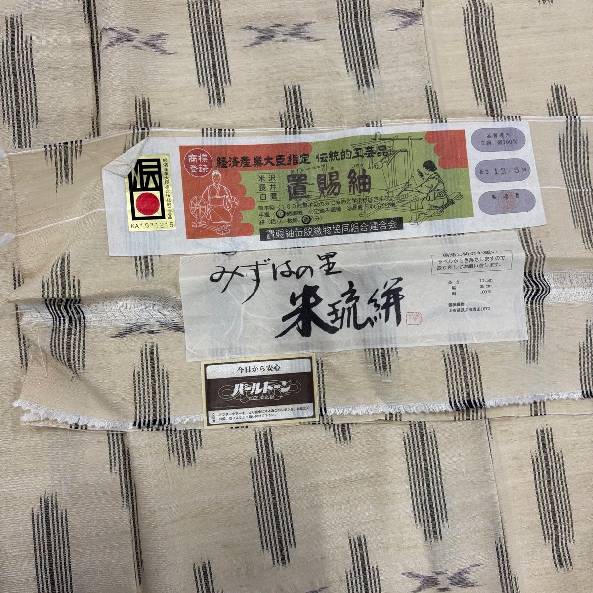 紬 身丈158cm 裄丈64cm M 単衣 越布琉 証紙あり 縦縞 幾何学 山吹色 正絹 逸品