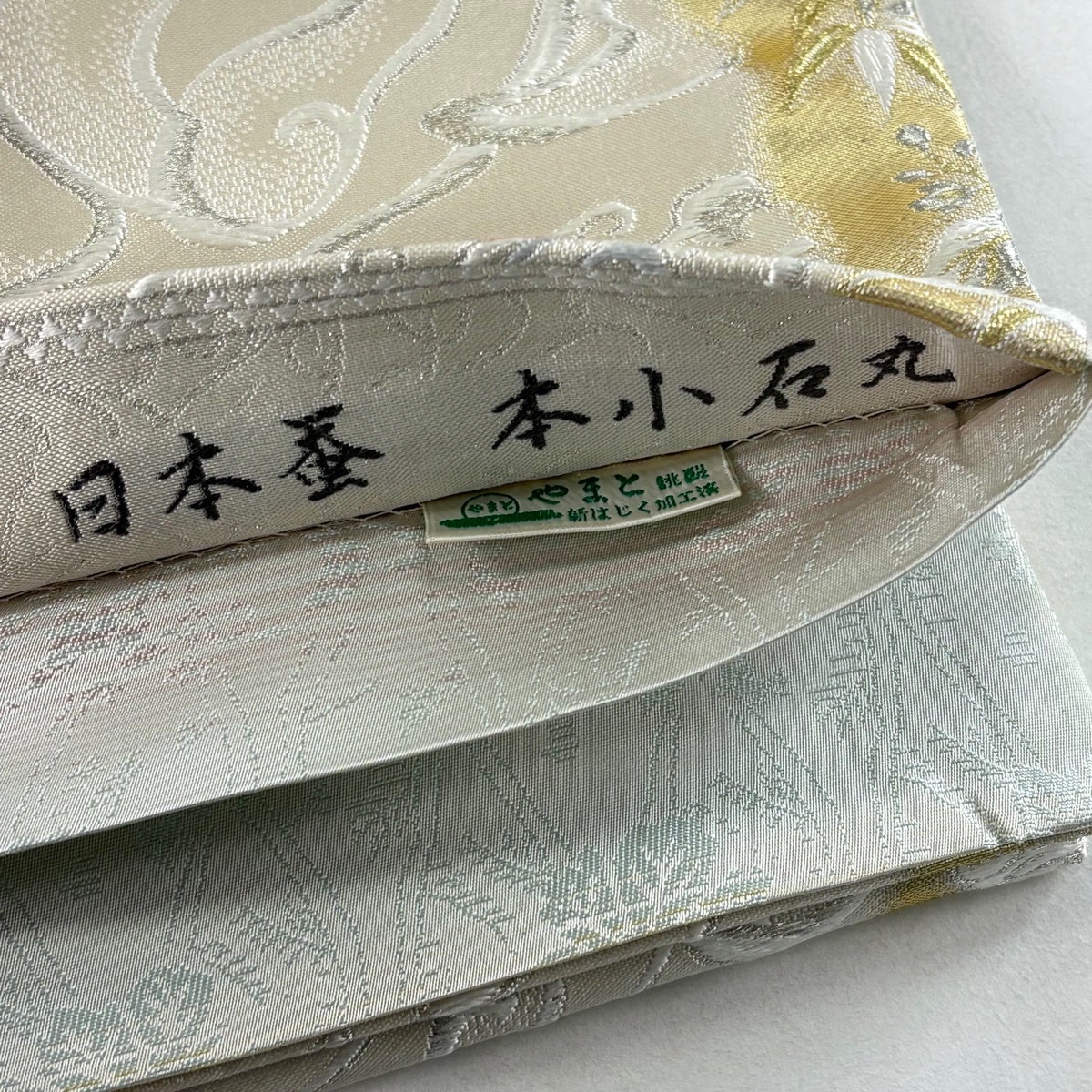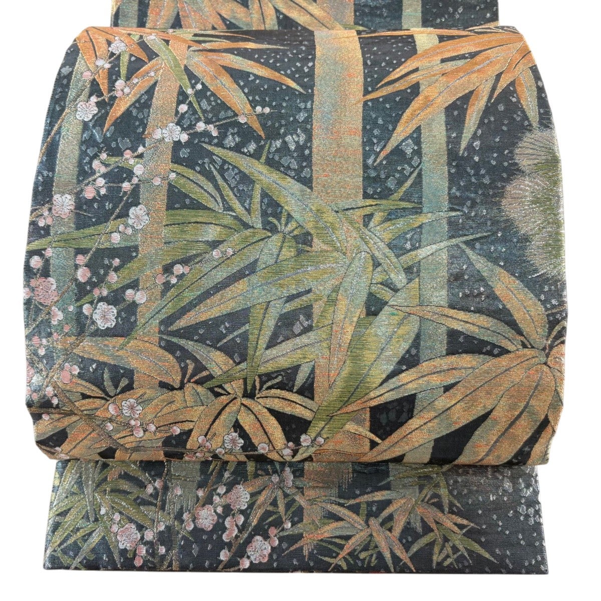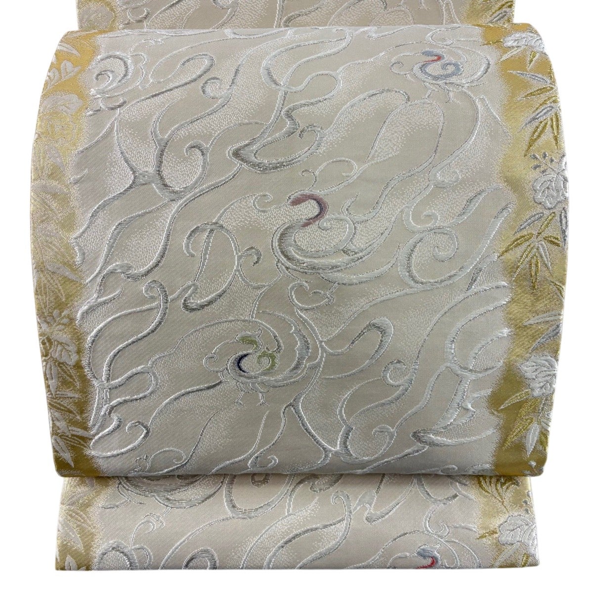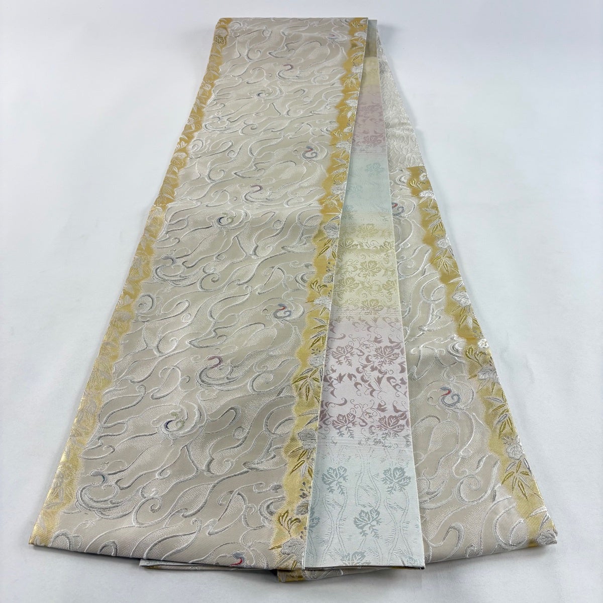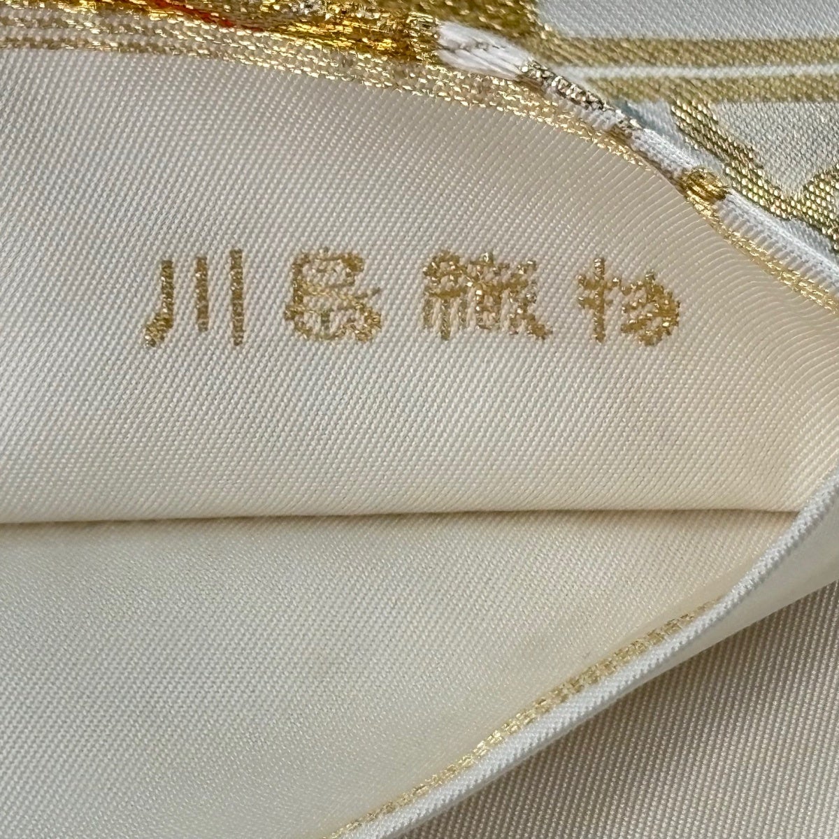 【美品】 袋帯 逸品 河村織物 落款あり 雅宴春秋絵巻 桜 流水 金銀糸 箔 金色 六通 正絹